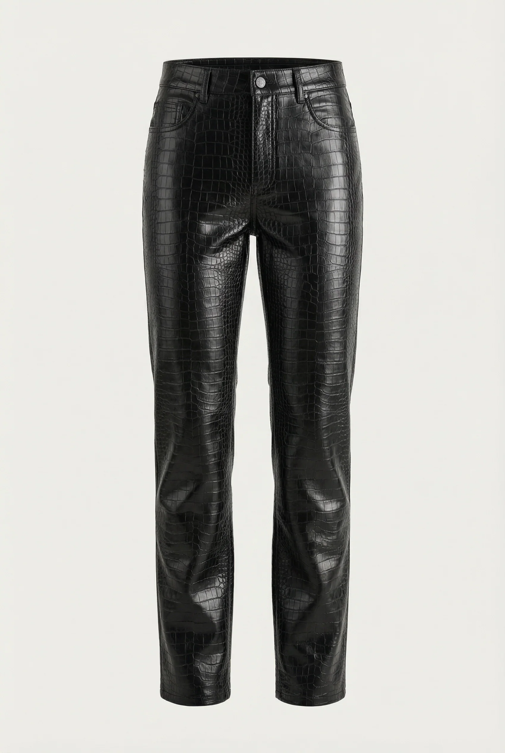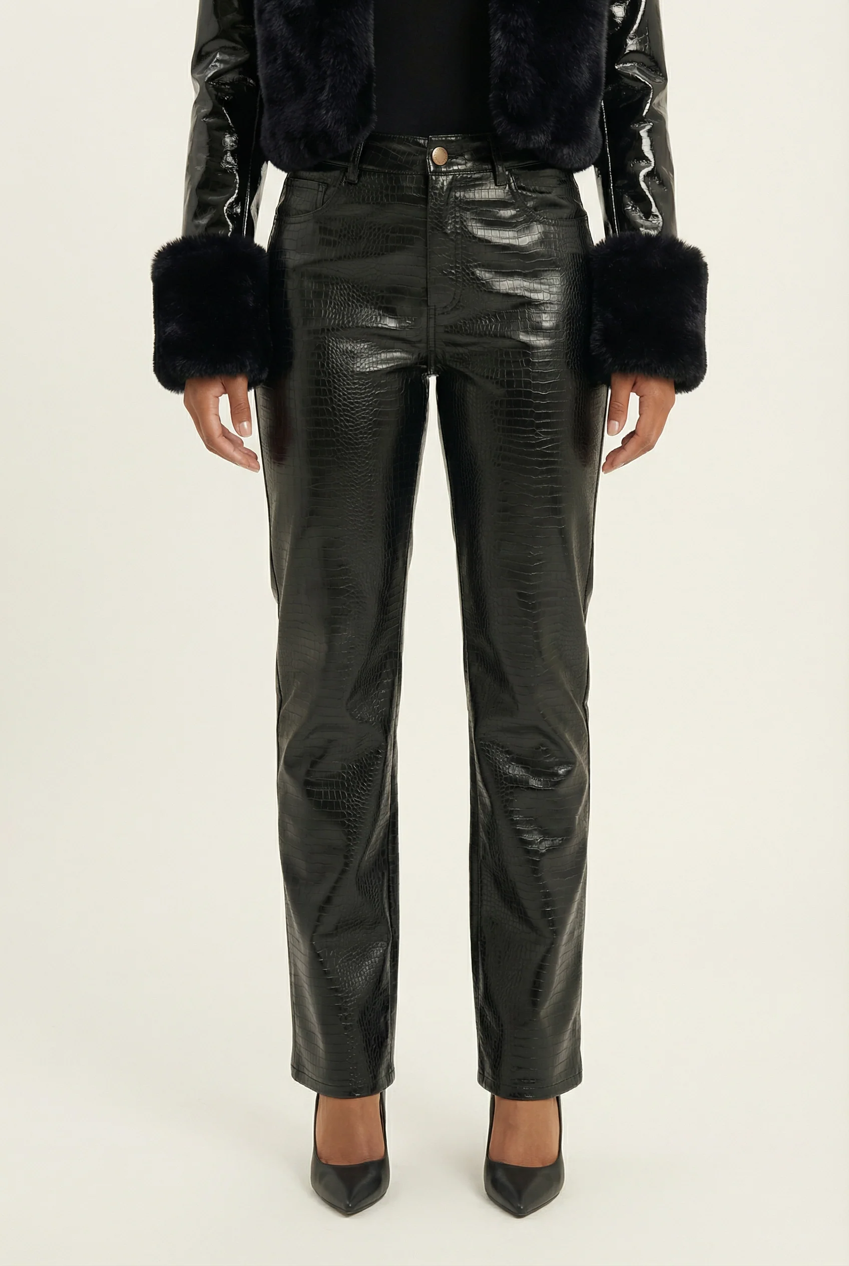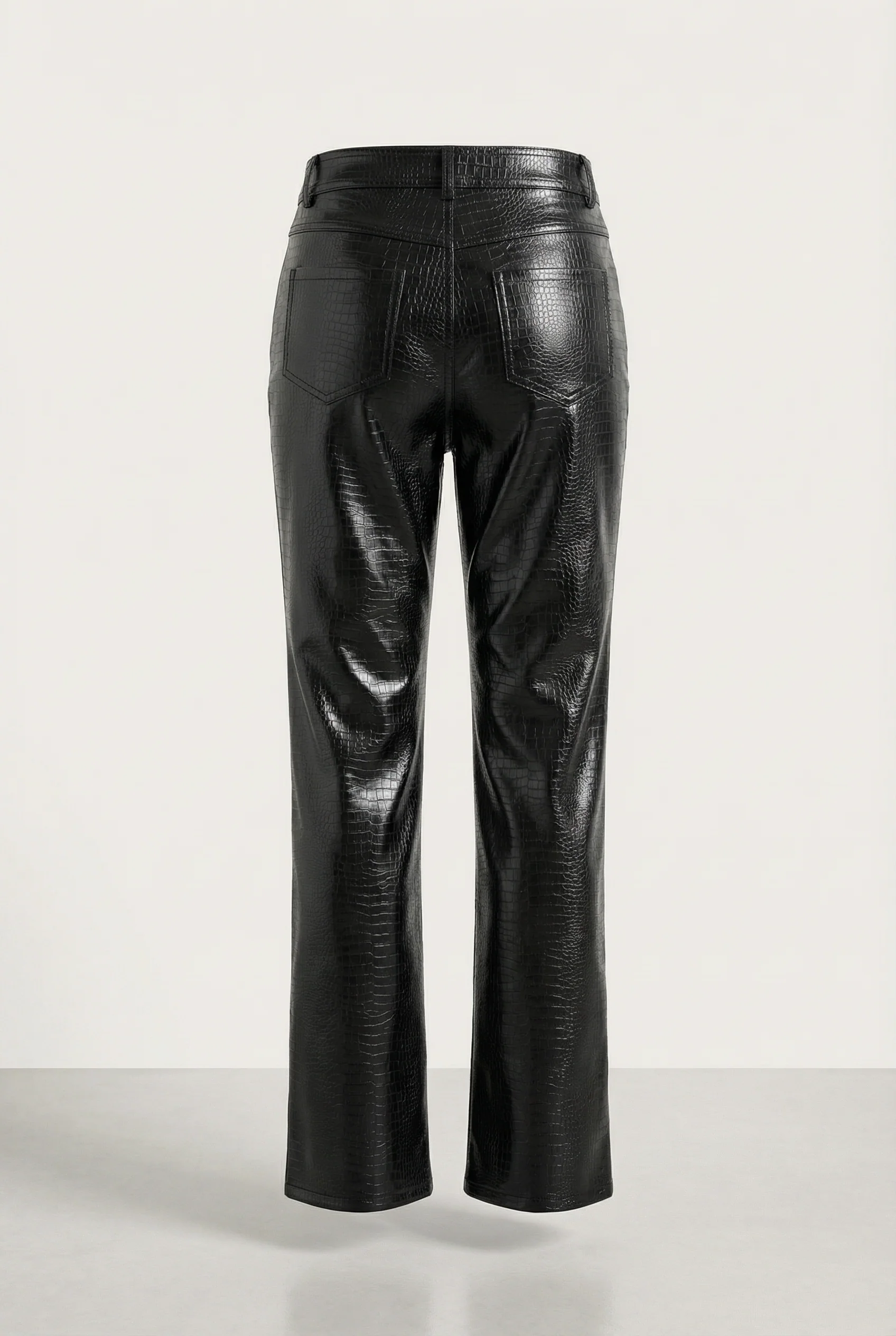 Le pantalon Alba signe l’allure “Ladies in Paris” avec une ligne nette et une texture qui capte la lumière. Sa coupe droite structure la jambe et étire la silhouette sans effort. La taille mi-haute équilibre les proportions et permet de le porter aussi bien avec un haut près du corps qu’avec un blazer long. La matière en PU embossé effet croco apporte du relief et un côté très mode, sans en faire trop.