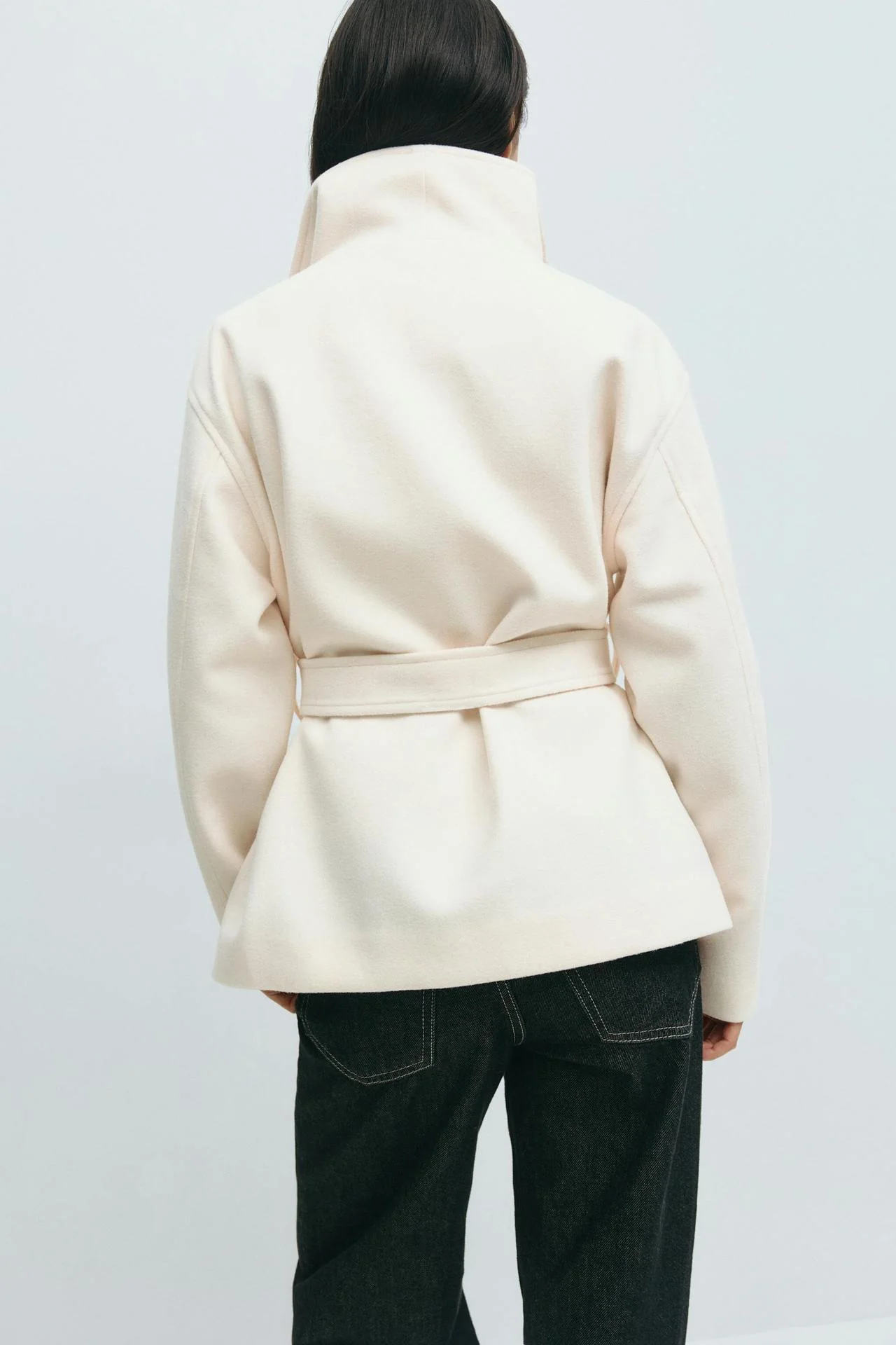 Ici, tout est pensé pour équilibrer volume et ligne. La coupe regular donne de la tenue, et la ceinture permet d’ajuster l’allure : plus marquée à la taille ou plus droite selon le serrage. Le col V allonge visuellement le haut du buste, et le grand col apporte une touche structurée. Un manteau simple sur le papier, mais très efficace une fois porté.
