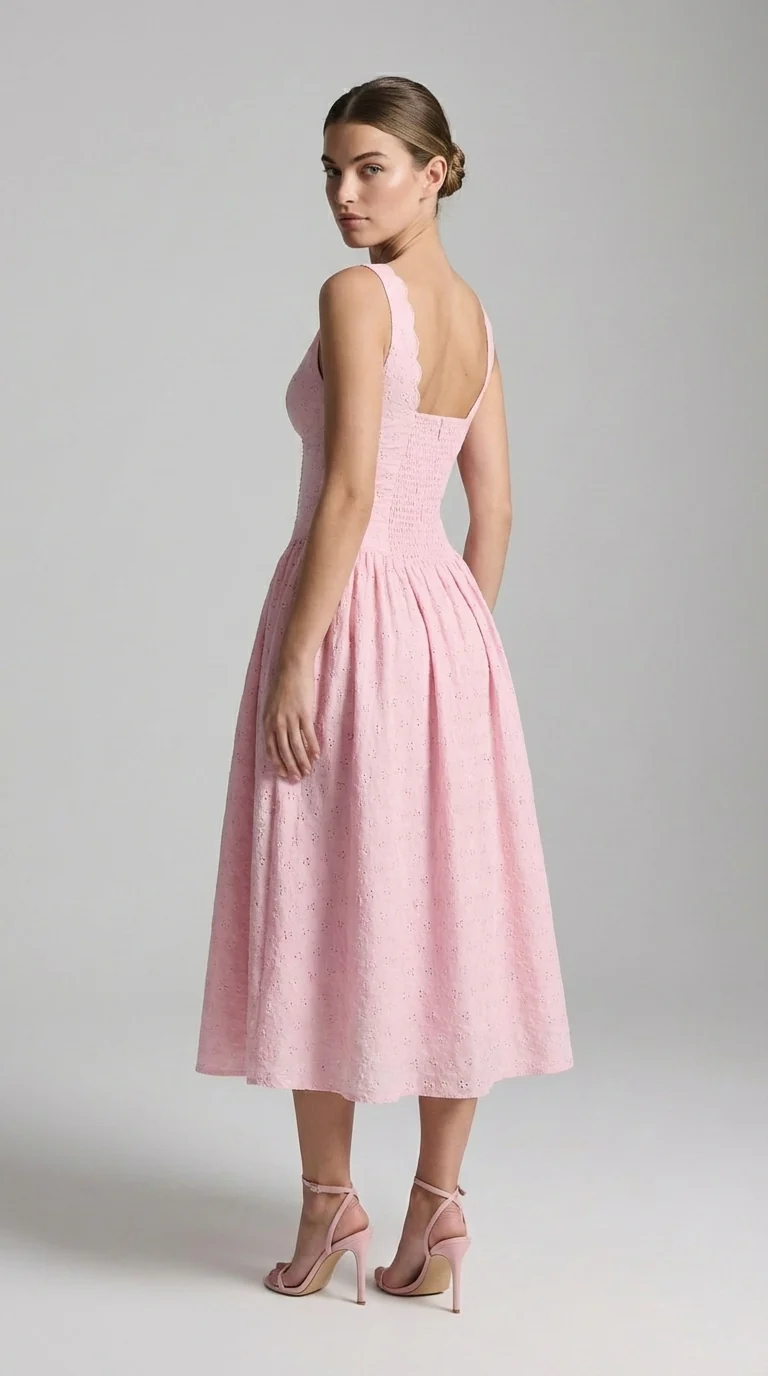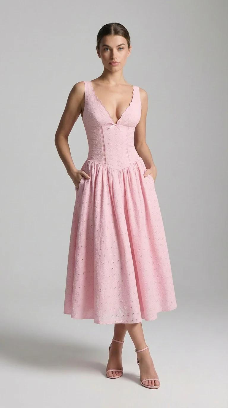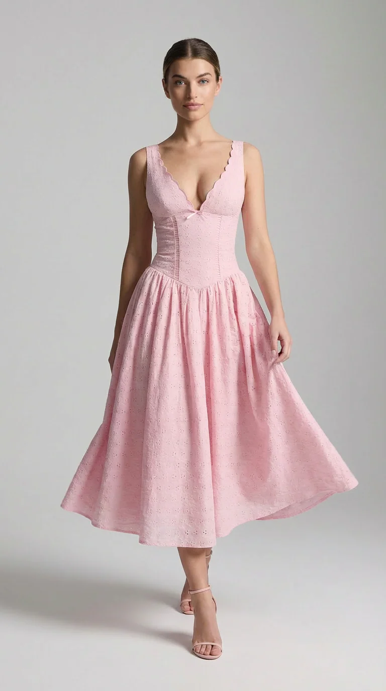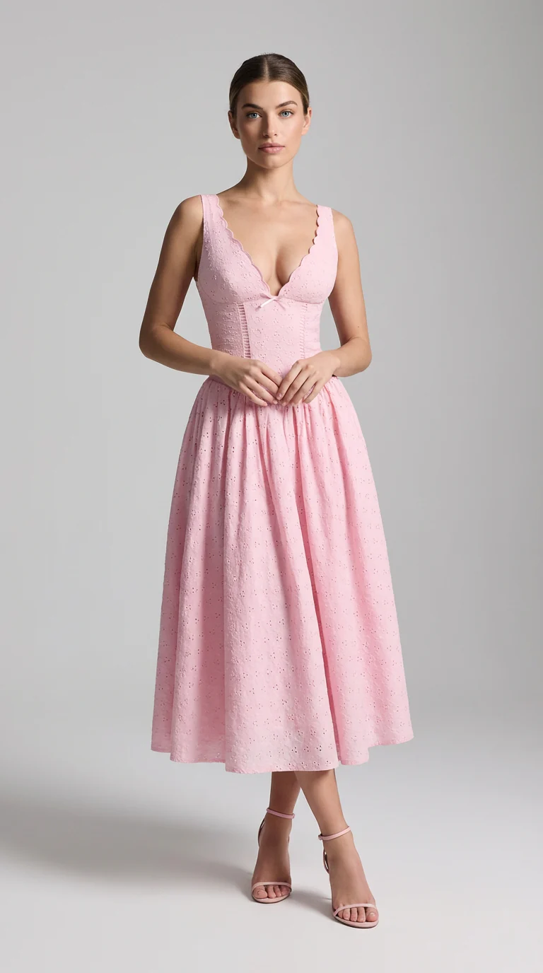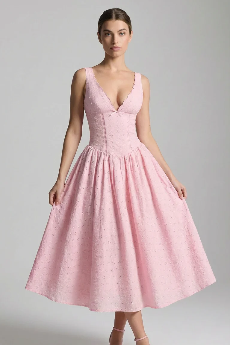 La robe Althea capture cette douceur intemporelle avec une grâce d’un autre temps. Son bustier corseté sculpte la silhouette avec justesse, tandis que l’échancrure en cœur rehaussée de bordures festonnées évoque un charme délicatement rétro. La jupe s’épanouit en corolle généreuse, brodée d’œillets subtils, dans un volume léger et aérien.