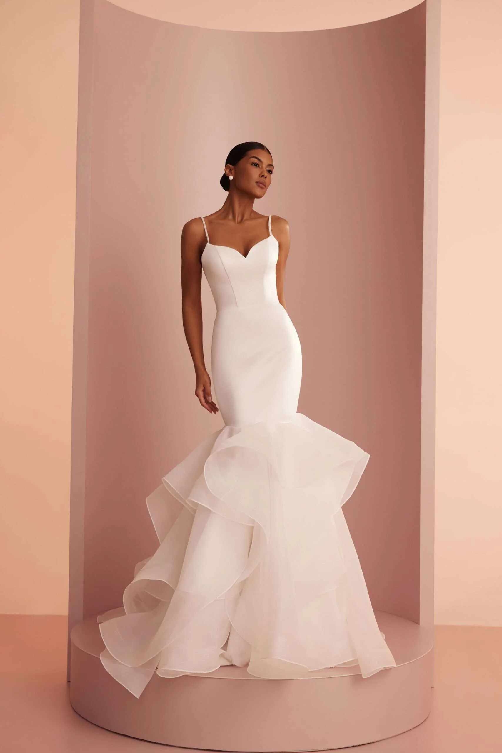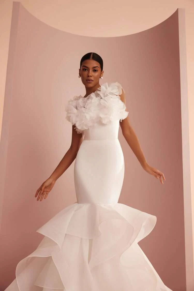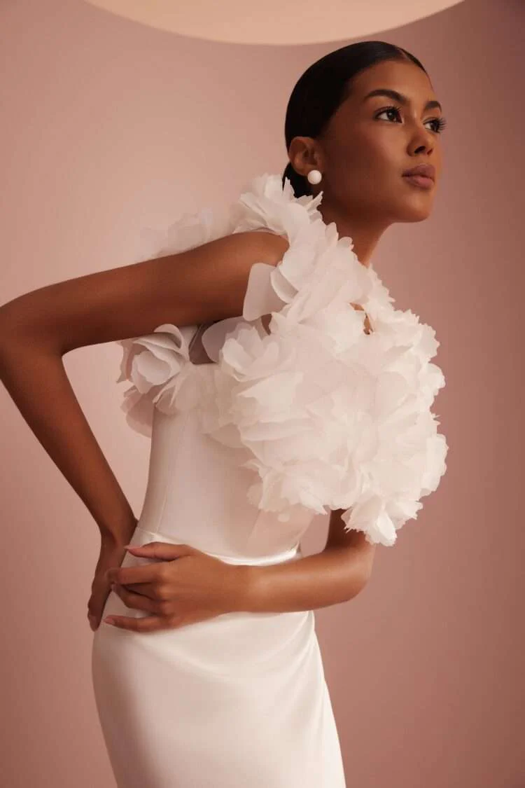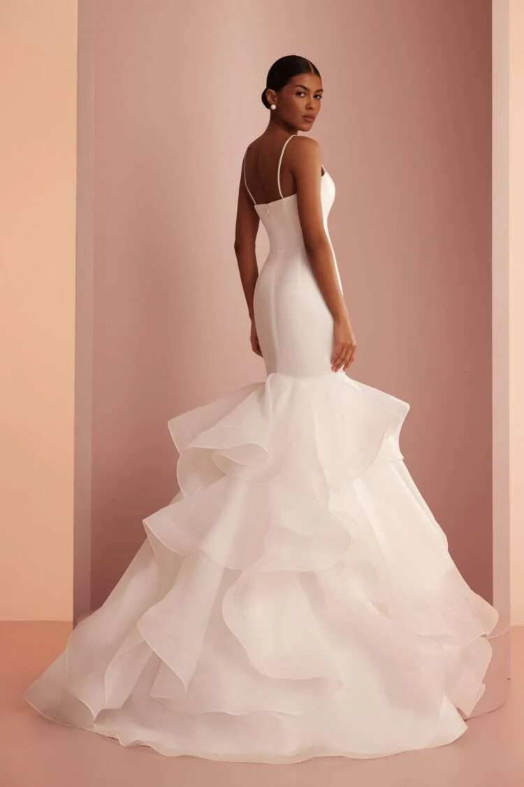 Conseil de style : Portez cette robe avec des bijoux minimalistes et un chignon élégant pour mettre en valeur le design sophistiqué des volants. Des escarpins en satin ou métallisés compléteront parfaitement ce look de mariée audacieuse.