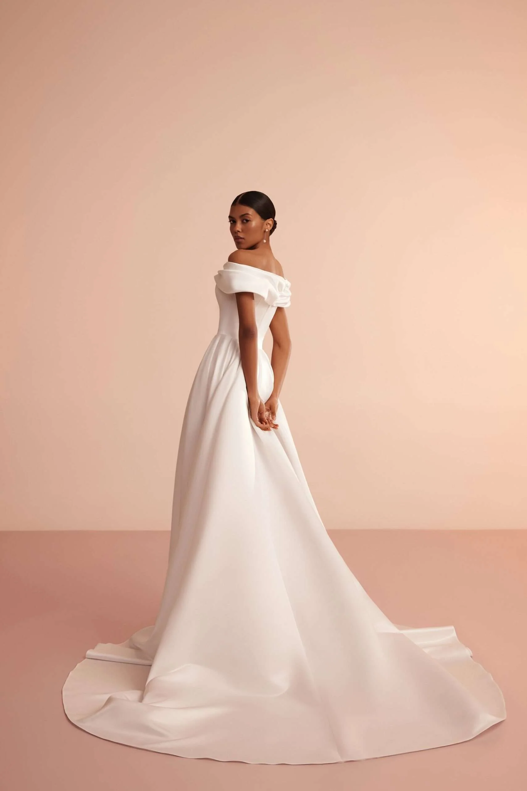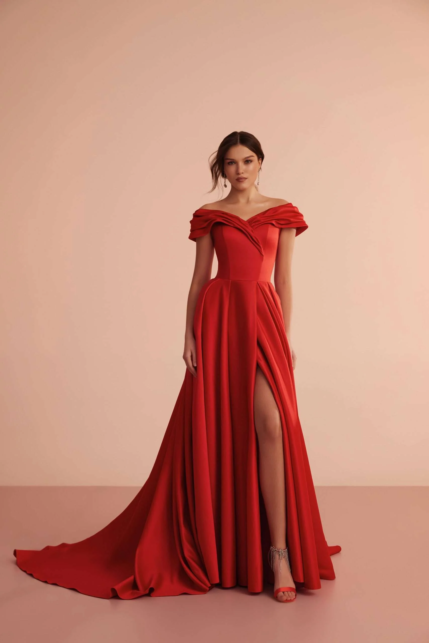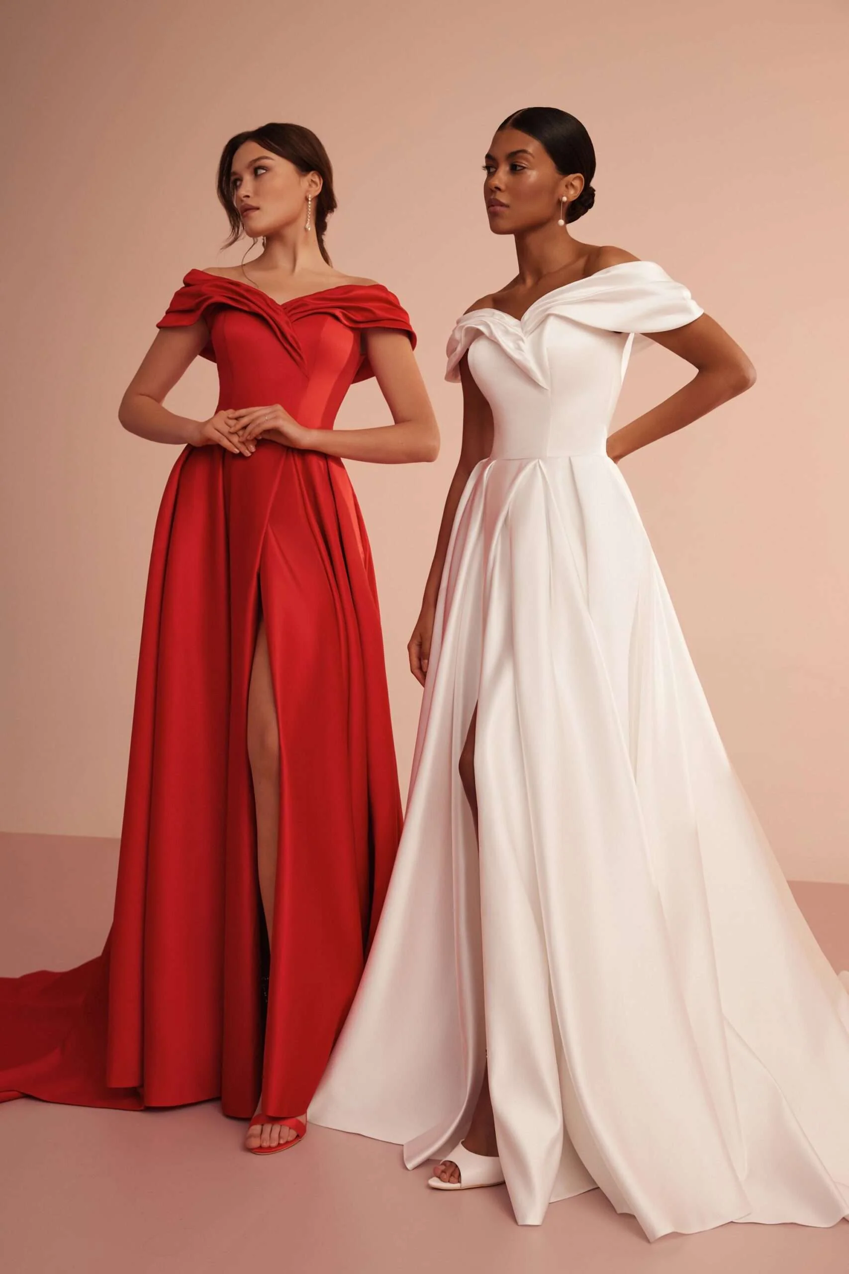 Faites sensation avec cette robe de mariée ou de soirée sophistiquée à épaules dénudées. Le corsage drapé flatte magnifiquement le décolleté, tandis que la jupe longue et fluide révèle une fente audacieuse sur le devant, ajoutant un élément dramatique et sensuel. Sa coupe structurée met en valeur la silhouette tout en permettant une liberté de mouvement optimale. Disponible en ivoire pour un look classique et en rouge pour un effet saisissant, cette robe est idéale pour des occasions spéciales.