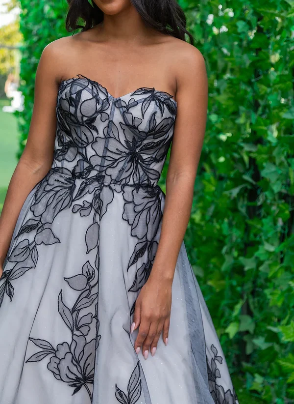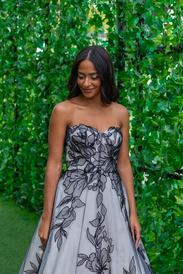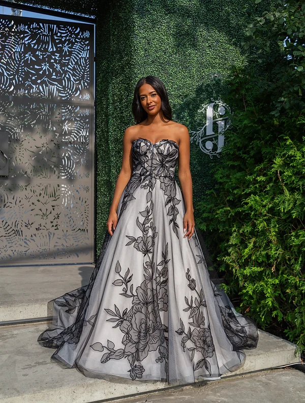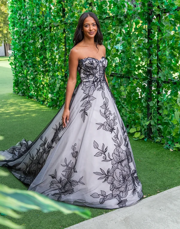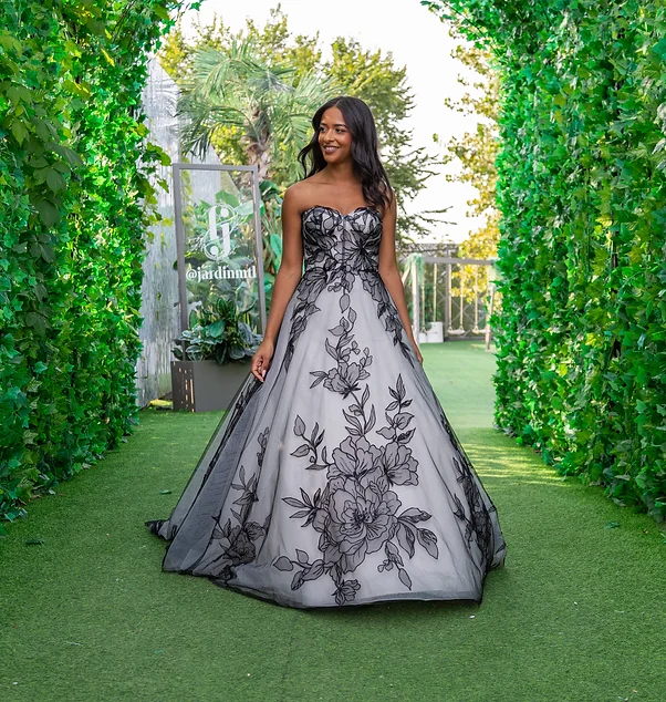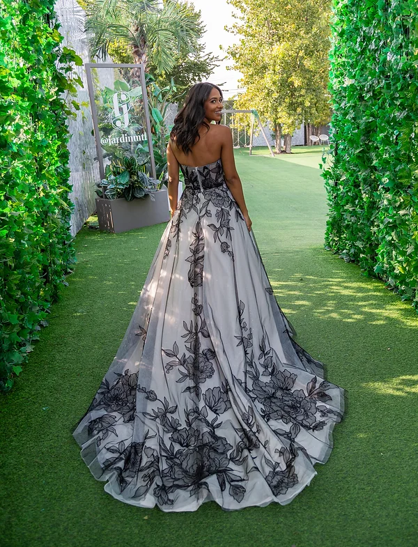 Description du produit : Cette somptueuse robe de bal est un véritable chef-d’œuvre de haute couture. Avec son bustier sans bretelles et sa jupe volumineuse ornée de magnifiques broderies florales noires, cette robe allie élégance et originalité. La jupe, qui s’étend en une longue traîne, apporte une touche dramatique, idéale pour les occasions spéciales. Conçue pour sublimer la silhouette, cette robe est parfaite pour celles qui souhaitent faire une entrée inoubliable.