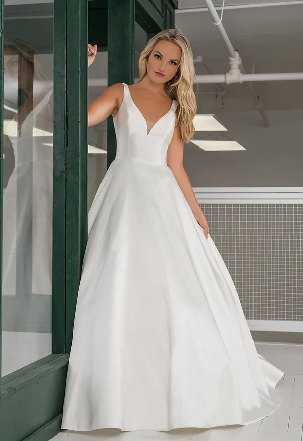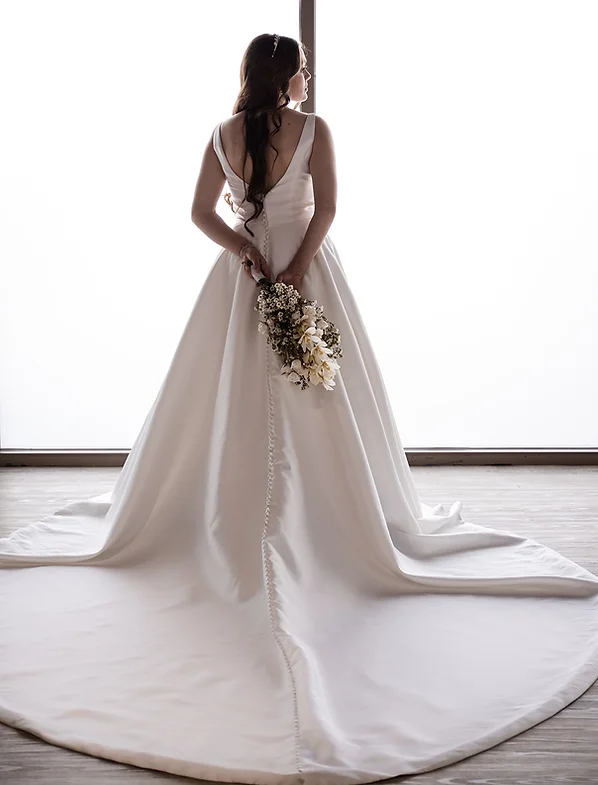 La robe BL350 incarne une allure royale grâce à son tissu en mikado de soie luxueux, sa silhouette épurée et sa structure impeccable. Le corsage ajusté met en valeur un décolleté en V audacieux souligné d’une discrète découpe en tulle au centre, ajoutant une touche contemporaine et raffinée. Les poches cachées dans la jupe offrent confort et fonctionnalité, tandis qu’une élégante rangée de boutons s’étend du dos jusqu’au bout de la traîne, apportant une finition majestueuse.