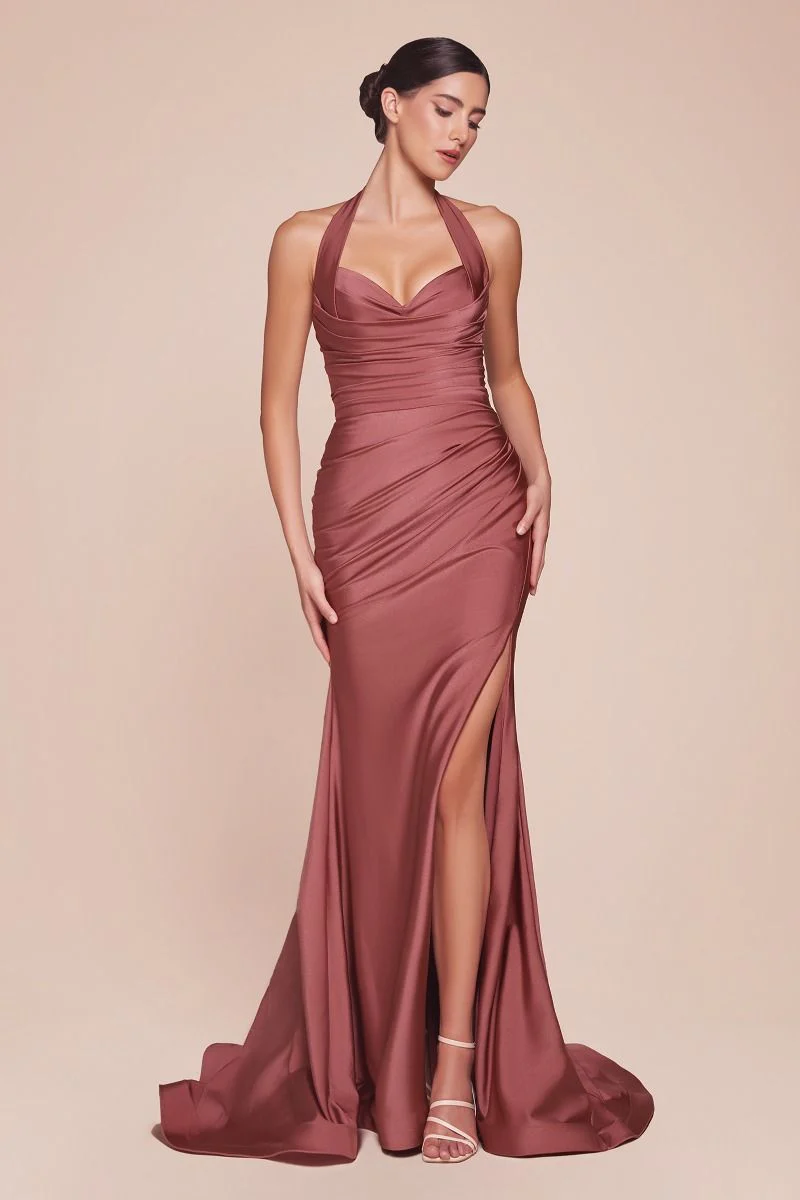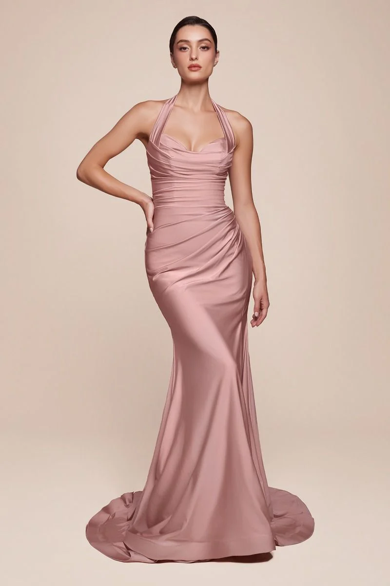 La robe Barbara est une pièce sophistiquée qui allie une silhouette sirène parfaitement ajustée à un décolleté drapé et flatteur. Son design à encolure américaine (halter) met en valeur les épaules tandis que la fente haute sur la jambe ajoute une touche sensuelle. Confectionnée dans un satin fluide, elle épouse les formes avec élégance et brille subtilement à chaque mouvement.
