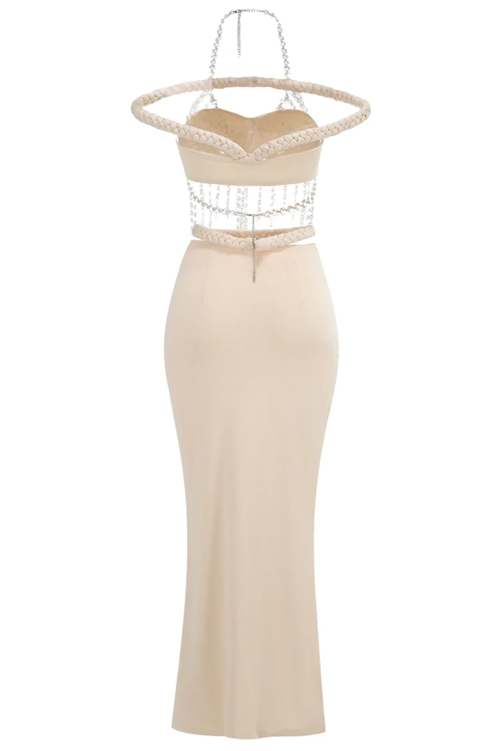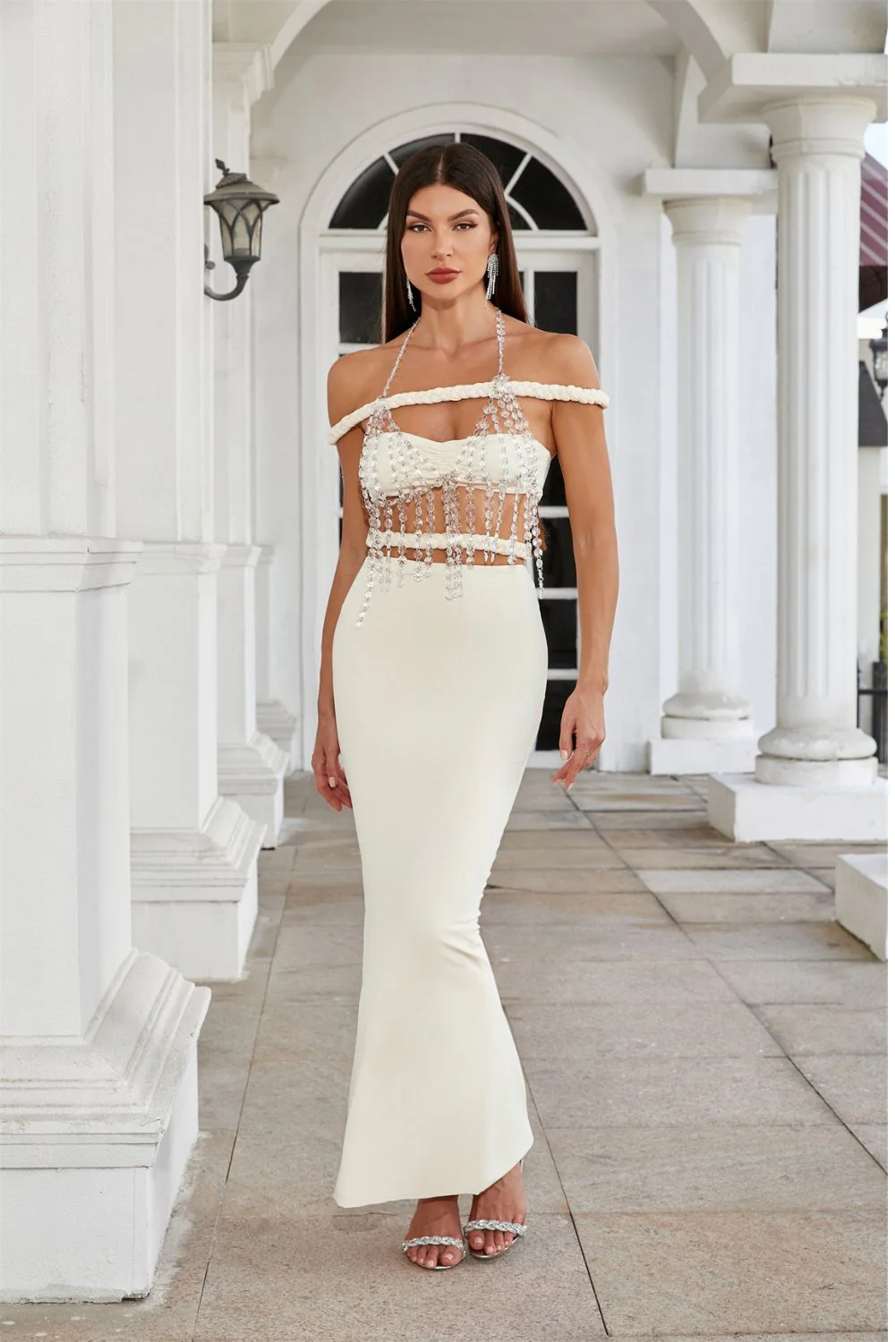 Éclatante et sculpturale, Bianca mêle sensualité et raffinement. Sa coupe sirène souligne les courbes, tandis que les cristaux perlés suspendus subliment le buste. Les épaules dénudées et le dos croisé révèlent une allure bijou, lumineuse et audacieuse.