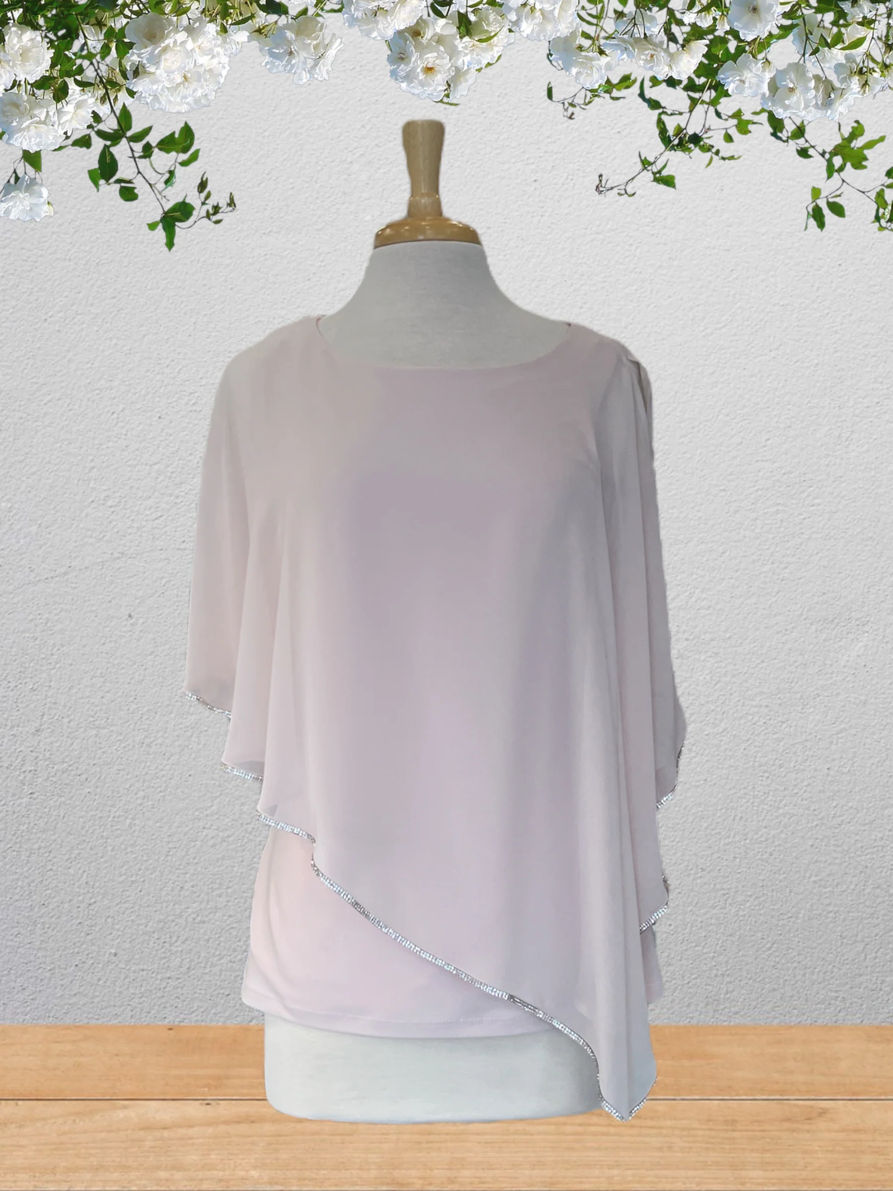 Description: Que vous portez un »jean’s », un pantalon élégant ou une jupe, ce haut vous premet d’être distingué tout en étant confortable. Haut en jersey avec superposition en mousseline garnie de strass.