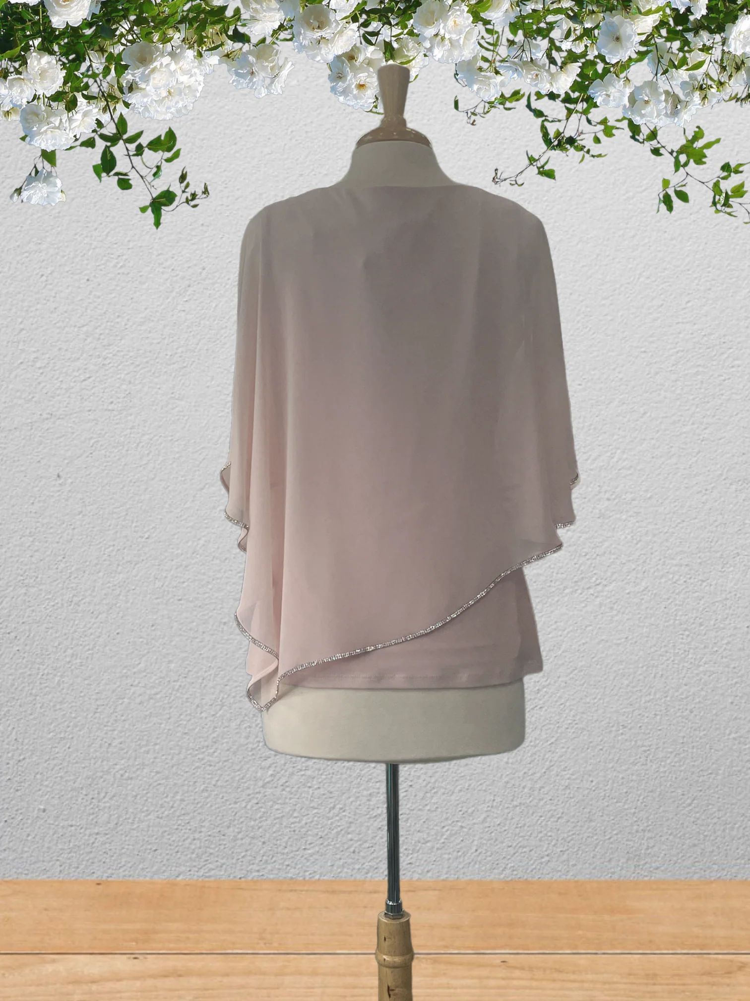 Détails: Haut sans manches avec châle intérgré qui cahche les épaules. Bras ouvert et strass au contour du bas. |