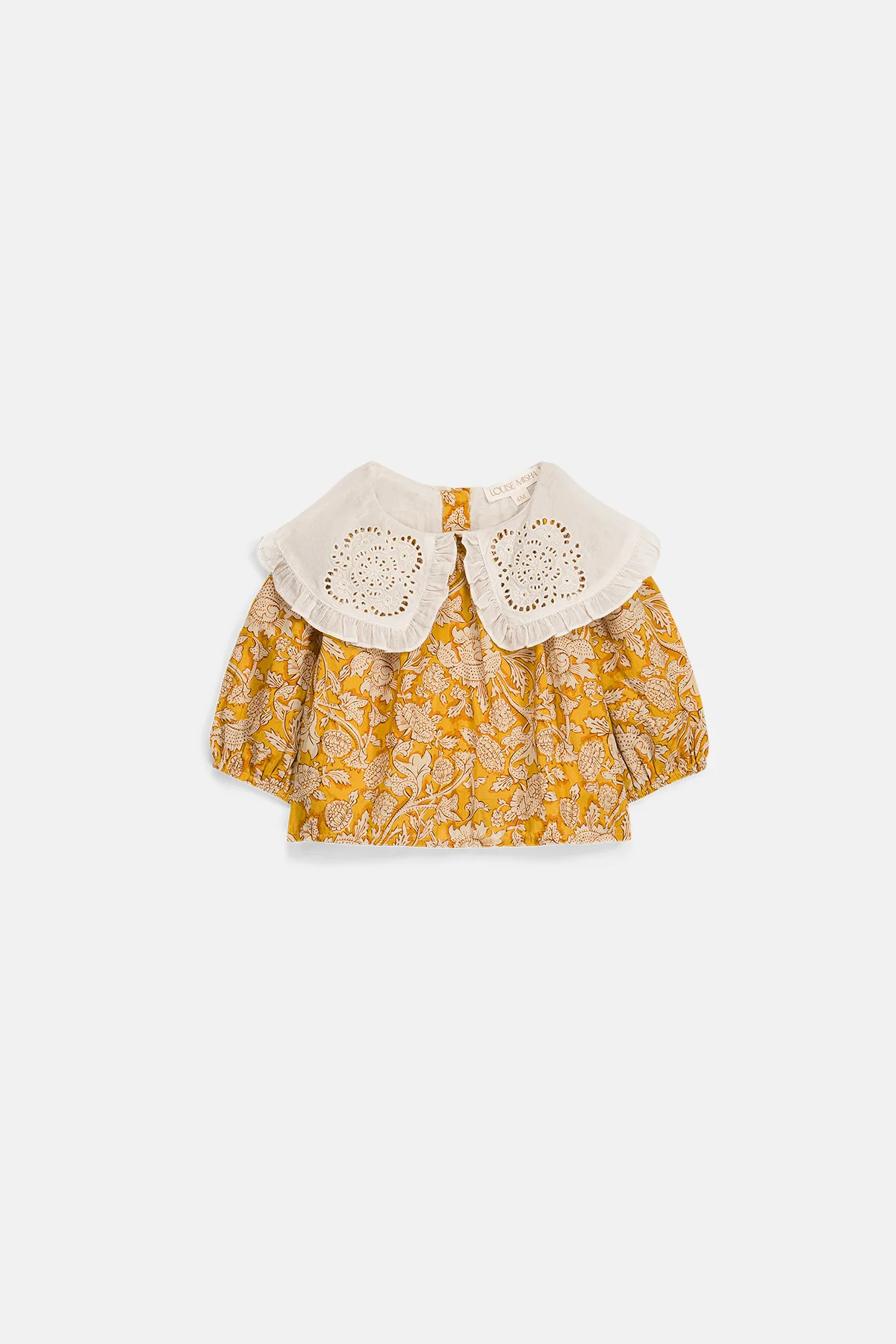 - Grand col volanté en voile de coton avec broderies ajourées.