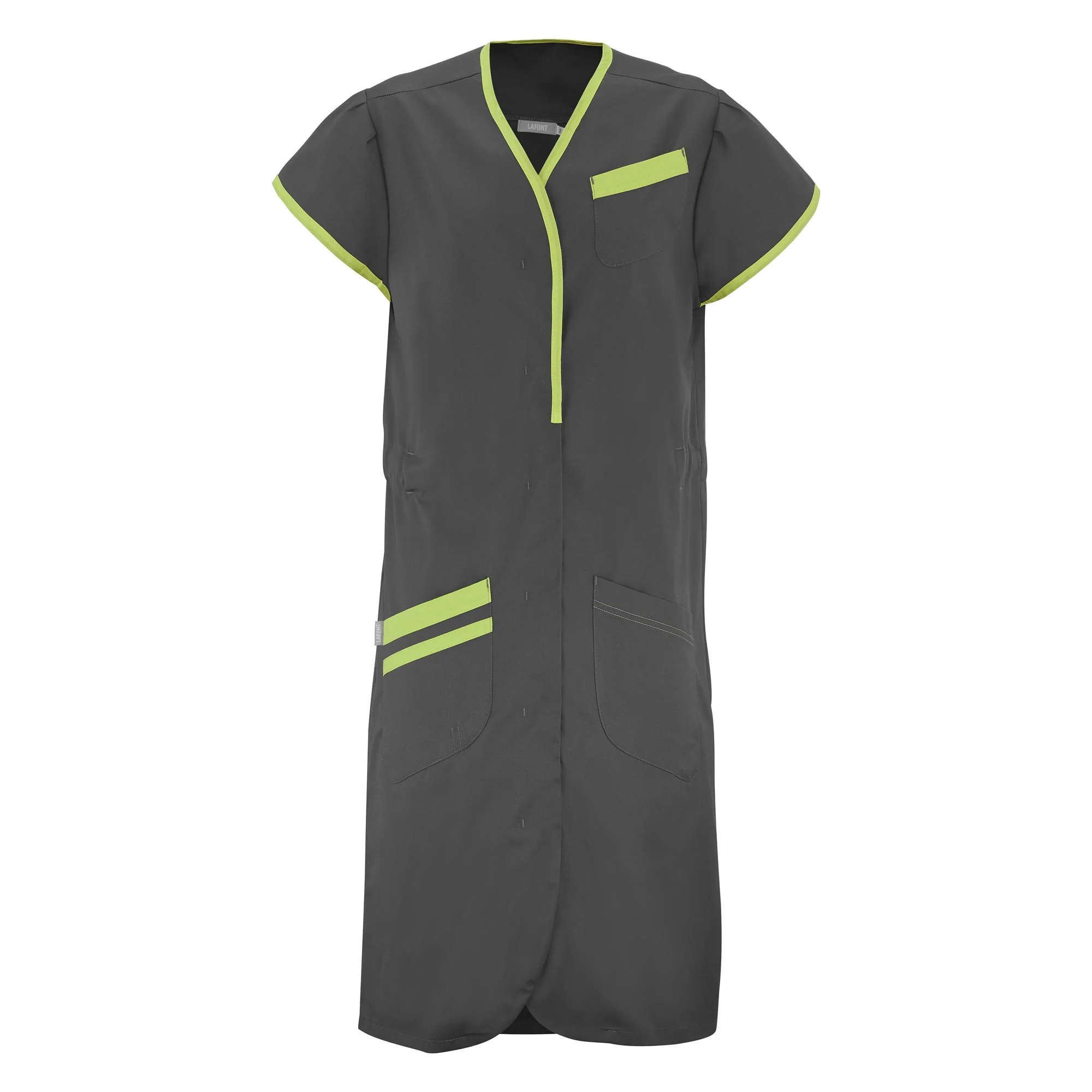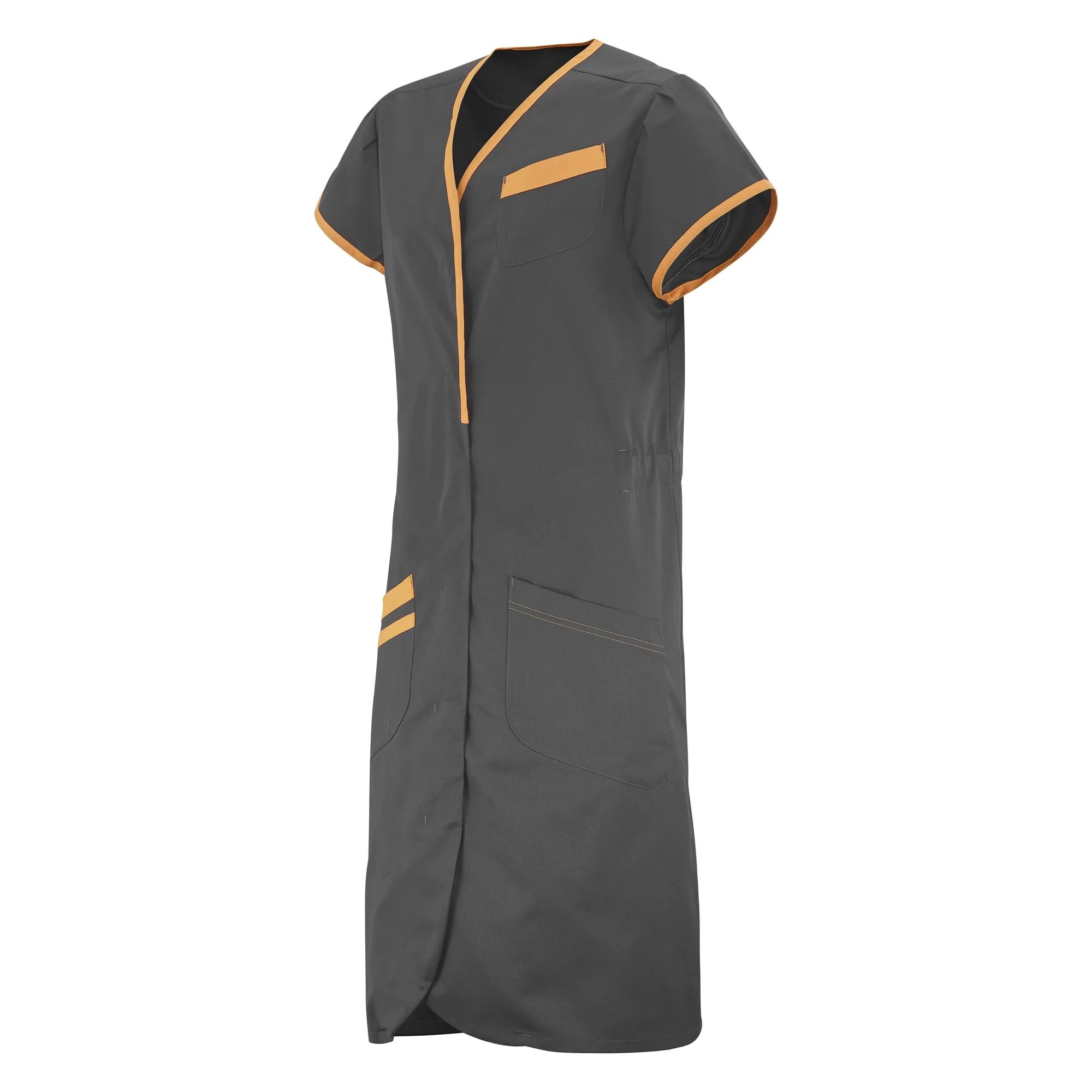 Blouse de travail moderne pour les personnes travaillant dans le domaine médical, paramédical ou pharmaceutique. Confectionnée dans un textile Sergé 50% polyester 50% coton 180 gr, la blouse professionnelle mixte Daphnée est souple et agréable à porter. Elle possède une encolure en V et sa fermeture par grippers permet de se changer rapidement. Cette blouse médicale à manches courtes facilite les gestes professionnels quotidiens tout en assurant un bon maintien grâce à sa taille élastiquée. Pratique et fonctionnelle, elle est pourvue de 2 poches basses et d’une poche poitrine pour stylo ou porte-bip. Ce modèle de blouse mixte est disponible en 7 coloris, avec une finition contrastée sur l’encolure et les poches.