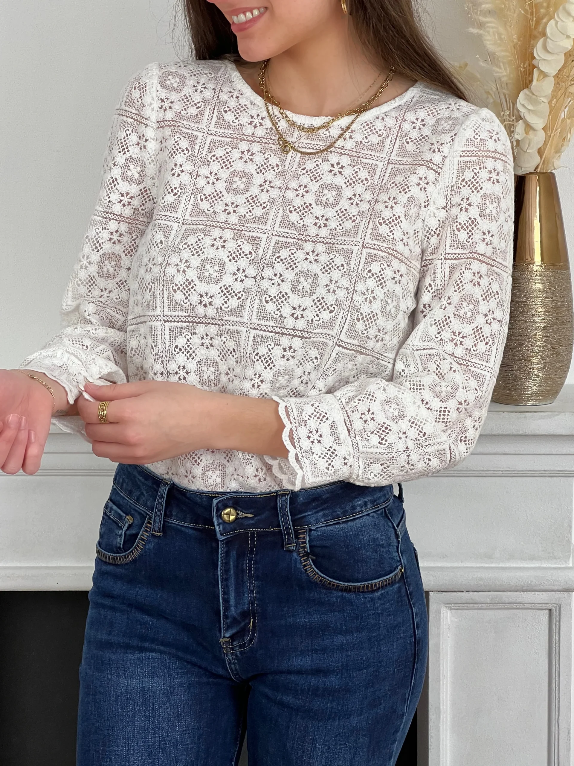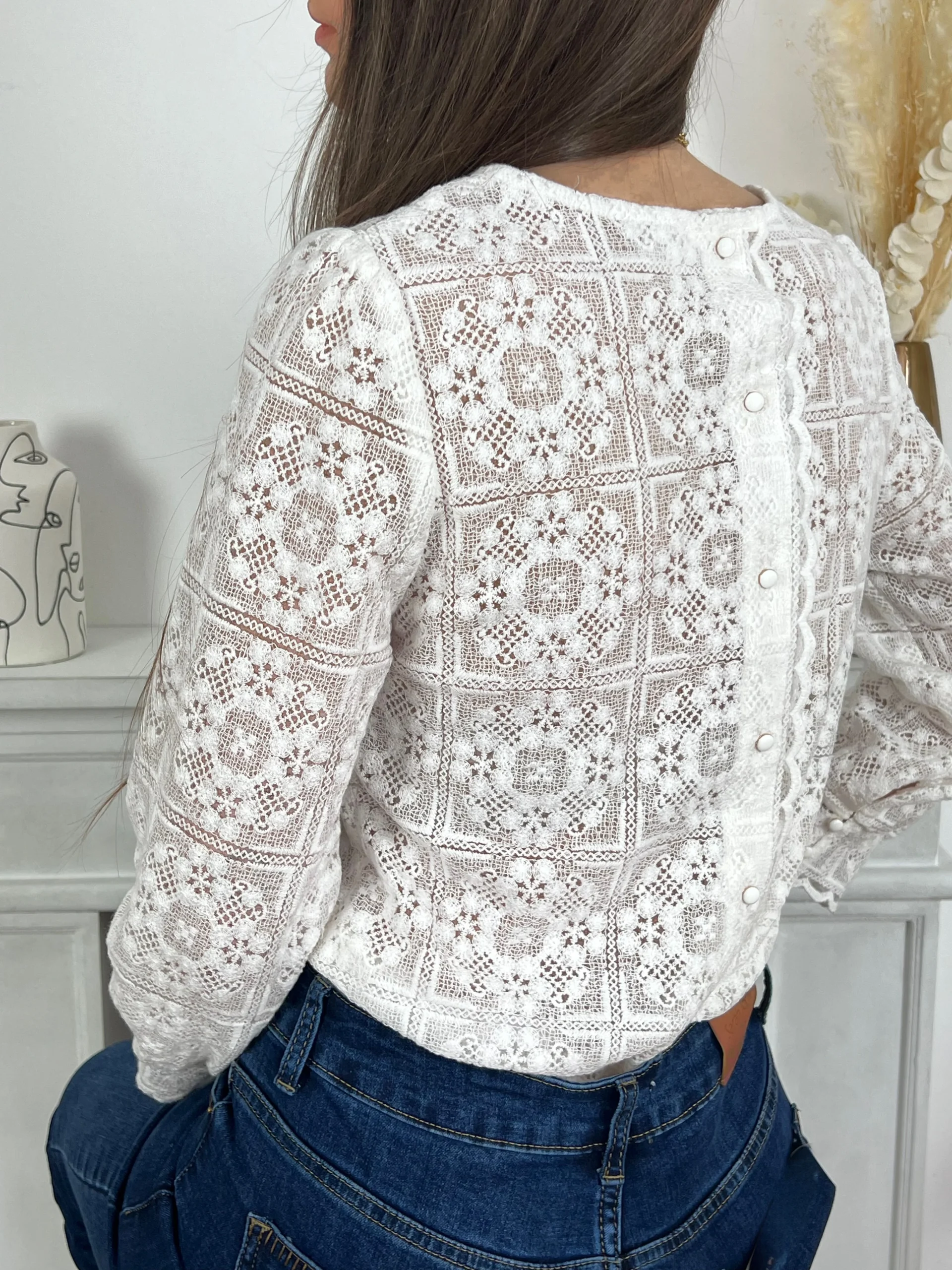 La blouse écru ajourée avec boutons au dos allie élégance et subtilité. Sa couleur douce et ses détails ajourés lui confèrent un charme intemporel, tandis que les boutons au dos ajoutent une touche sophistiquée. C’est une pièce versatile qui peut être portée avec style pour diverses occasions.