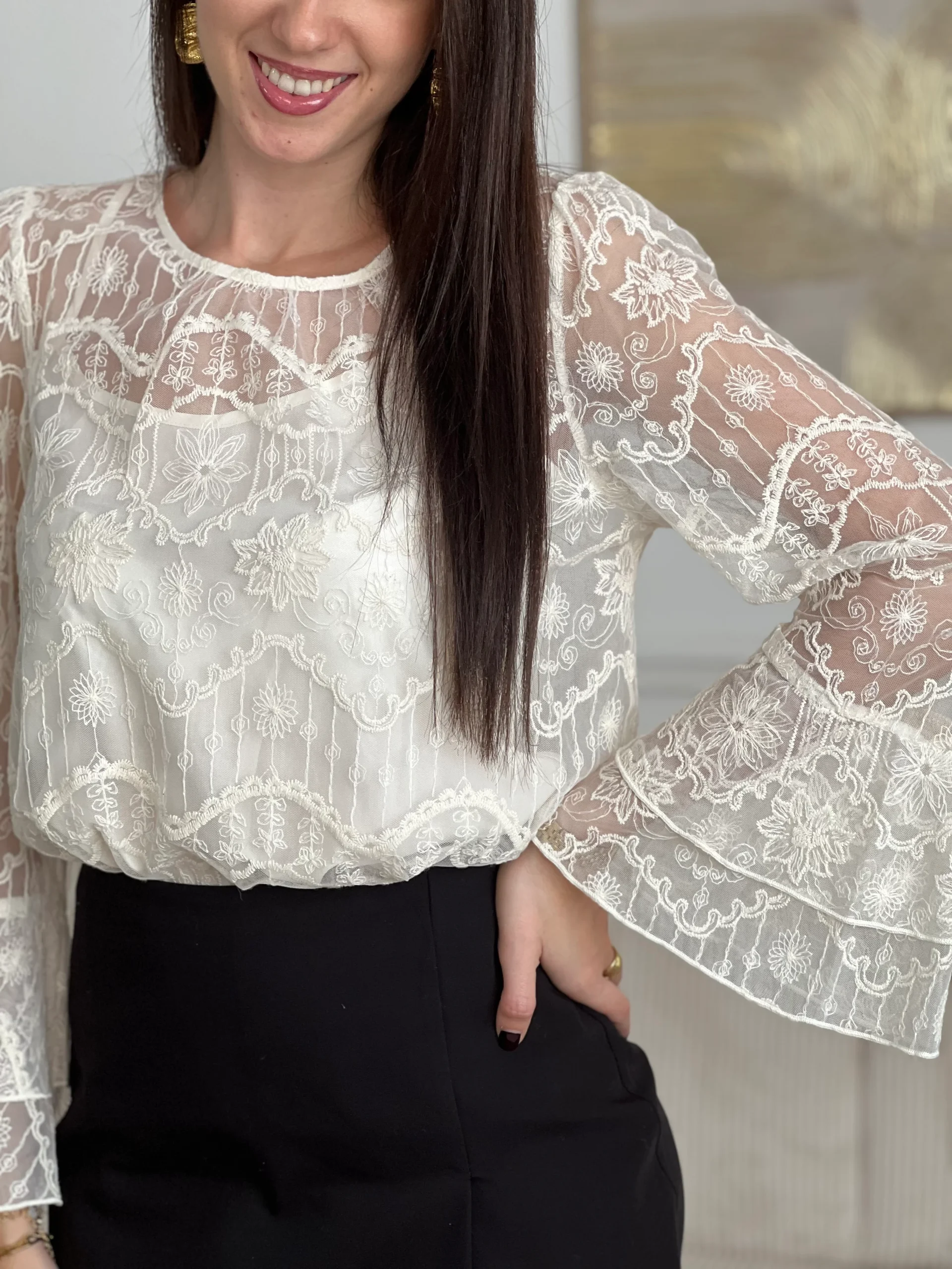 Blouse écrue intemporelle qui allie délicatesse et confort. Ornée d’une dentelle aux motifs floraux subtils, elle séduira par ses manches longues évasées qui encadrent élégamment les bras.