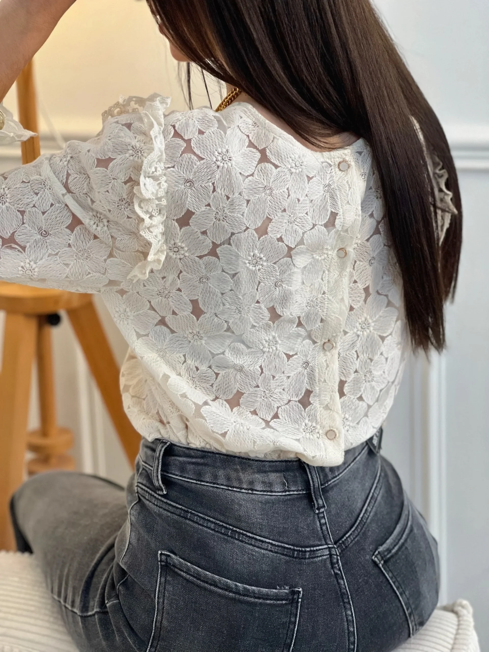 Délicate et féminine, cette blouse en broderie beige séduit par ses jolis détails et ses boutons élégants dans le dos. Une pièce tout en douceur, idéale pour un look chic et intemporel.