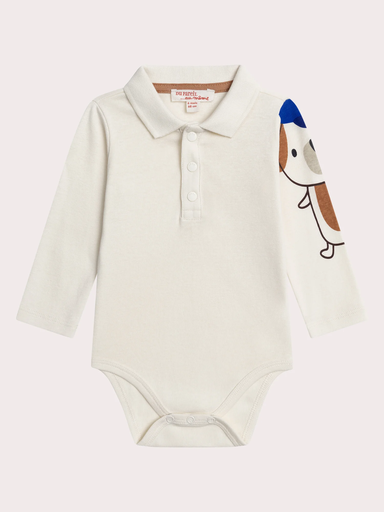 Ce body est conçu pour les bébés garçons et convient parfaitement au quotidien, en toute saison. Il est confortable et facile à enfiler grâce à son ouverture à pression devant et à l’entrejambe. Une animation chien sur le bras apporte une touche ludique et attachante.