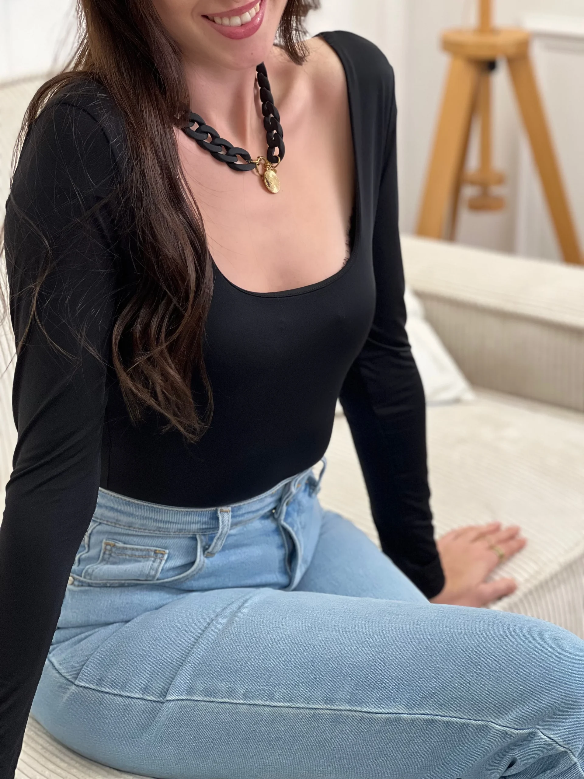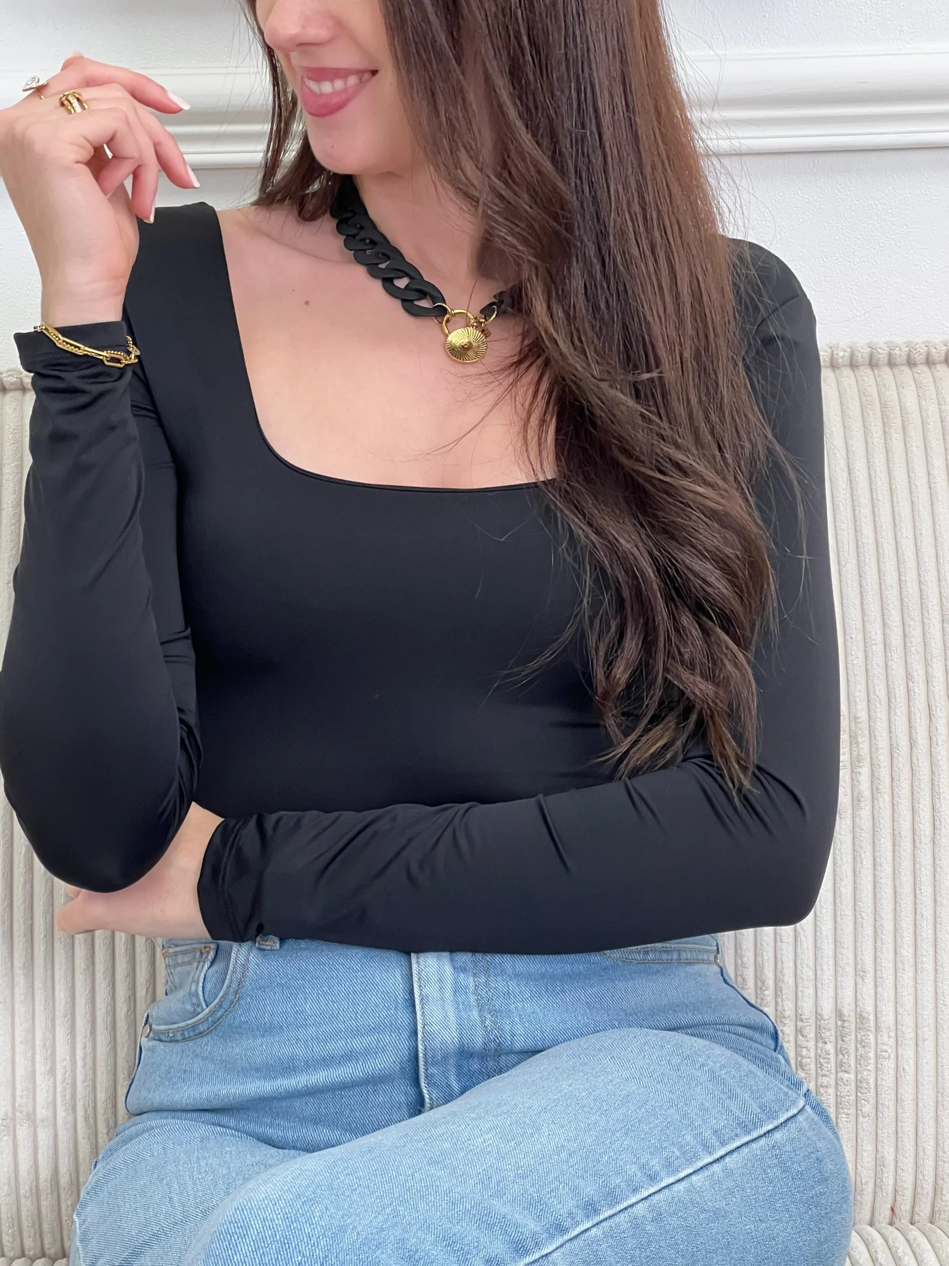 Body noir élégant aux manches longues et col carré. Fermeture pratique avec accroche crochet pour un ajustement sur mesure. Un incontournable polyvalent à porter seul ou en superposition.