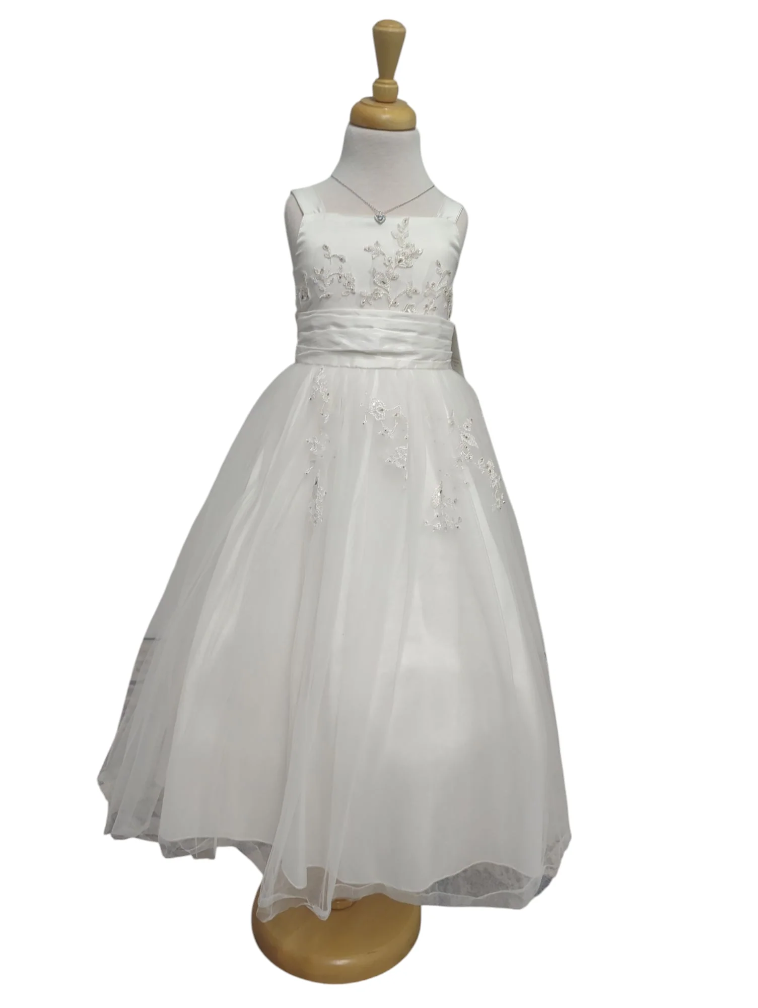 La robe R21211 est une véritable petite robe de princesse conçue pour les occasions les plus spéciales. Sa teinte ivoire intemporelle, sa jupe volumineuse en tulle et ses broderies florales délicates en font une pièce exquise pour mariages, communions ou bals de fin d’année. Une large ceinture en satin marque joliment la taille et assure un ajustement confortable.