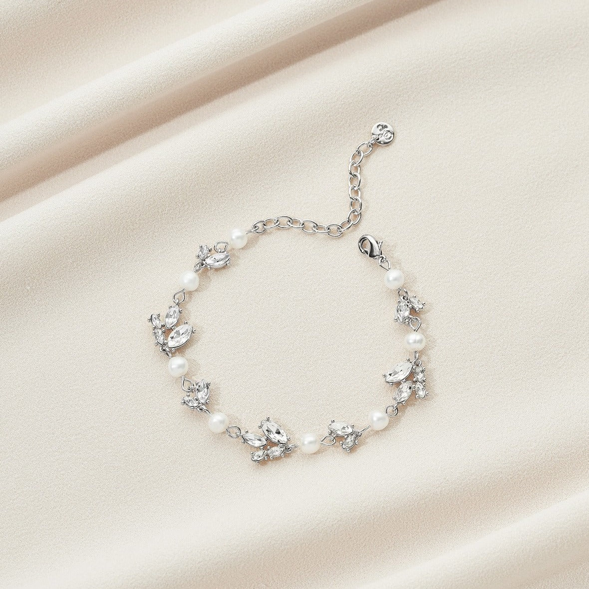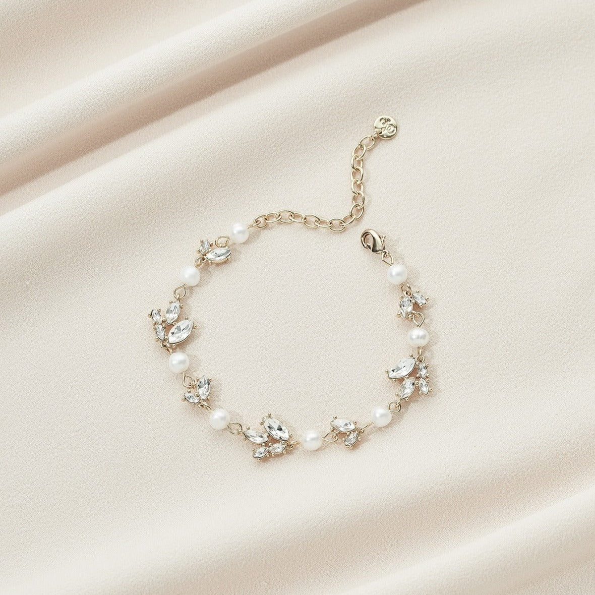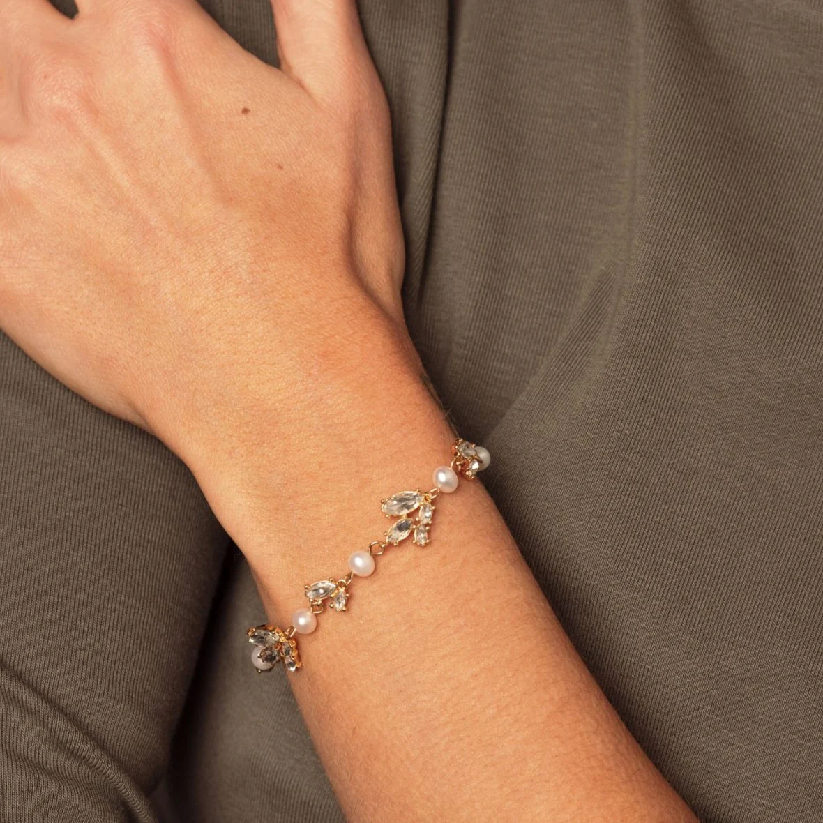 Le bracelet Cosette apportera à coup sûr à votre look une touche de douce féminité. Les pierres précieuses Marquis sont regroupées comme des feuilles entre des perles suspendues, enfilées ensemble dans une chaîne délicate. Portez cette pièce avec une tenue simple
