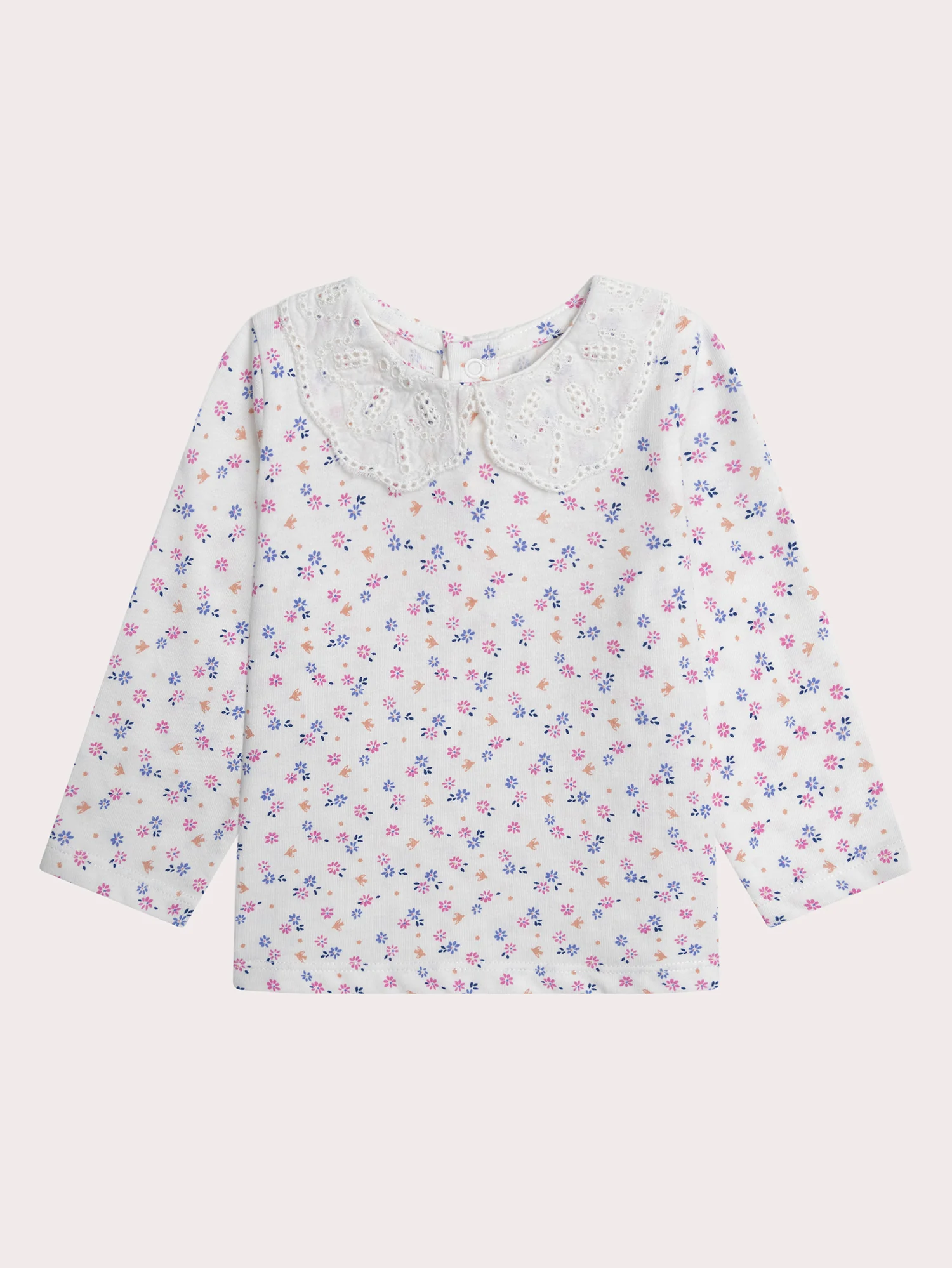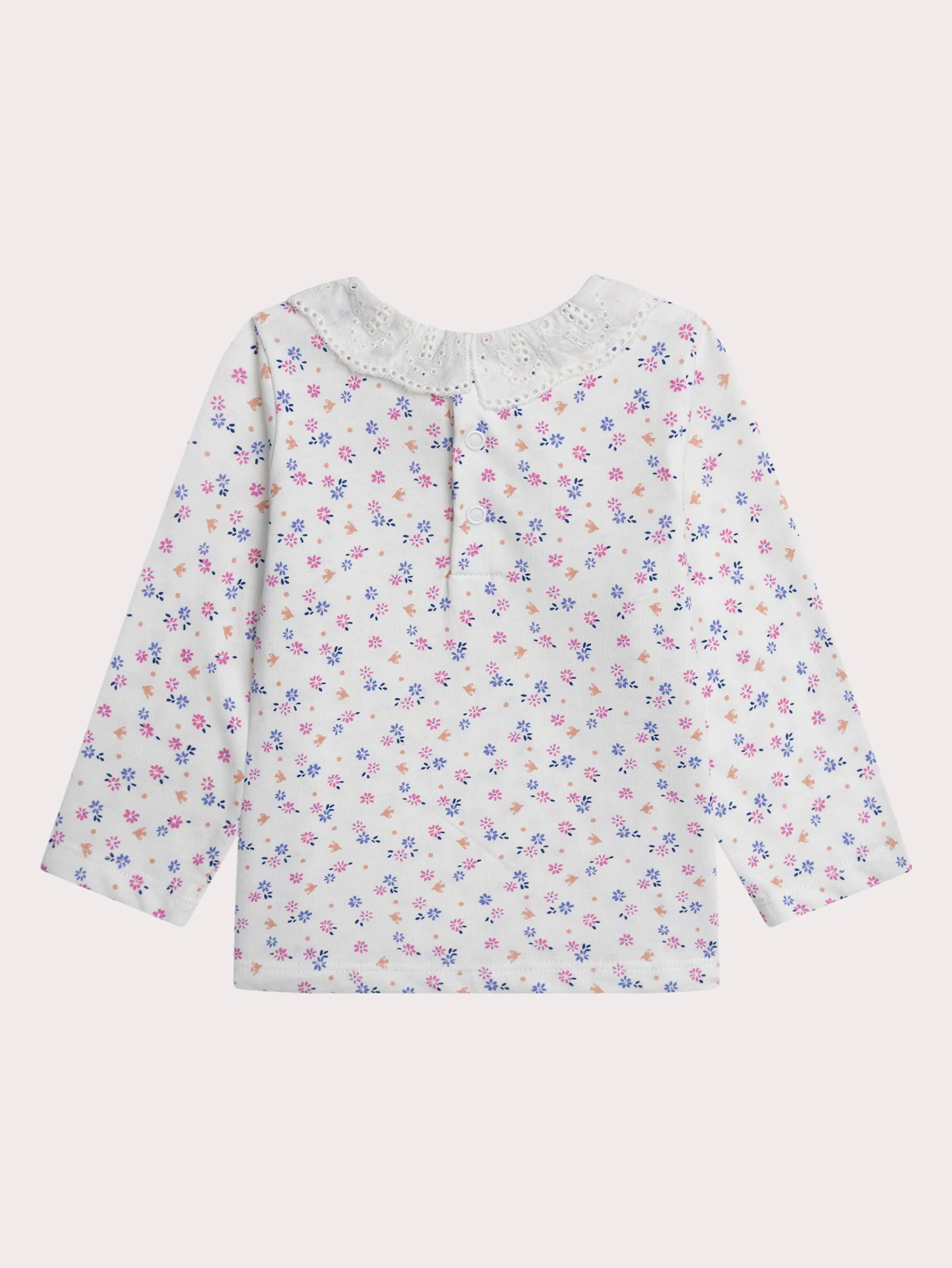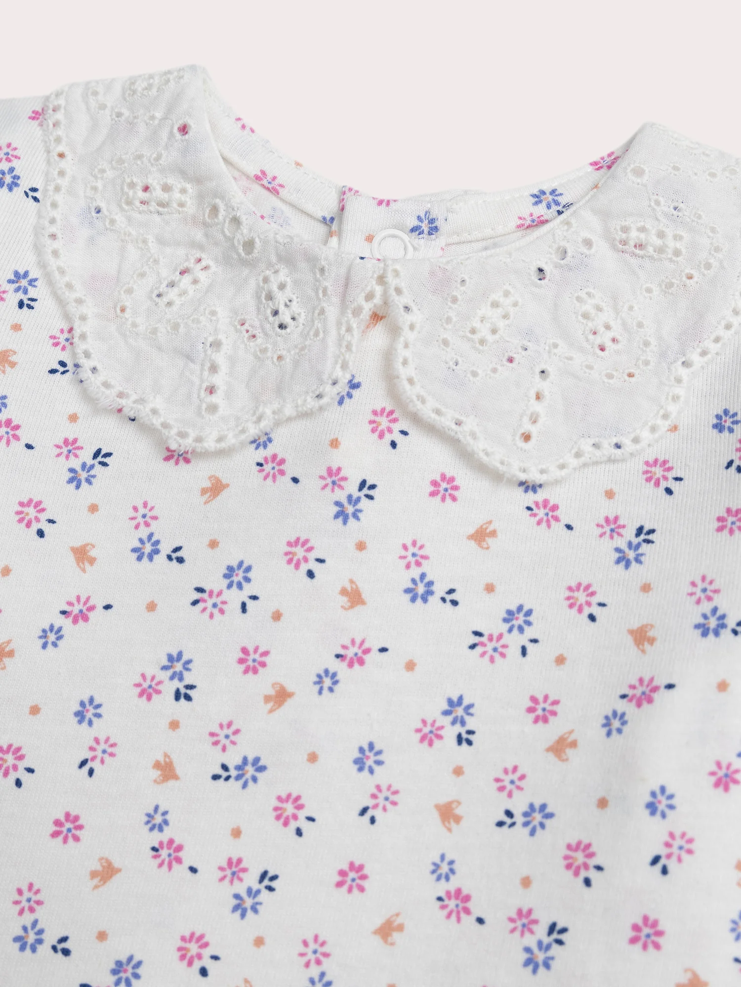 Cette brassière est conçue pour les bébés filles et convient toute l’année. En jersey 100 % coton, elle est douce et confortable avec une ouverture à pression au dos pour un enfilage facile. Son imprimé fleuri et son col en broderie apportent une touche élégante et délicate.