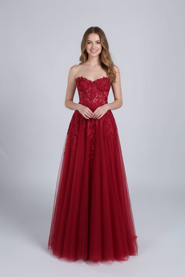 La jupe en tulle fluide s’évase harmonieusement pour offrir un volume aérien et une présence majestueuse. Sa couleur rouge profond ajoute une dimension dramatique et luxueuse, parfaite pour celles qui souhaitent une robe inoubliable.