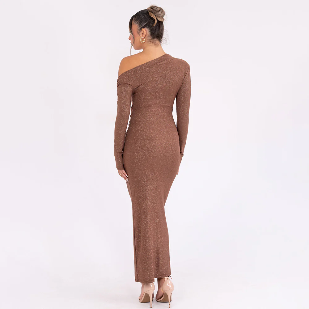 D’un geste fluide, Brittany dévoile l’épaule avec audace, tandis que sa coupe drapée épouse le corps avec justesse. Son tissu subtilement pailleté évoque l’éclat discret d’une nuit étoilée.