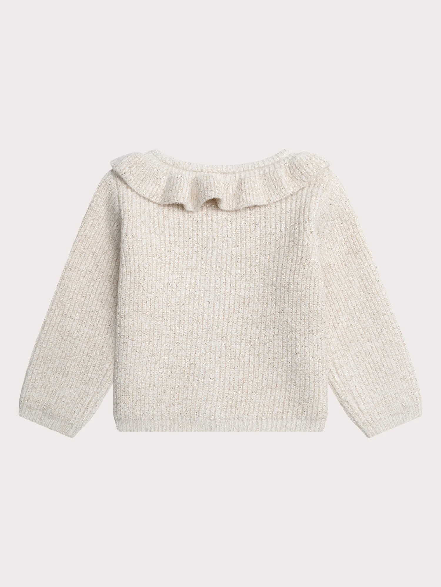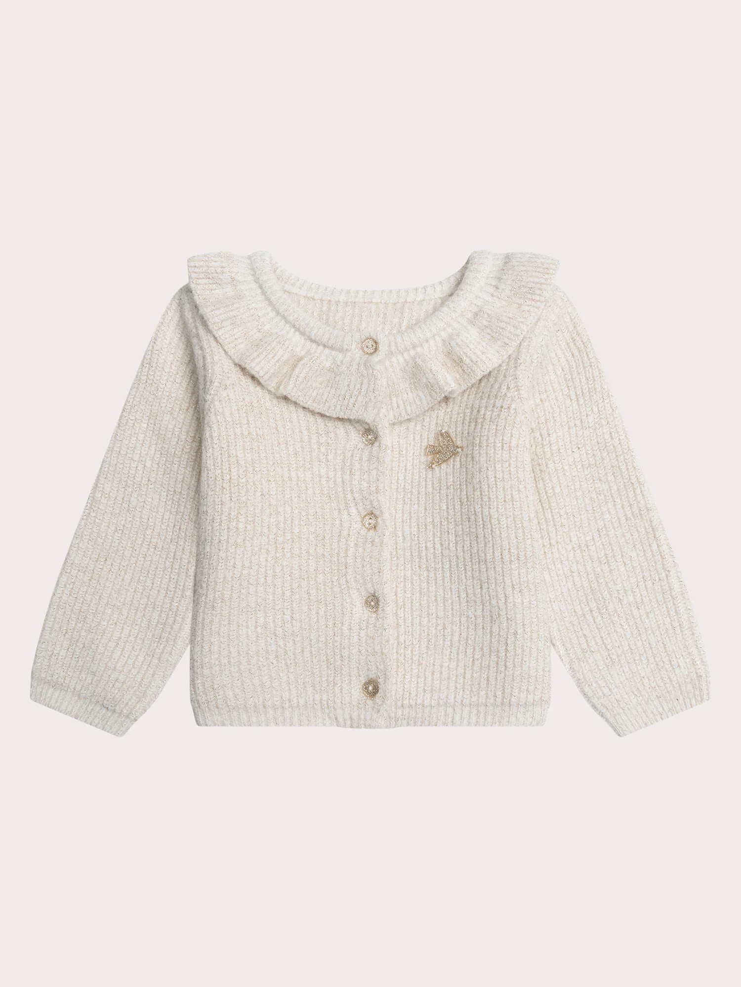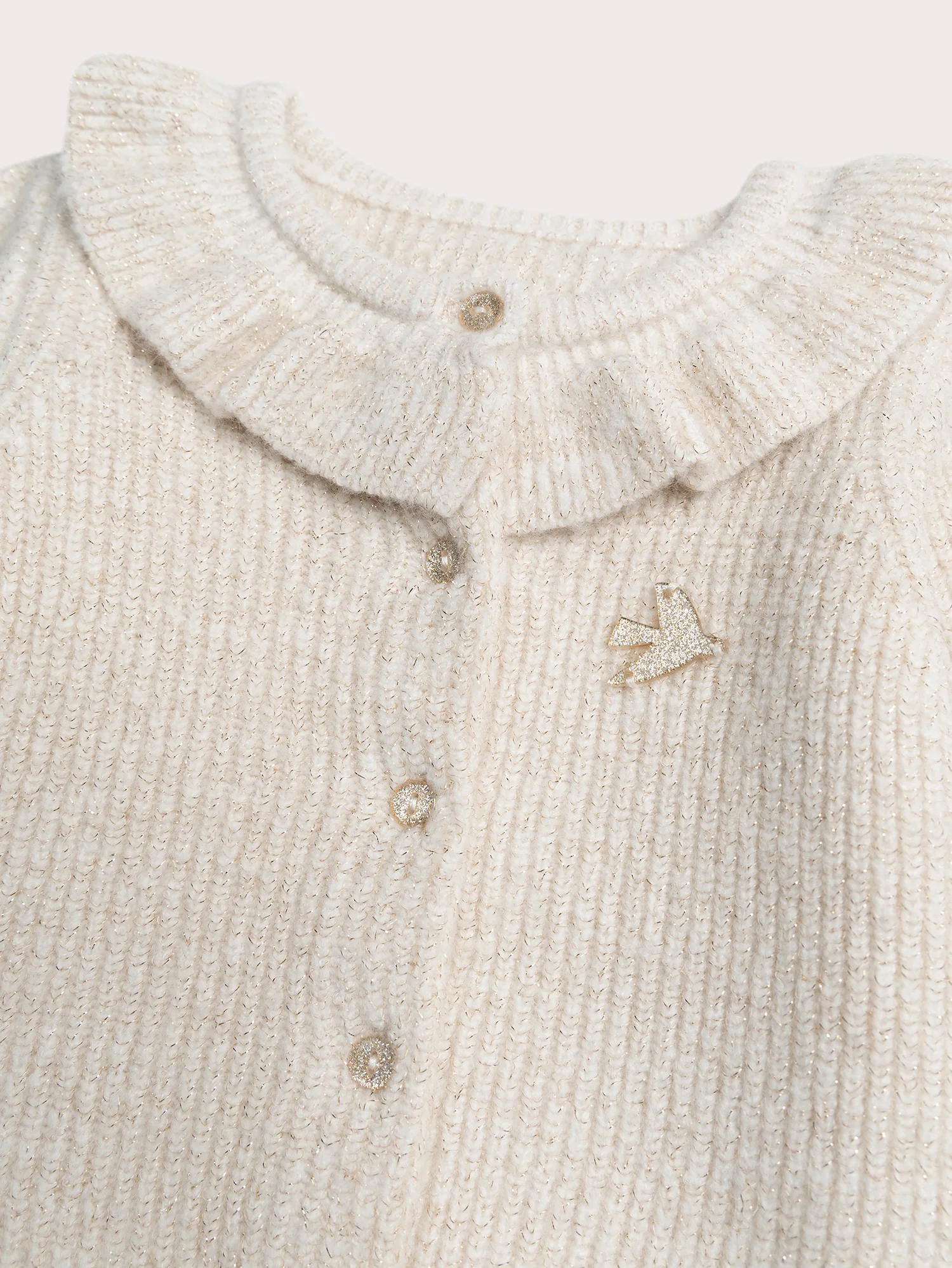 Ce cardigan écru est conçu pour les bébés filles et parfait pour les journées fraîches. Réalisé en tricot doux, il présente un col volanté et une ouverture boutonnée sur le devant. Une délicate broderie oiseau sur la poitrine ajoute une touche poétique et tendre.