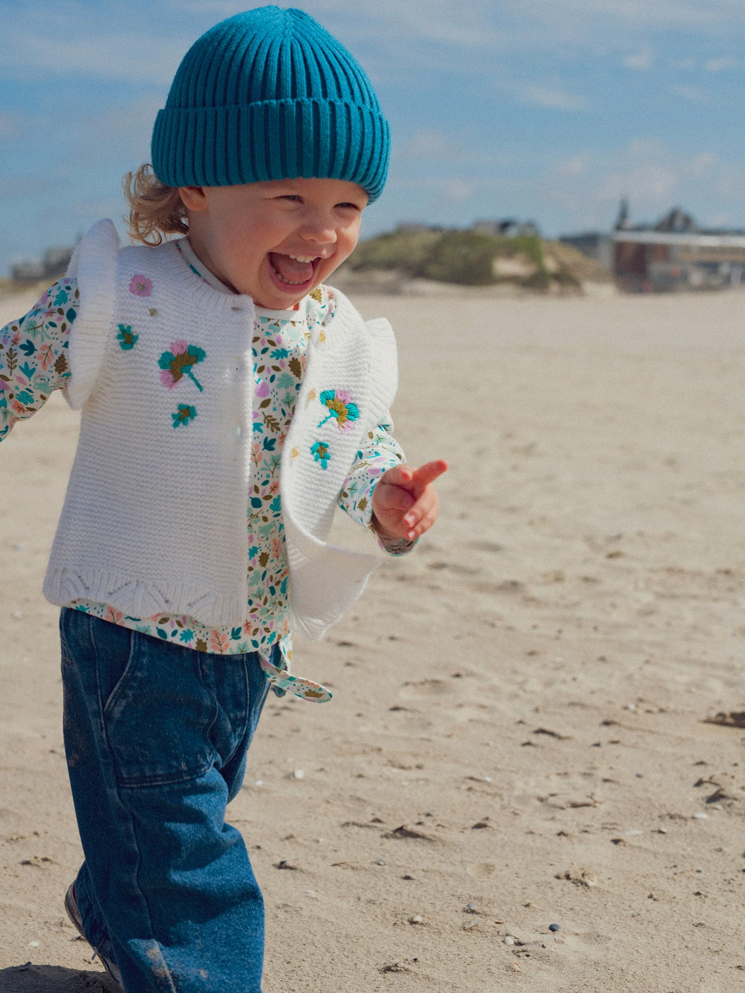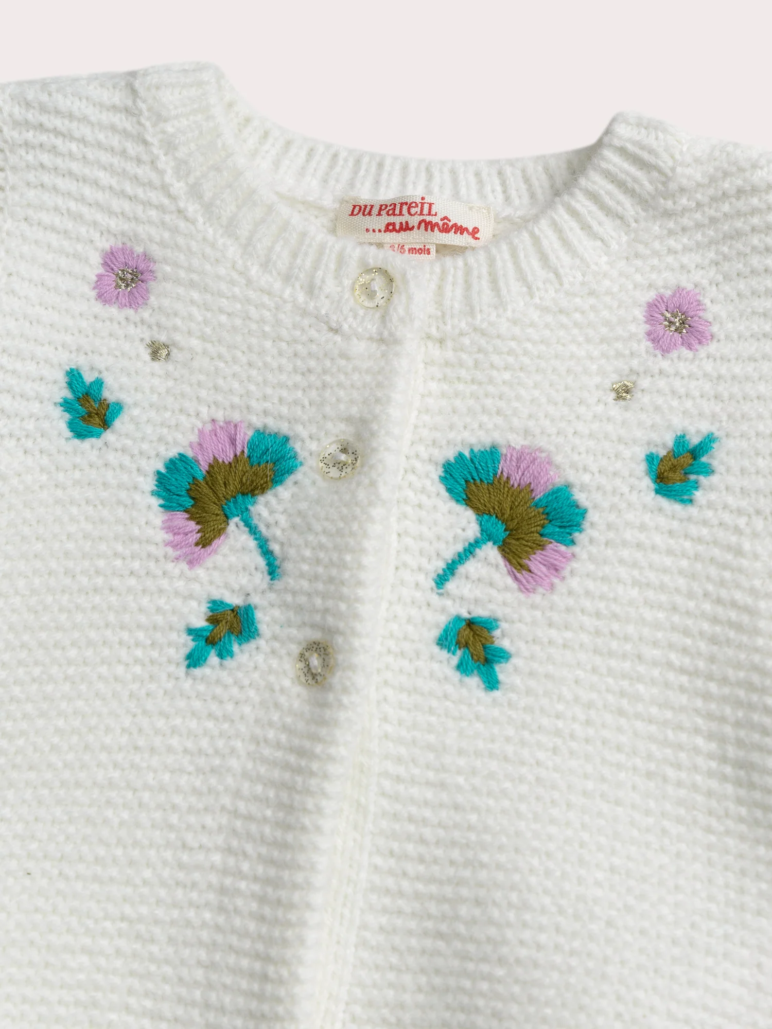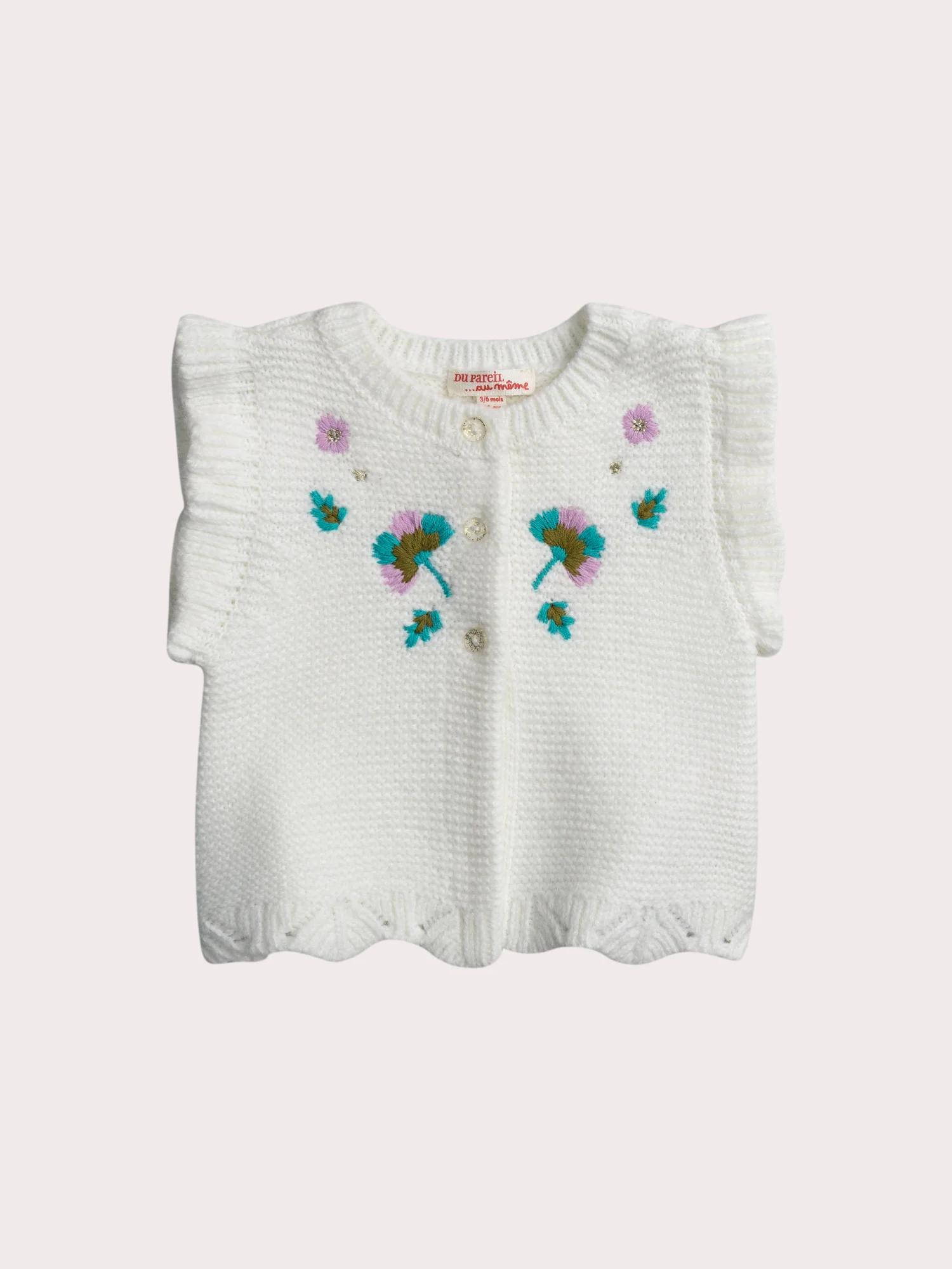 Ce cardigan écru est idéal pour les bébés filles lors des journées fraîches du printemps et de l’automne. Réalisé en point mousse, il assure douceur et confort tout en étant léger. Les volants aux épaules et la broderie fleurs sur le devant ajoutent une touche délicate et féminine à ce modèle.