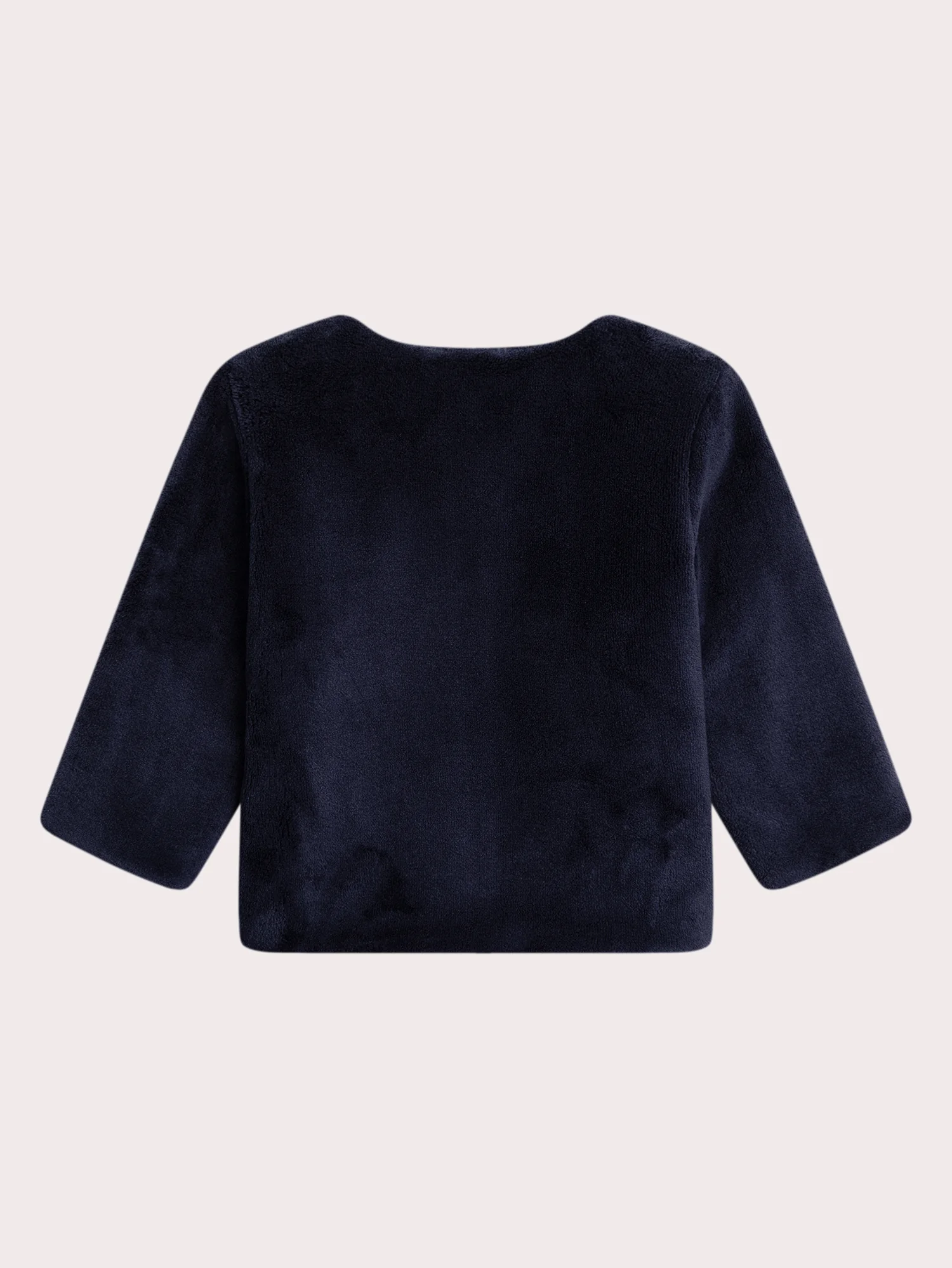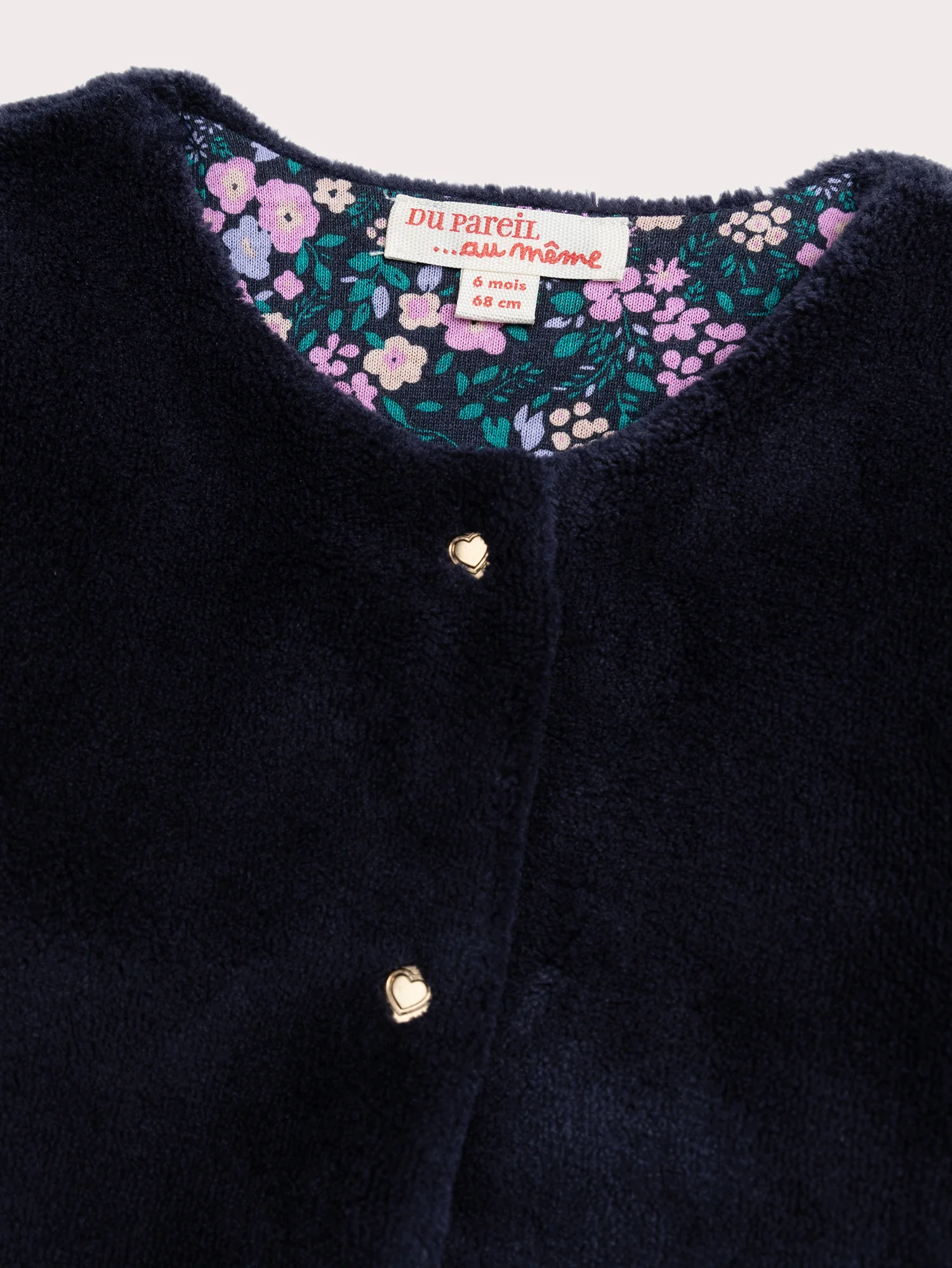 Ce cardigan réversible est conçu pour les bébés filles et idéal pour les journées fraîches. En fausse fourrure toute douce, il s’ouvre par pressions sur le devant et offre deux styles en un. Une face avec poches et broderie oiseau, l’autre avec un imprimé fleuri, pour varier les looks tout en douceur.