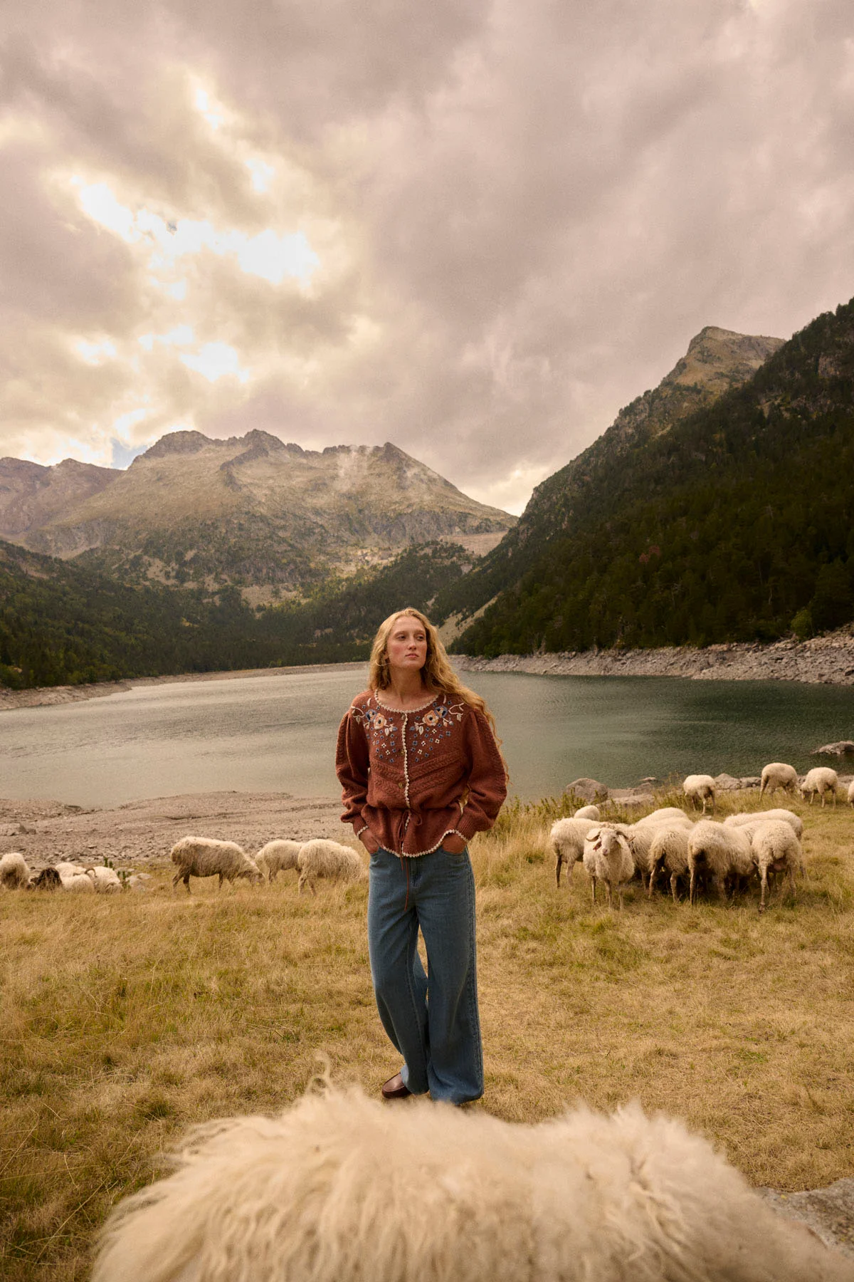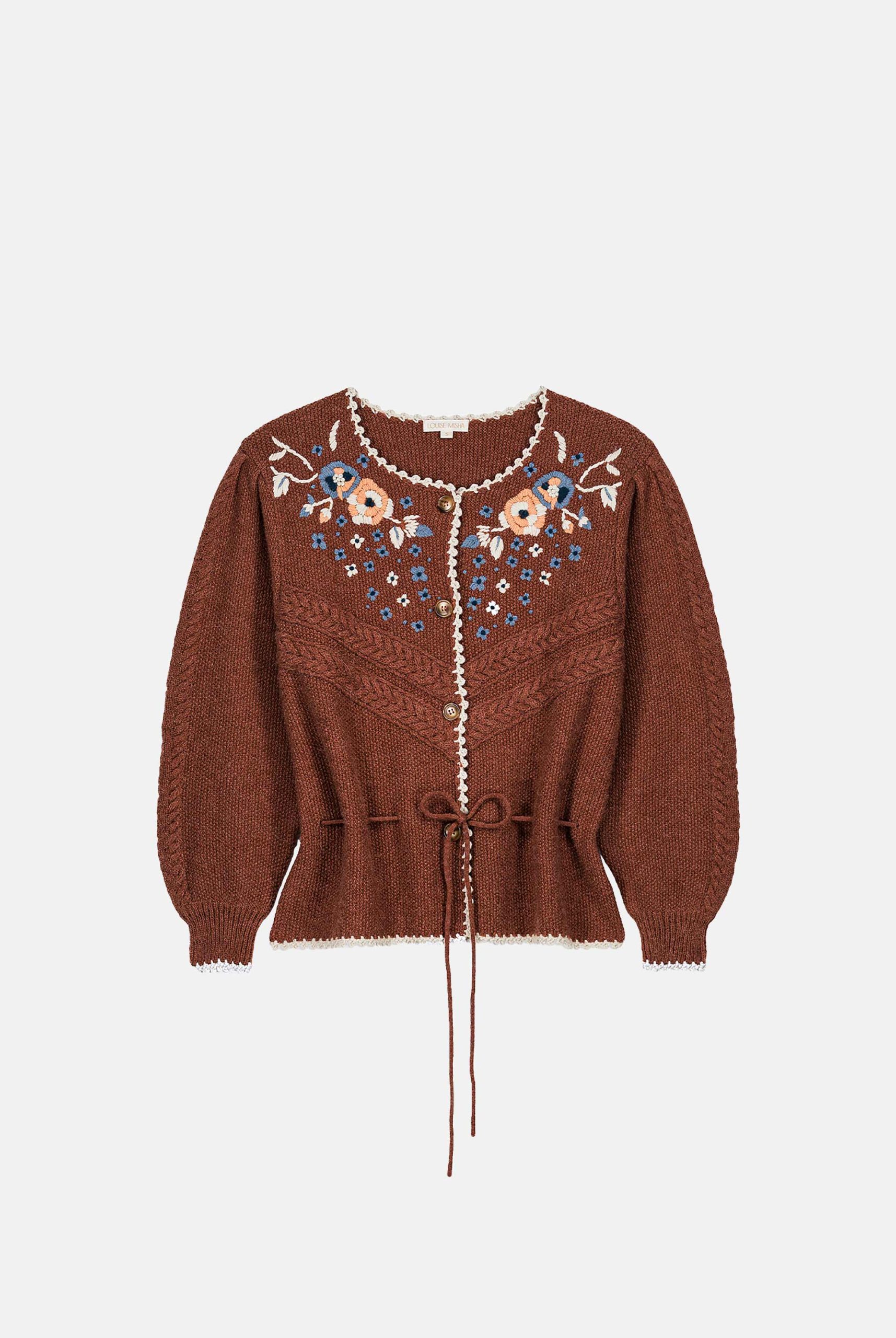 - Finitions crochetées à la main au niveau de l’encolure, le long de la patte de boutonnage, en bas de manches et bas de vêtement.