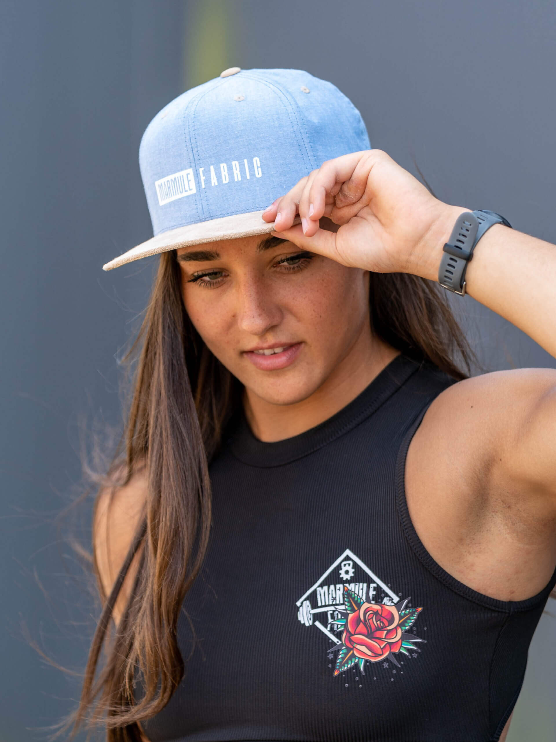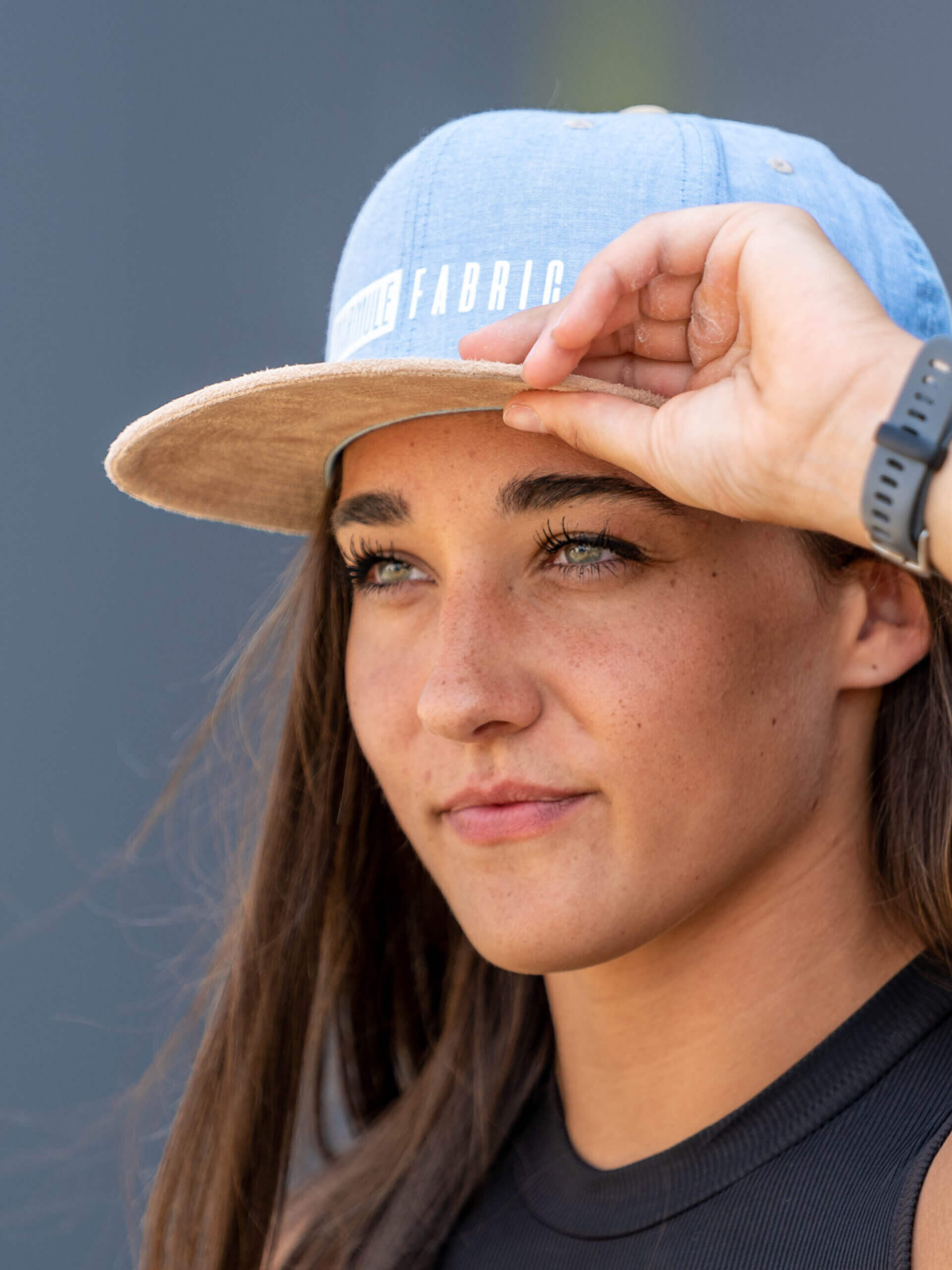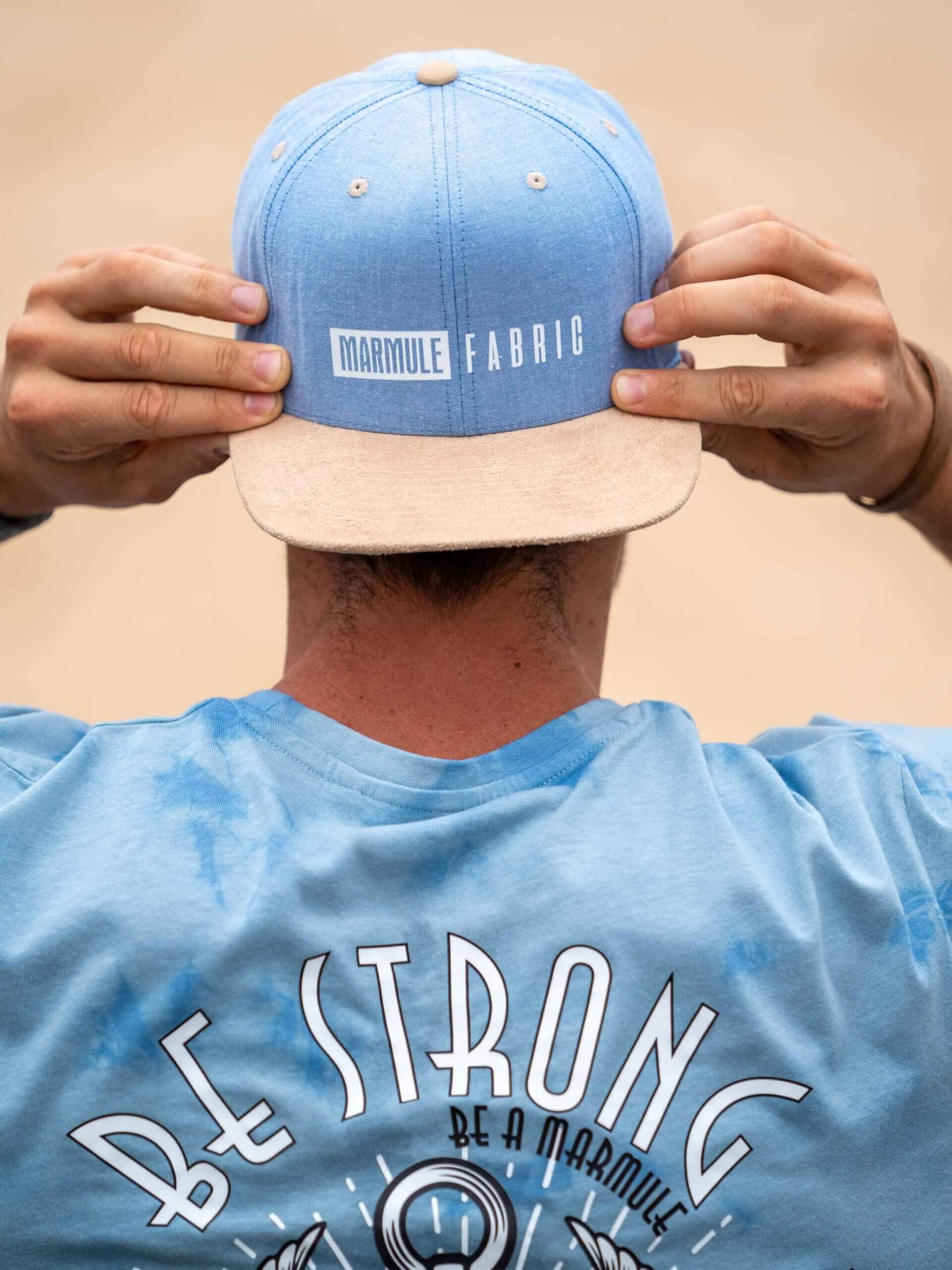Découvre notre nouvelle casquette snapback. Avec sa visière en suedine beige et son coloris bleu ciel effet jean, elle est parfaite pour cet été !