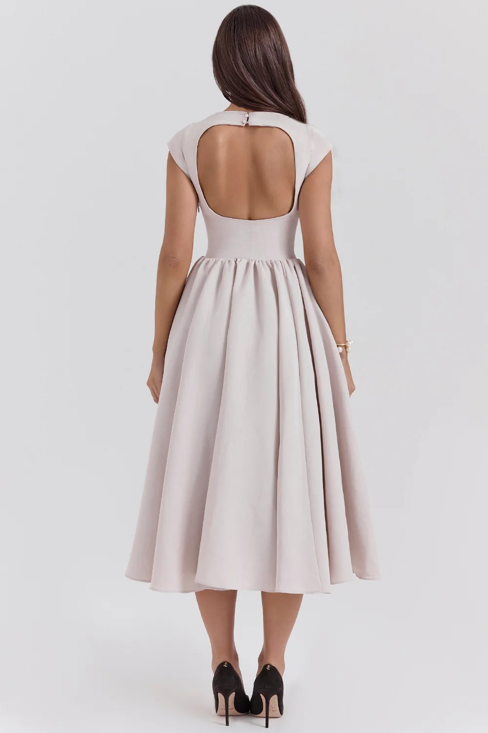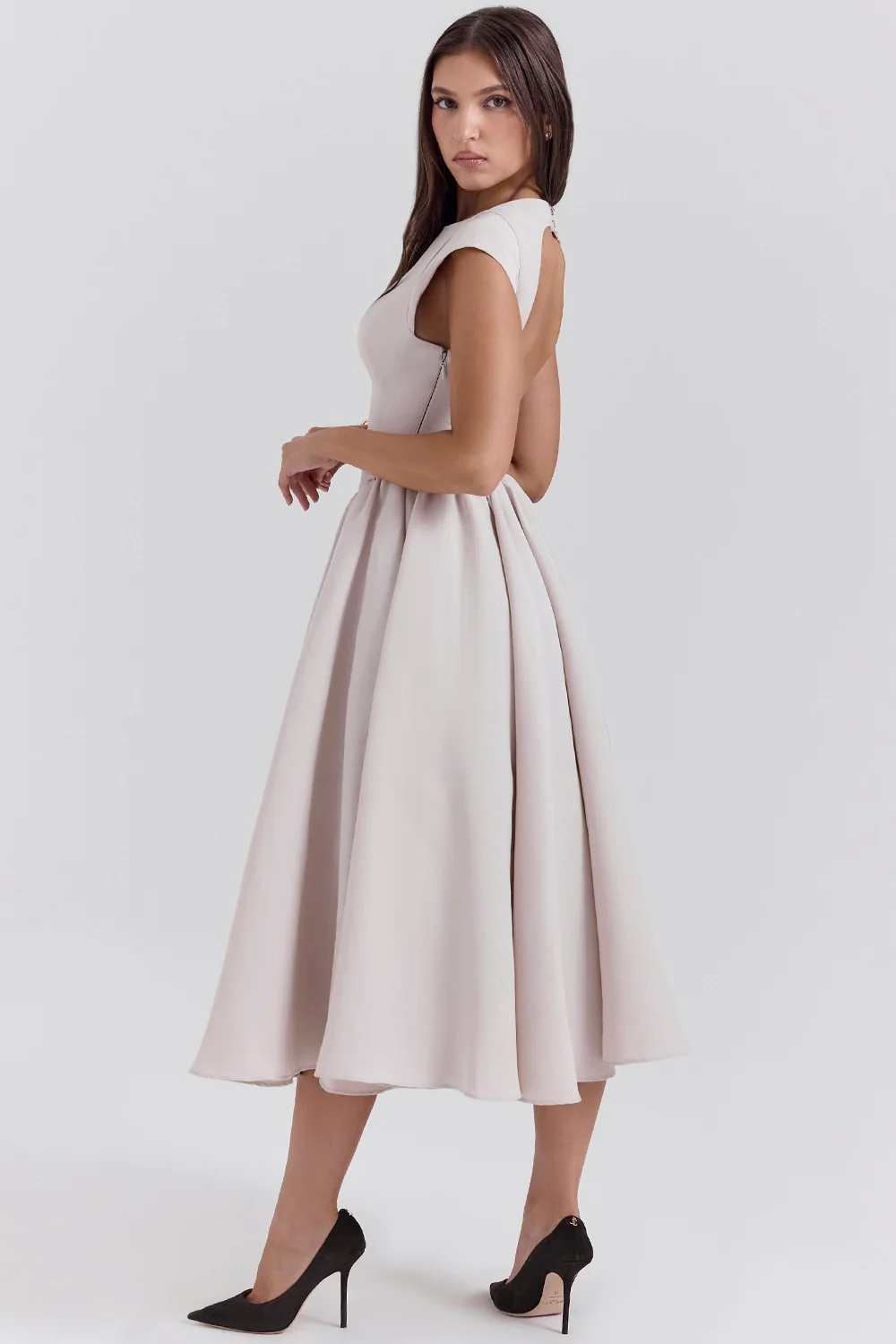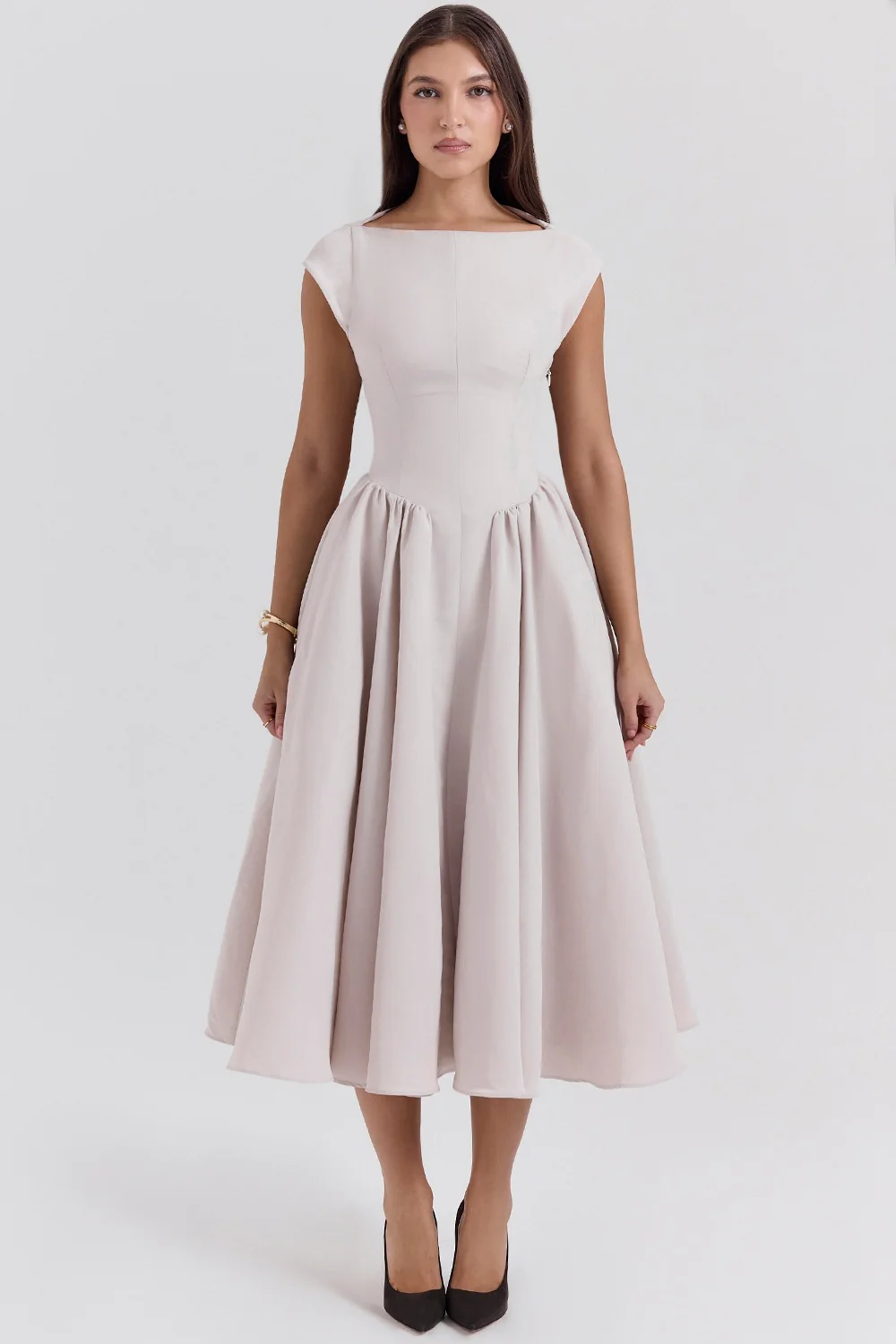 La robe Cassiane épouse le buste avec douceur, grâce à une coupe princesse structurée qui souligne la taille avant de s’épanouir dans une jupe ample, presque aérienne. Le tissu, à la texture subtilement moirée, capte la lumière sans jamais briller, comme une étoffe ancienne retrouvée. L’encolure bateau laisse deviner la naissance des épaules, tandis que la structure interne, soutenue par une doublure et une couche de tulle, assure un maintien impeccable sans rigidité.