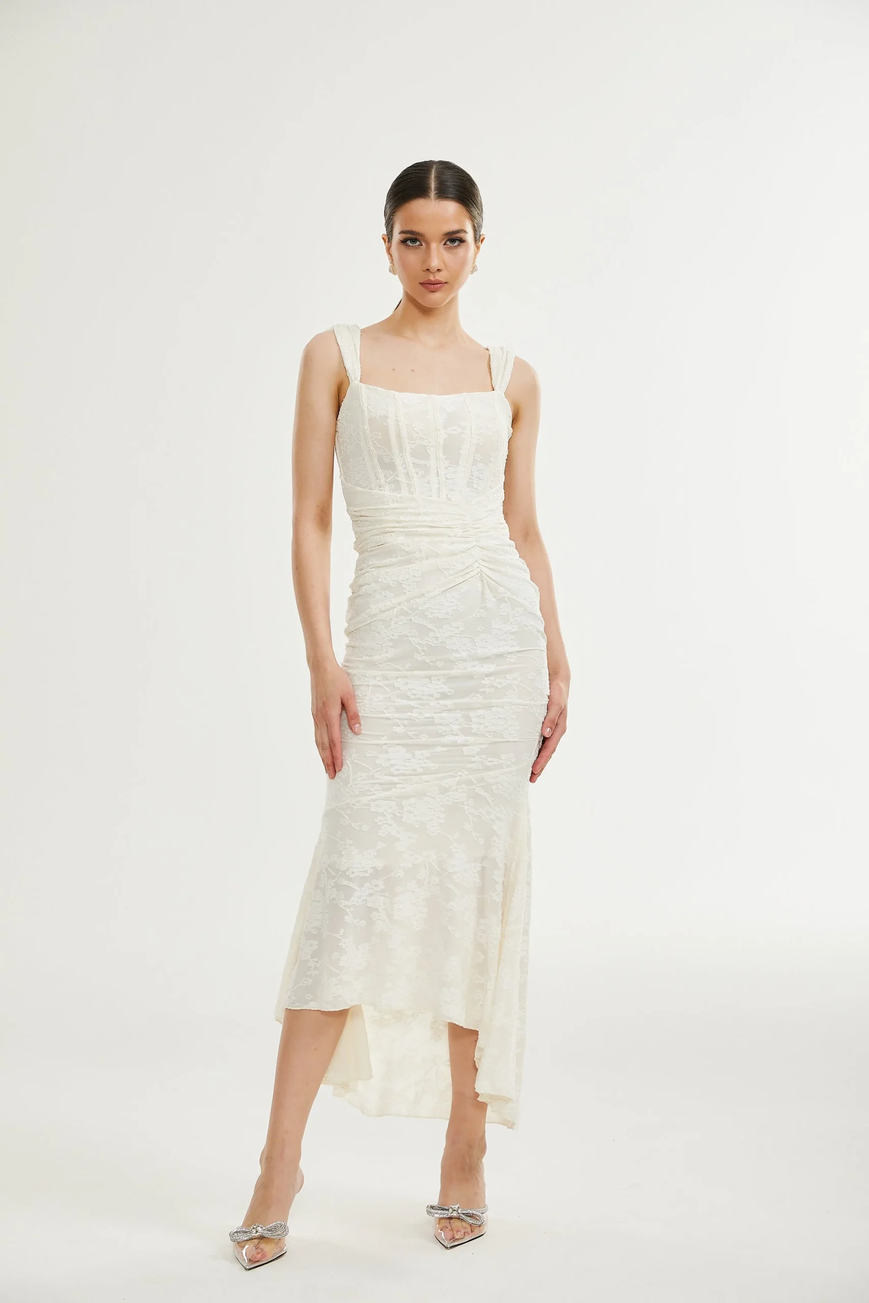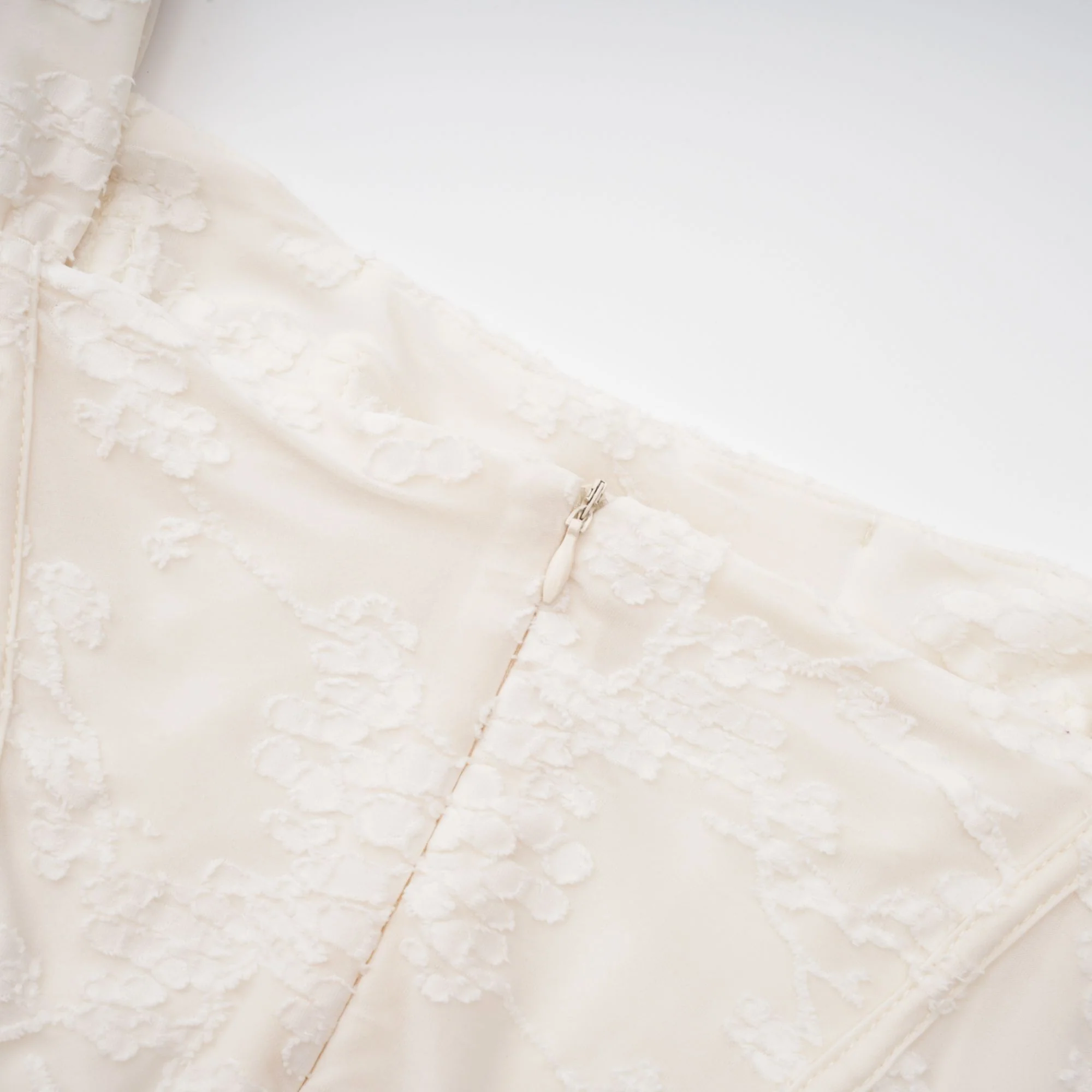 Charlotte est la robe mi-longue parfaite pour sublimer vos occasions spéciales. Confectionnée en jacquard extensible à motif floral, elle épouse la silhouette avec élégance. Son corsage structuré à baleines et ses fines bretelles dévoilent un dos délicatement ouvert, tandis que la jupe sirène mi-longue, fendue sur la cuisse, apporte une touche sophistiquée et sensuelle.