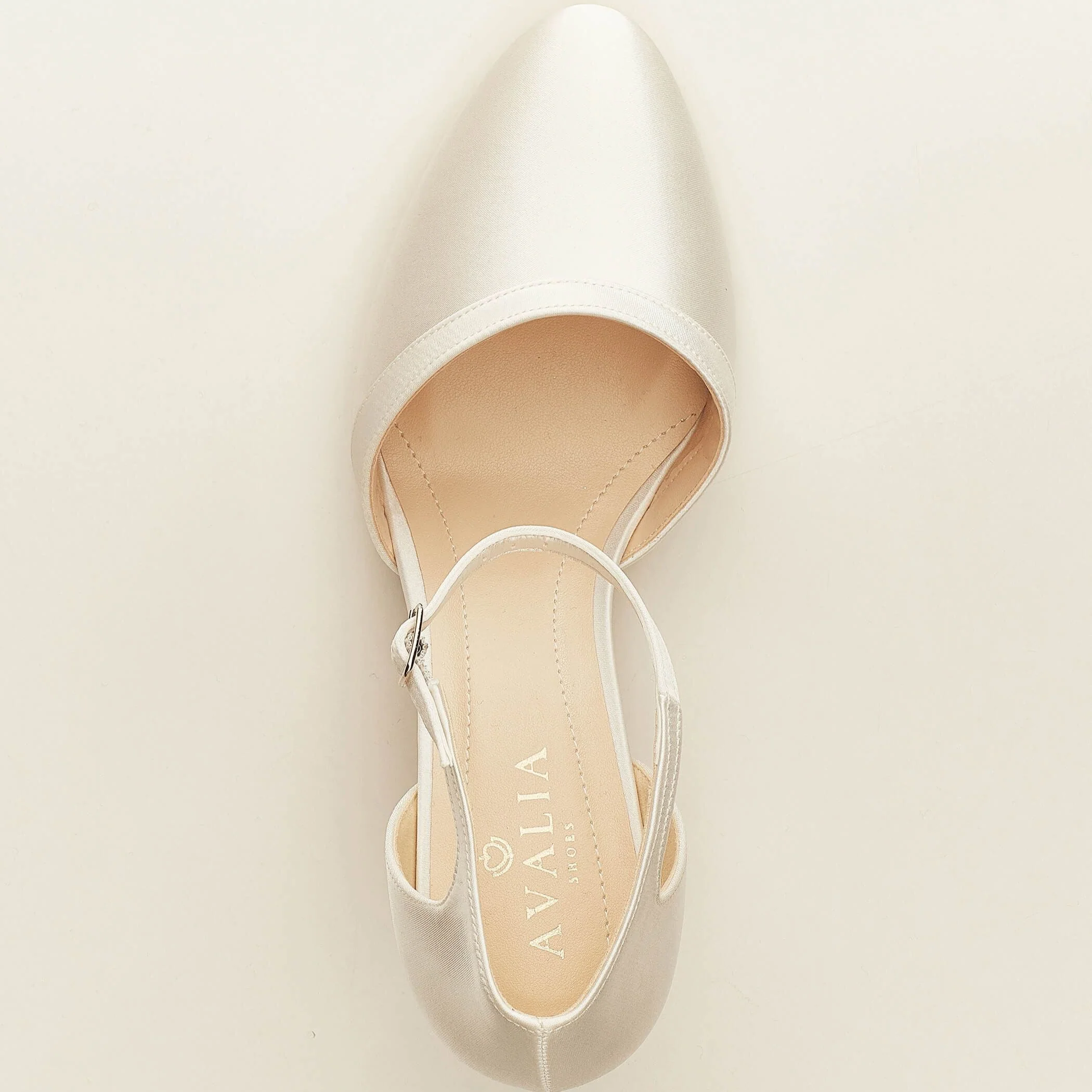 Élégante et intemporelle, cette chaussure de mariée en satin ivoire est pensée pour sublimer chaque pas. Son bout fermé légèrement pointu apporte une touche raffinée, tandis que la bride ajustable à la cheville assure maintien et confort tout au long de la journée. Dotée d’un talon bloc moyen, elle combine parfaitement élégance et praticité, permettant de danser et marcher avec aisance.