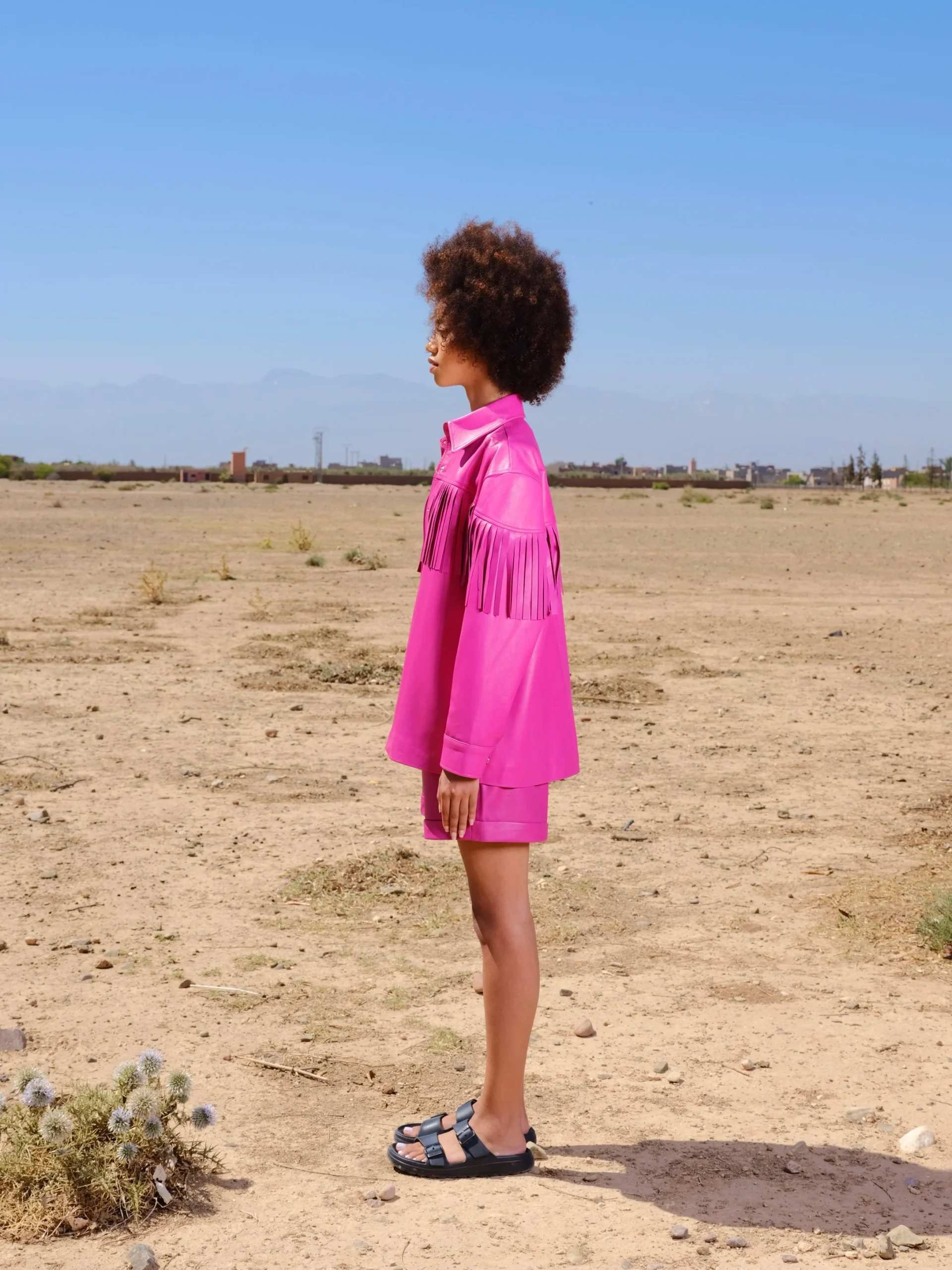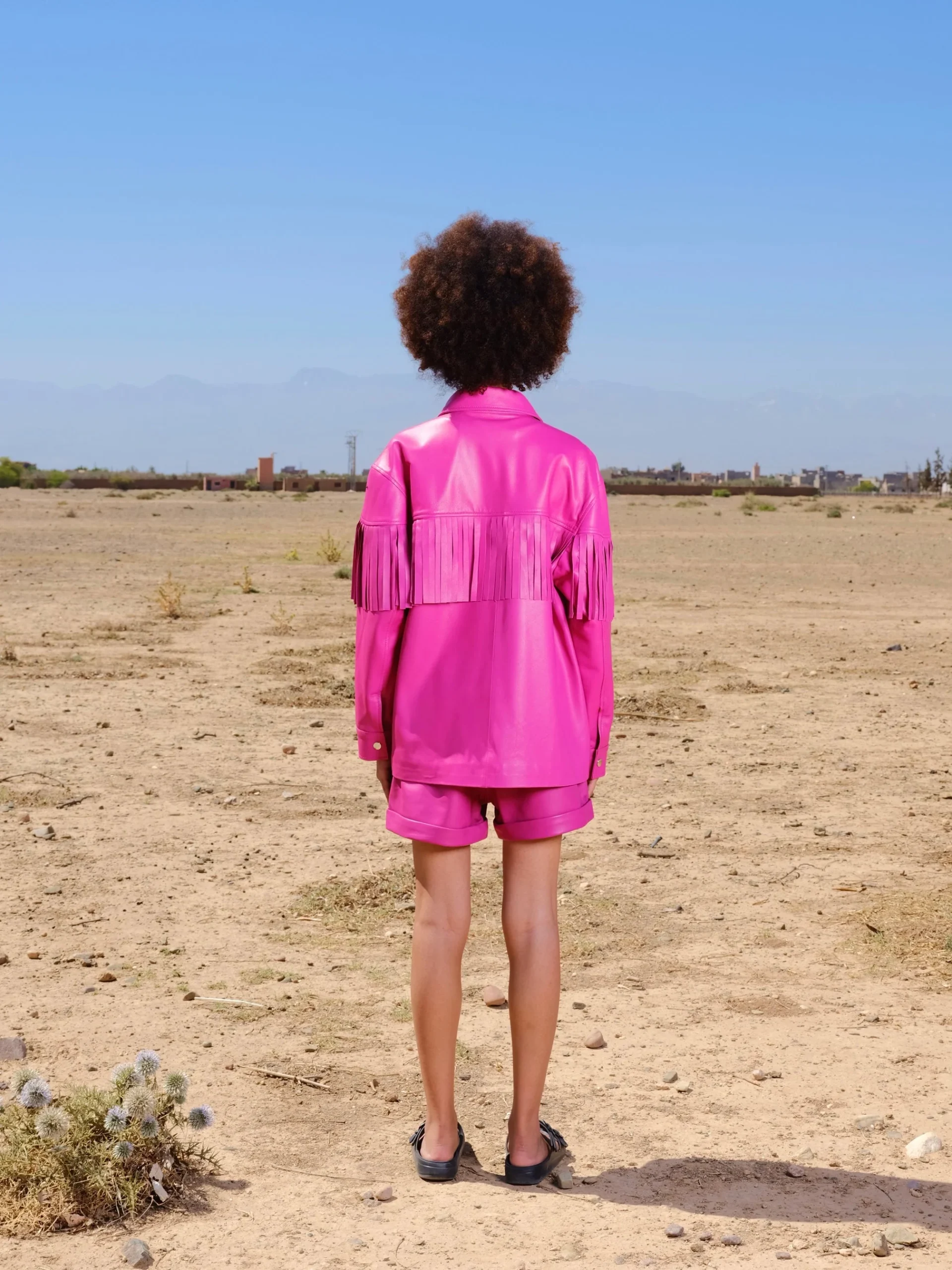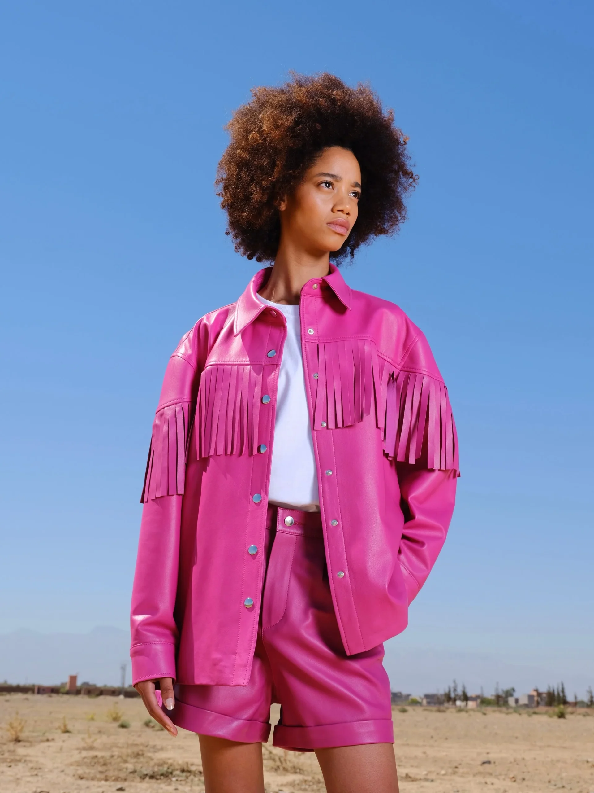 La pièce maitresse de votre garde-robe cette saison! Cette veste/chemise en cuir oversize avec ses franges à l’arrière et sur ses manches saura vous looker de la tête au pied! Pas besoin d’artifices supplémentaires, cette pièce en elle même fait tout votre look! Fermeture par des boutons pressions à l’avant. Poignets boutonnés.