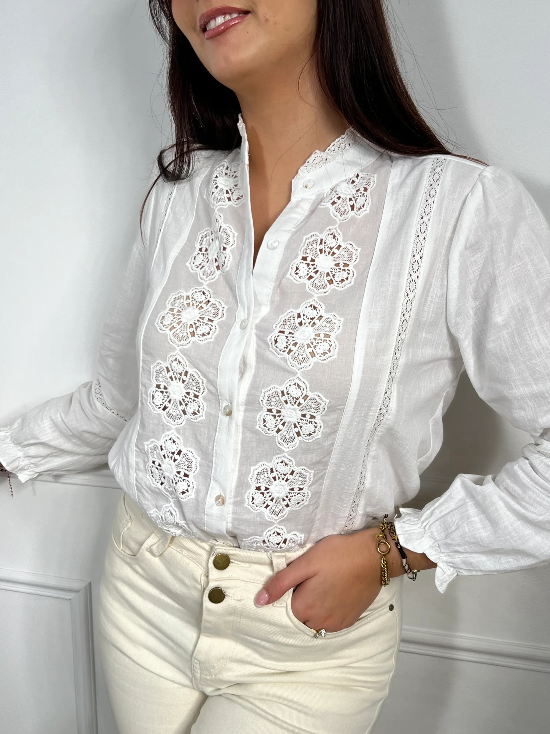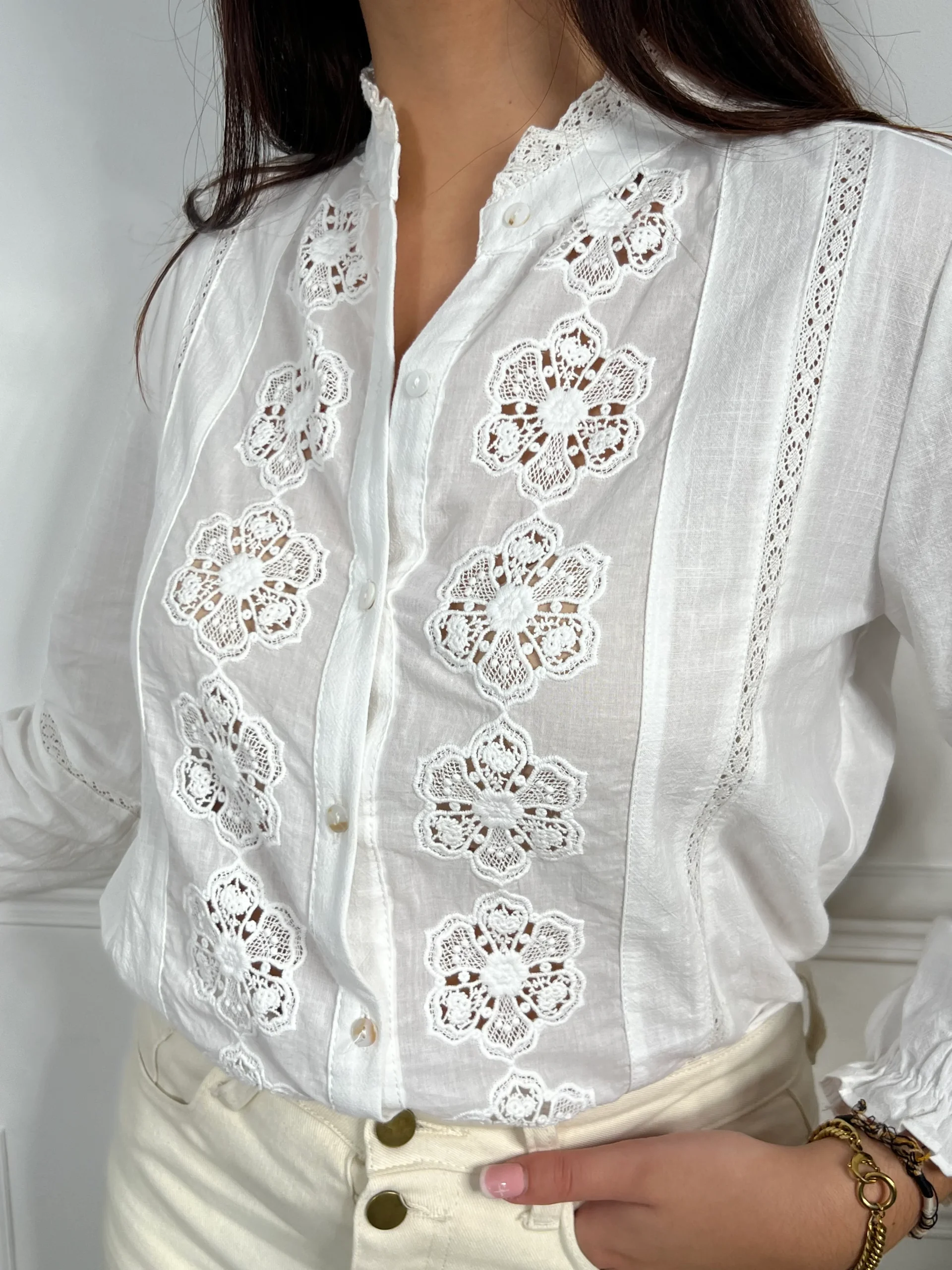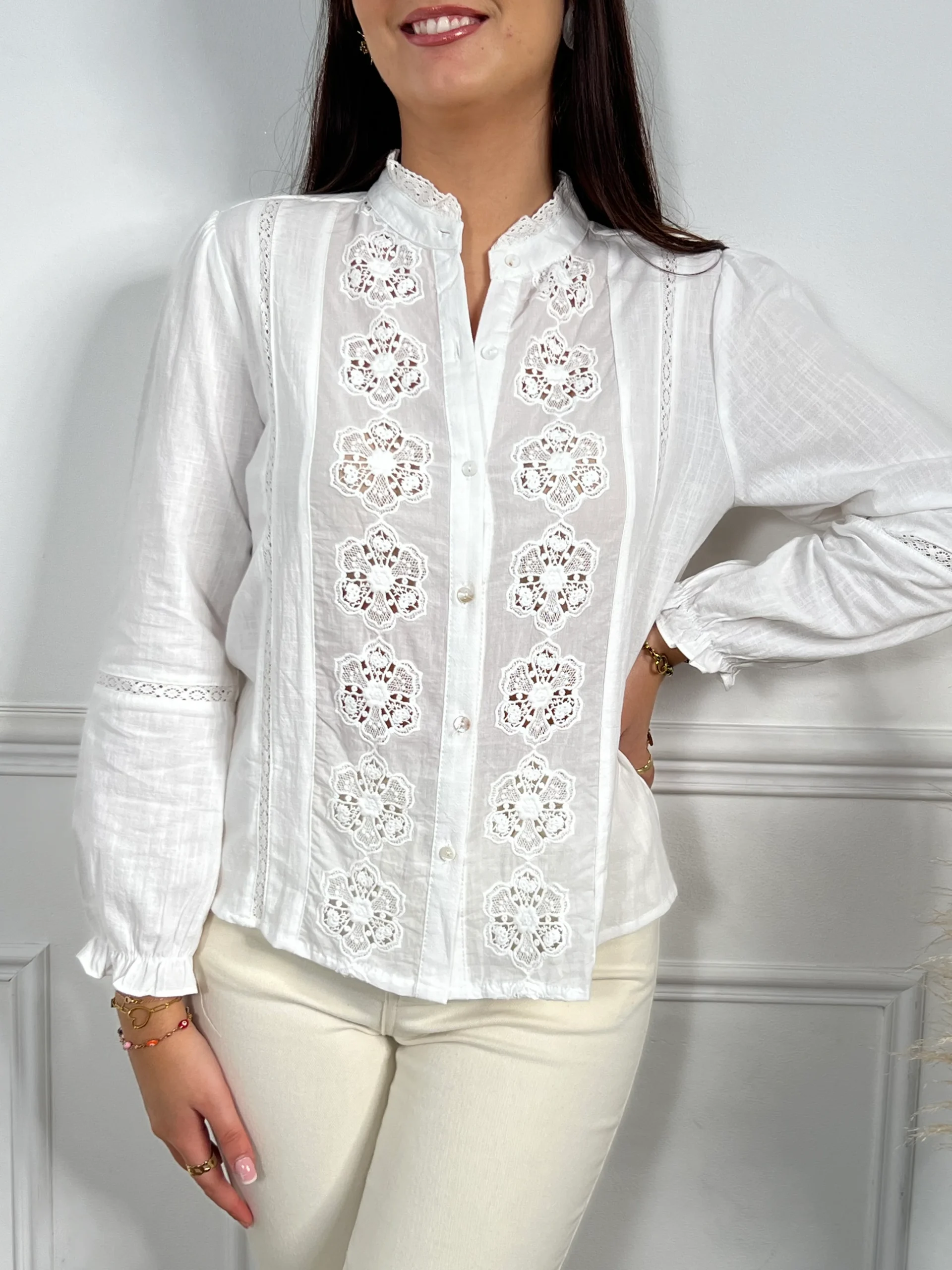 Découvrez notre chemise Ornella en coton écru avec broderie délicate et manches longues. Ajourée pour un look élégant, avec col montant et boutons aux manches et devant. Son tissu en coton vous garantit confort et style. Parfait pour une tenue de journée ou de soirée.