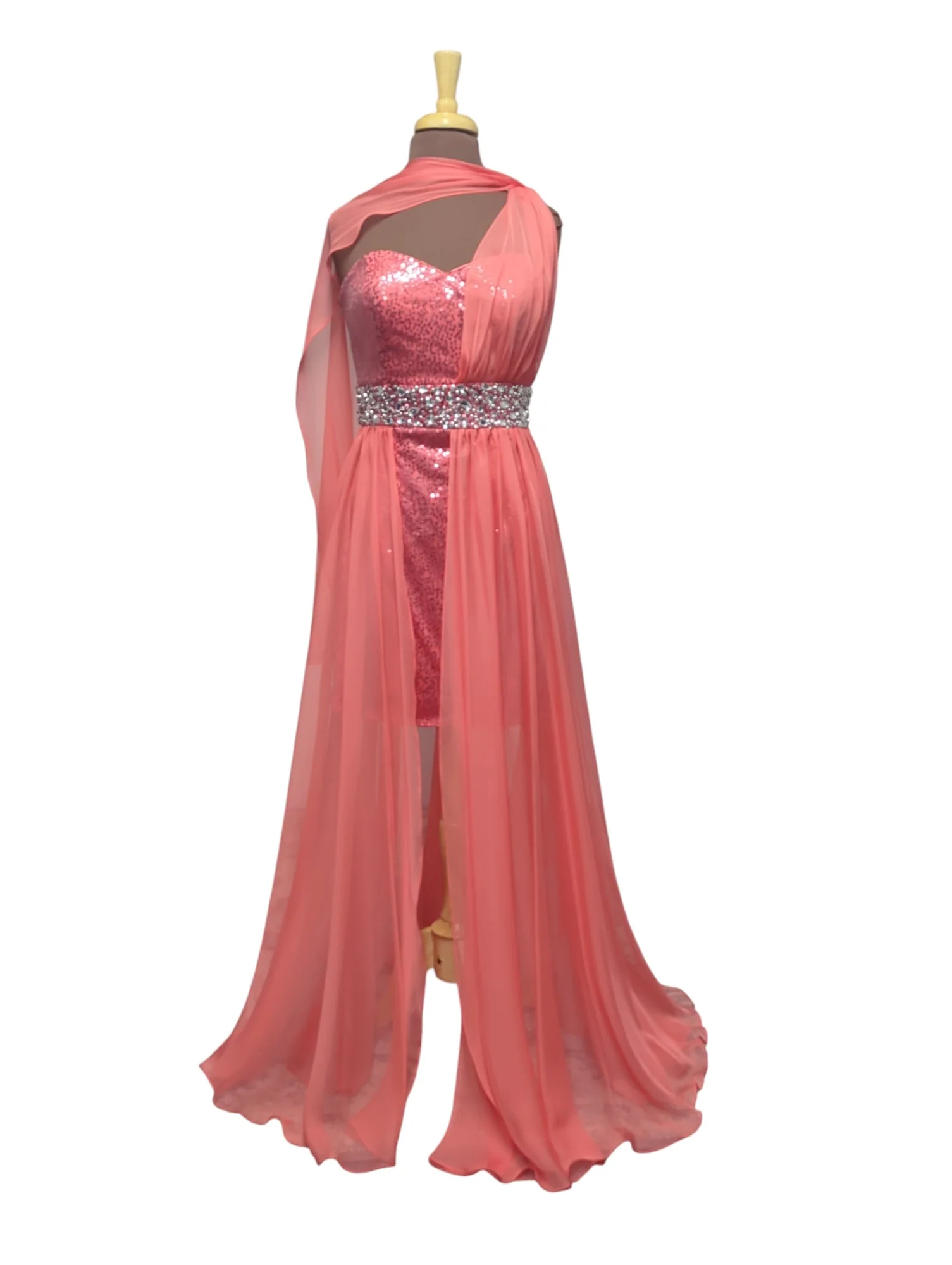 D’un magnifique rose corail lumineux, elle marie subtilement la brillance des sequins à la légèreté d’un voilage fluide pour un effet spectaculaire.