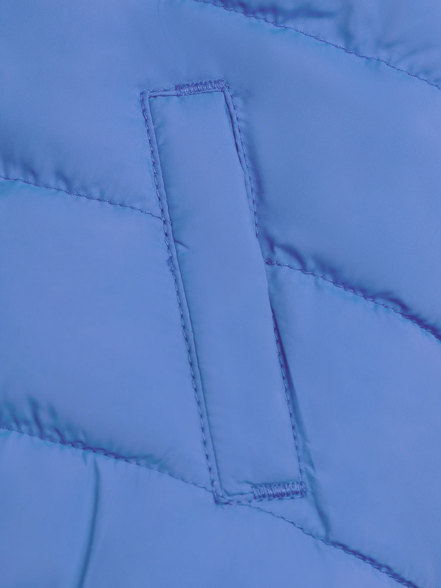 Cette doudoune sans manches beige et bleue accompagne les premières aventures de votre bébé pendant la mi-saison. Légère et matelassée, elle offre une chaleur douce et une grande liberté de mouvement. Confectionnée en polyester au touché soyeux, elle est agréable à porter dès le premier porté. Réversible, elle propose deux styles : une face beige avec imprimé « Skater Boy » et dinosaure pour un look ludique, et une face bleu indigo unie avec écusson en gomme pour une allure plus sobre. Sa fermeture zippée facilite l’habillage au quotidien.