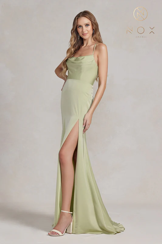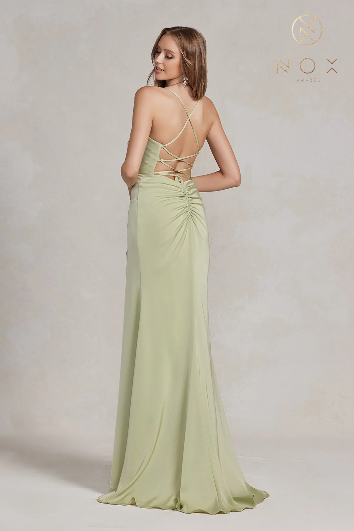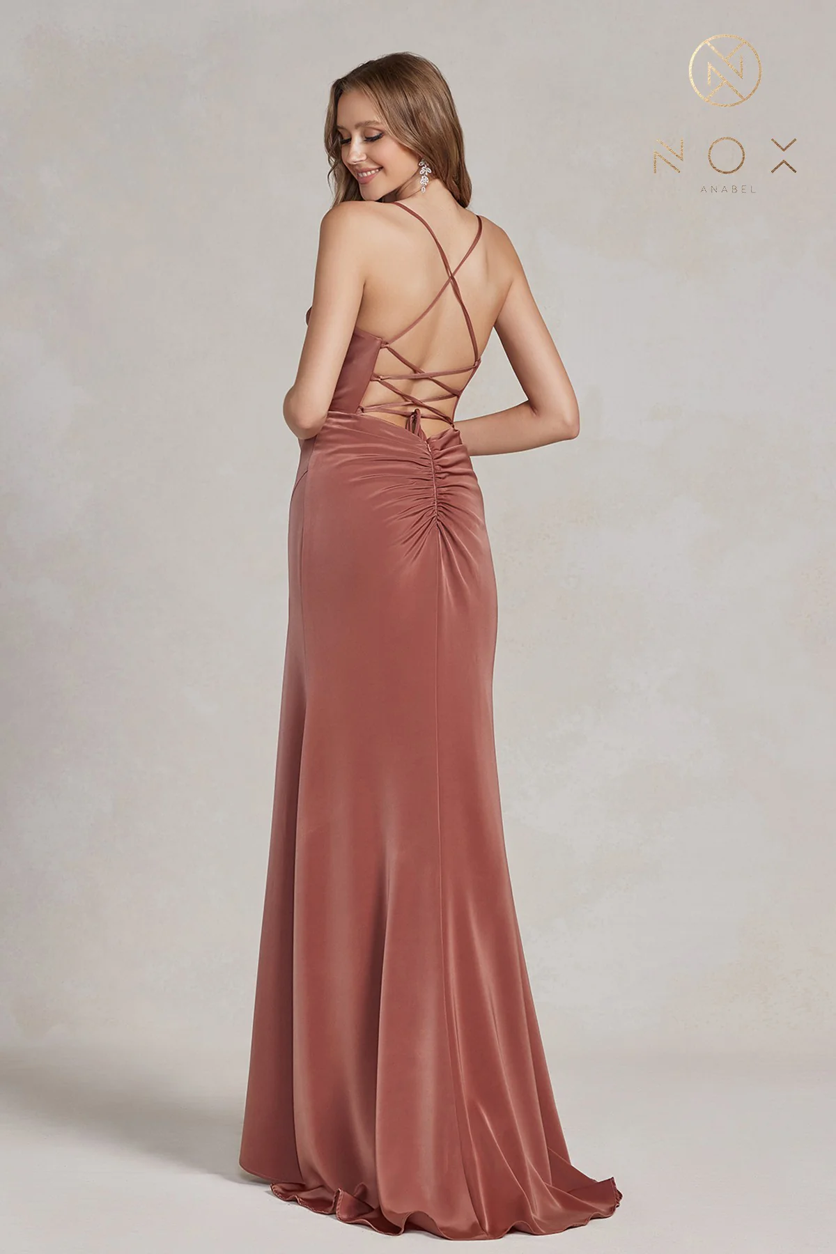robe ajusté satiné, ouvert au dos et lacé, longue fnete à l’avant |