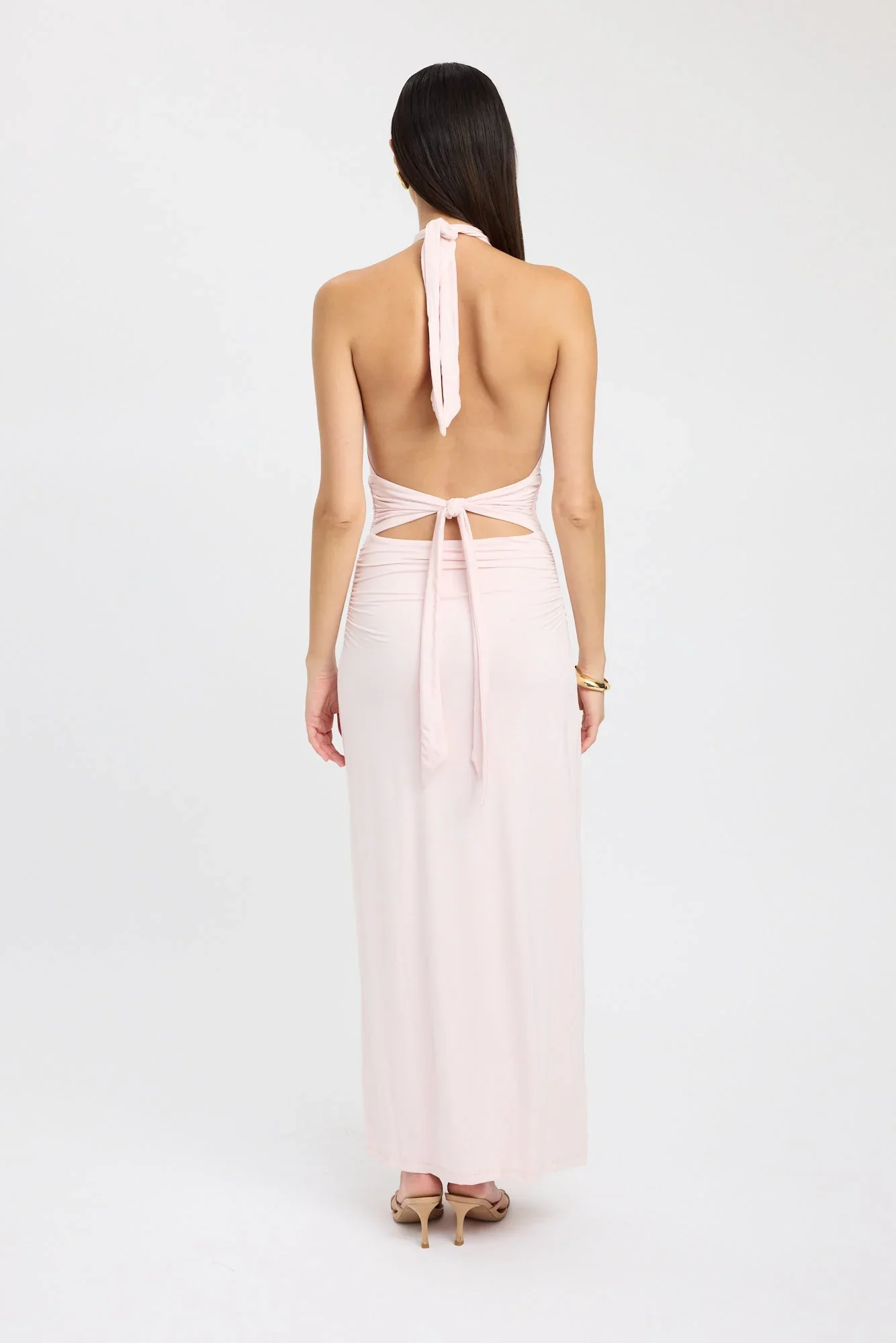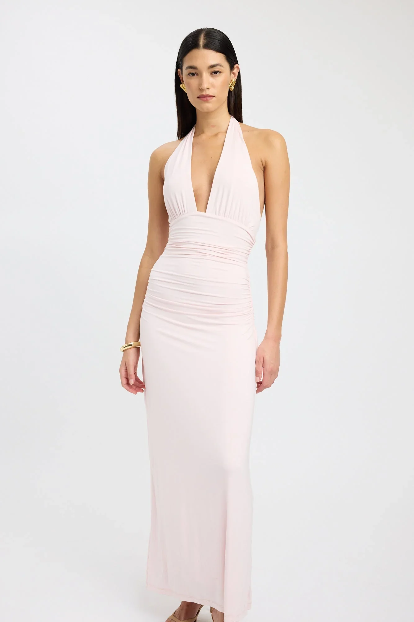 Une robe qui trace une ligne nette autour du corps, comme un trait d’encre sur la peau. Le décolleté plongeant dos-nu allonge le buste, tandis que les fronces à la taille sculptent la silhouette dans un jersey souple et dense. La jupe longue glisse jusqu’aux chevilles, fendue avec discrétion pour accompagner chaque pas. Une robe colonne, sensuelle et épurée, qui mise tout sur la ligne et l’allure.