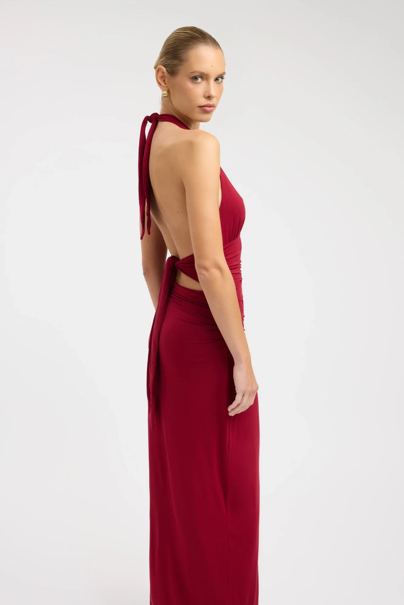 Une robe qui trace une ligne nette autour du corps, comme un trait d’encre sur la peau. Le décolleté plongeant dos-nu allonge le buste, tandis que les fronces à la taille sculptent la silhouette dans un jersey souple et dense. La jupe longue glisse jusqu’aux chevilles, fendue avec discrétion pour accompagner chaque pas. Une robe colonne, sensuelle et épurée, qui mise tout sur la ligne et l’allure.