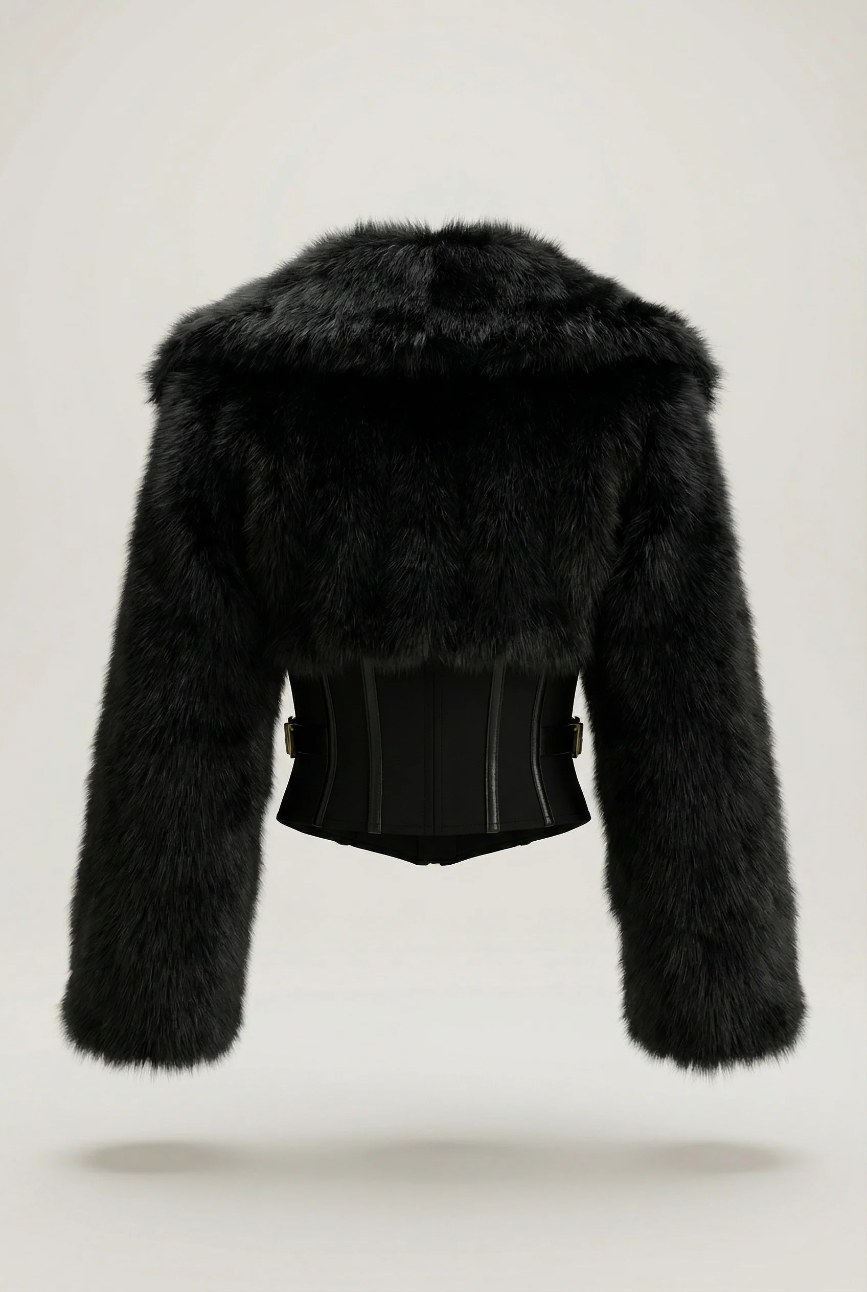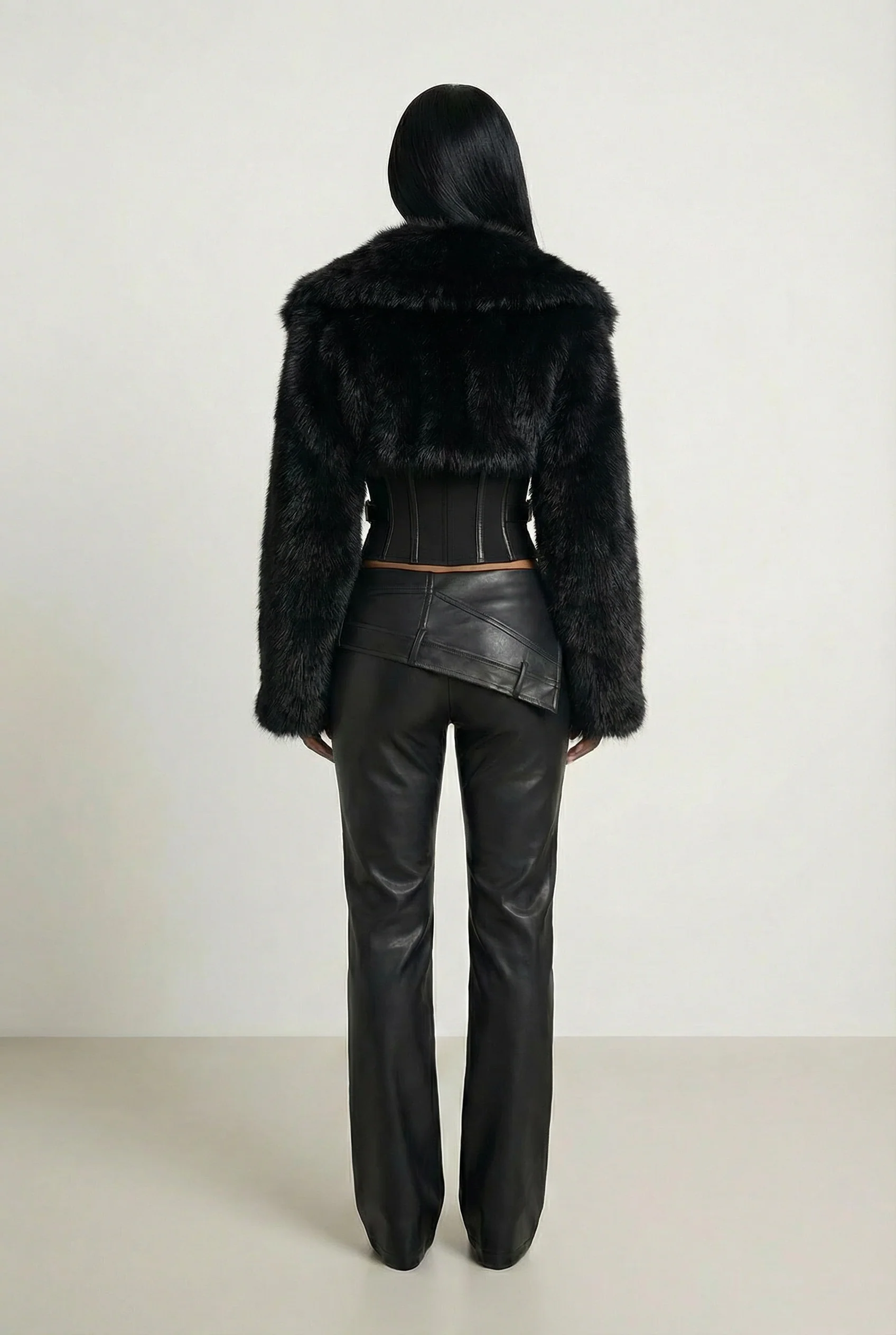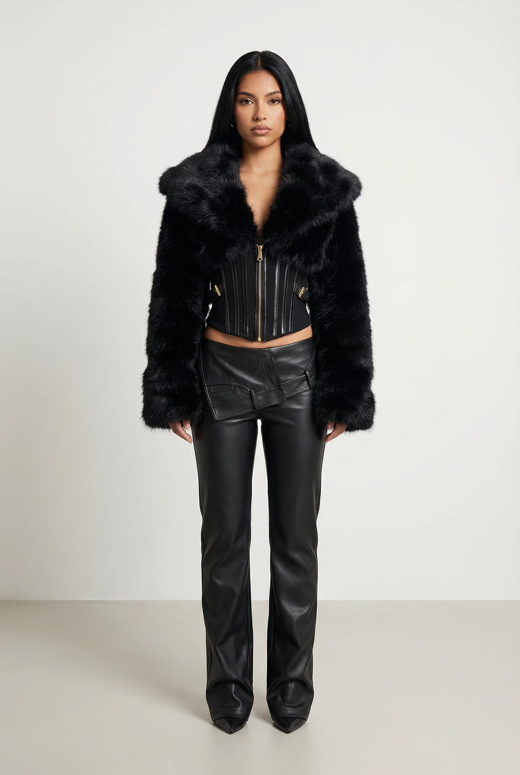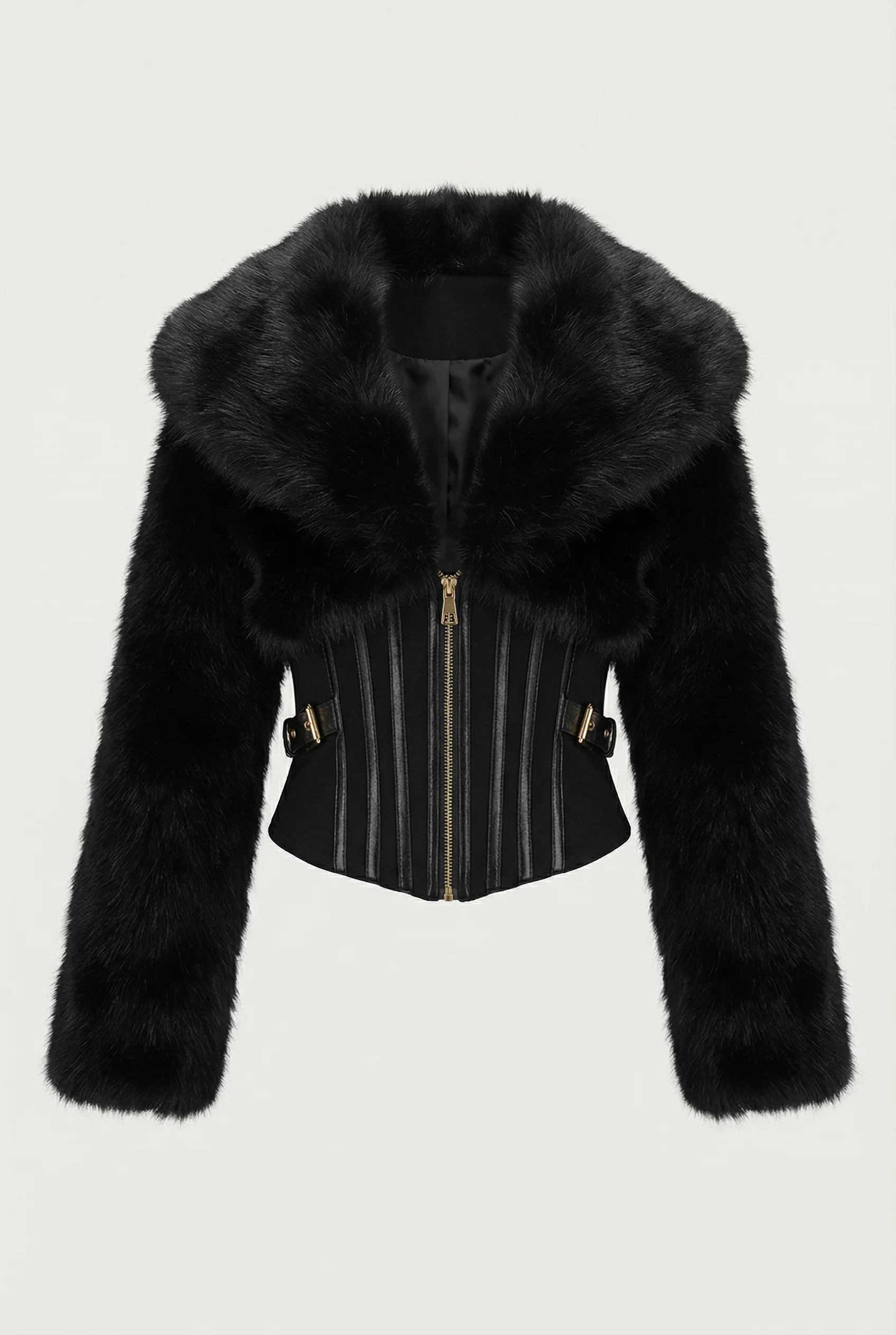Élisabeth signe une allure “Ladies in Paris” immédiate. Une veste courte, pensée comme une pièce de caractère : col enveloppant au volume généreux, manches longues, et taille structurée esprit corset qui dessine la silhouette avec précision. La fermeture zippée apporte une ligne nette et moderne, facile à porter ouverte ou fermée selon l’effet recherché. La longueur courte équilibre parfaitement les proportions et met en valeur les tailles hautes. Le rendu visuel joue sur le contraste entre la matière effet fourrure et la structure plus graphique au buste. Une pièce qui transforme une tenue simple en look travaillé, sans effort.