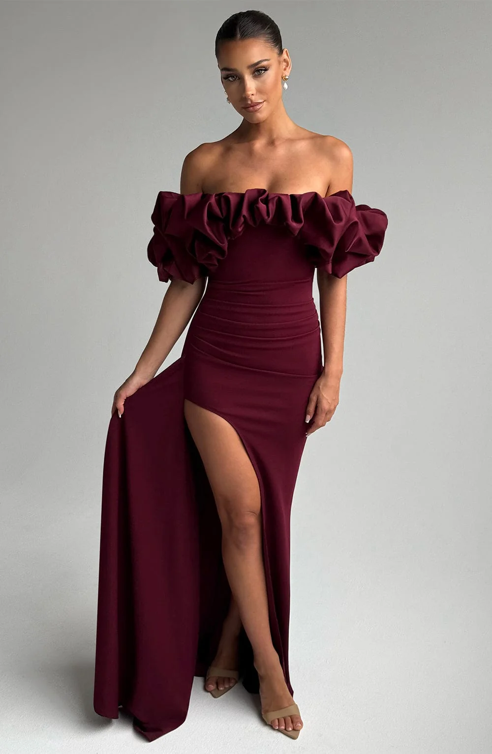Affirmez votre style avec la robe longue Elsie en Cherry Lacquer, un mélange saisissant d’élégance et de drame. Confectionnée en crêpe stretch luxueux, cette robe moulante met en valeur la silhouette avec un décolleté bardot accrocheur orné d’un volant volumineux en tissu contrastant pour une touche de glamour. Les plis asymétriques à la taille subliment vos courbes, tandis qu’une audacieuse fente drapée jusqu’à la cuisse ajoute une note de séduction.