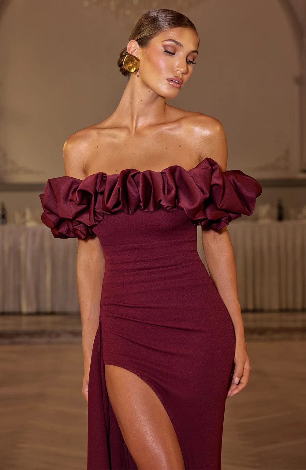 - Fente drapée jusqu’à la cuisse