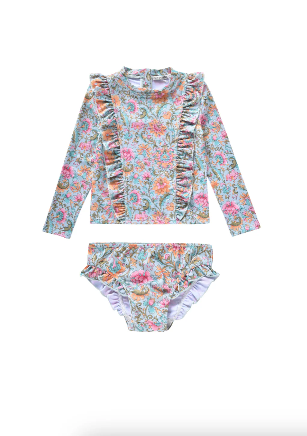 Haut manches longues et culotte assortie, voici la version deux pièces du maillot de bain Aurélie. Un ensemble aussi pratique que coquet ! Cet été, on n’oublie pas de se tartiner de crème solaire, de rester à l’ombre et de s’amuser au bord de Bucolia River !