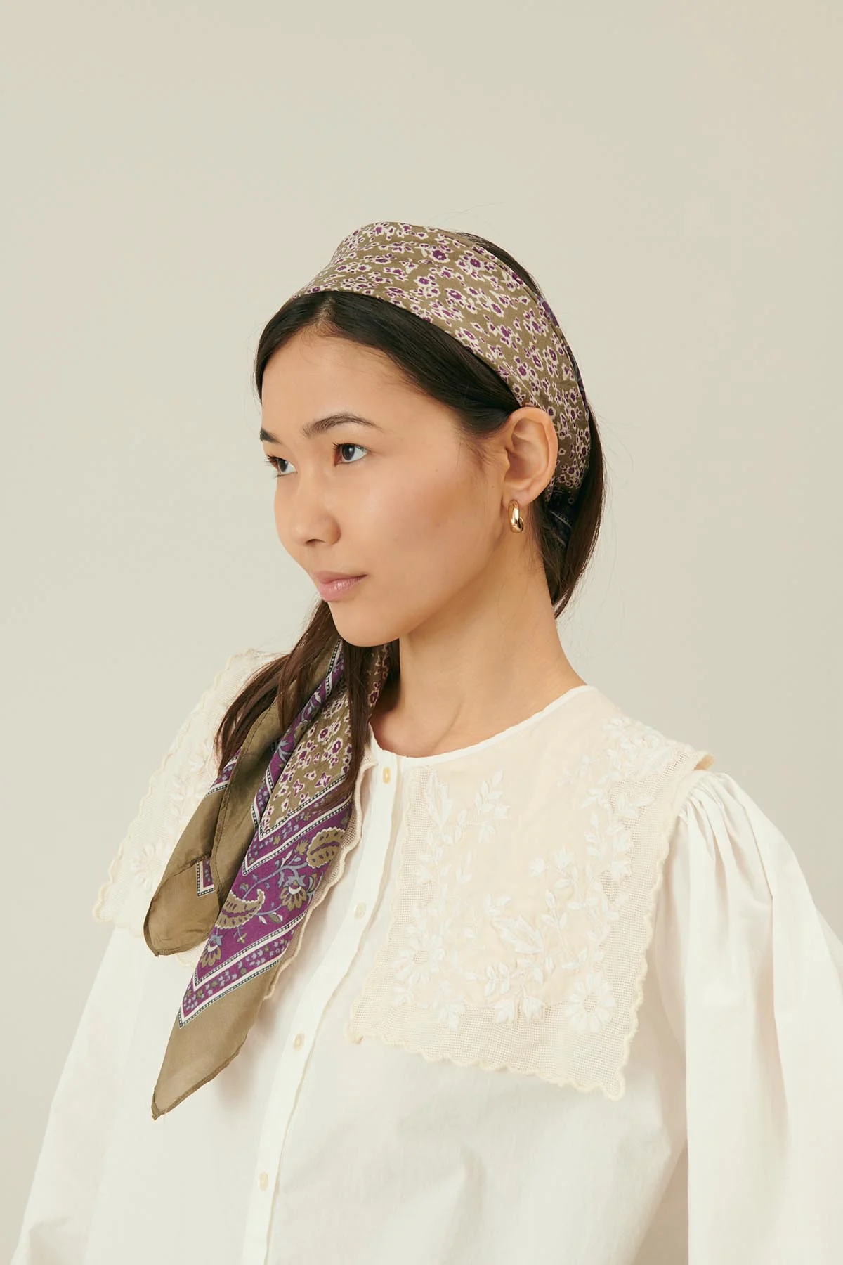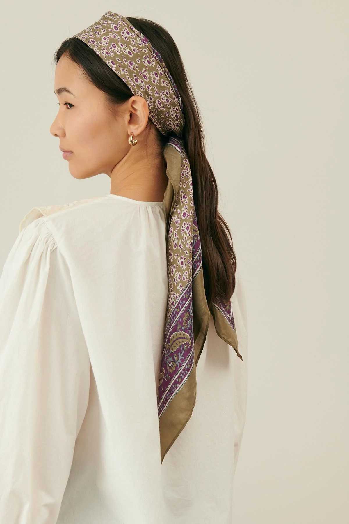 En bandana, autour du cou, sur les épaules, dans les cheveux, accroché à son sac, en ceinture… Romy viendra se superposer à toutes vos tenues, avec la douceur unique de la soie, pour un esprit définitivement poétique.