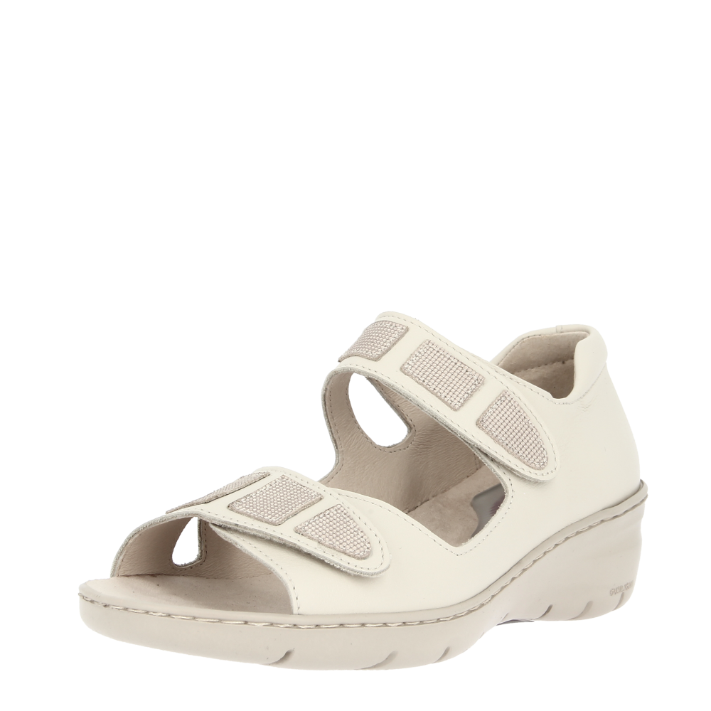 Alliant un cuir nubuck beige et un cuir lisse à motif ton sur ton sur les lanières, le coloris BEIGE vous offre douceur et élégance.