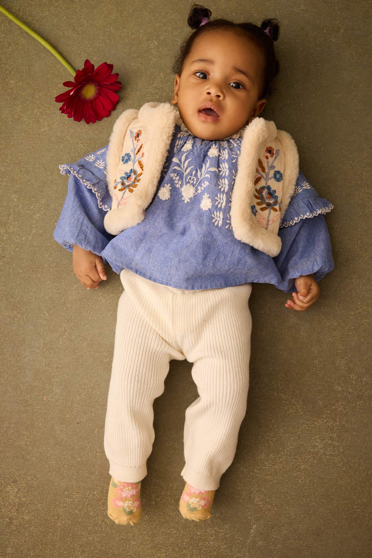 - Une face en gaze de coton brodée, et une face en fausse fourrure toute douce.