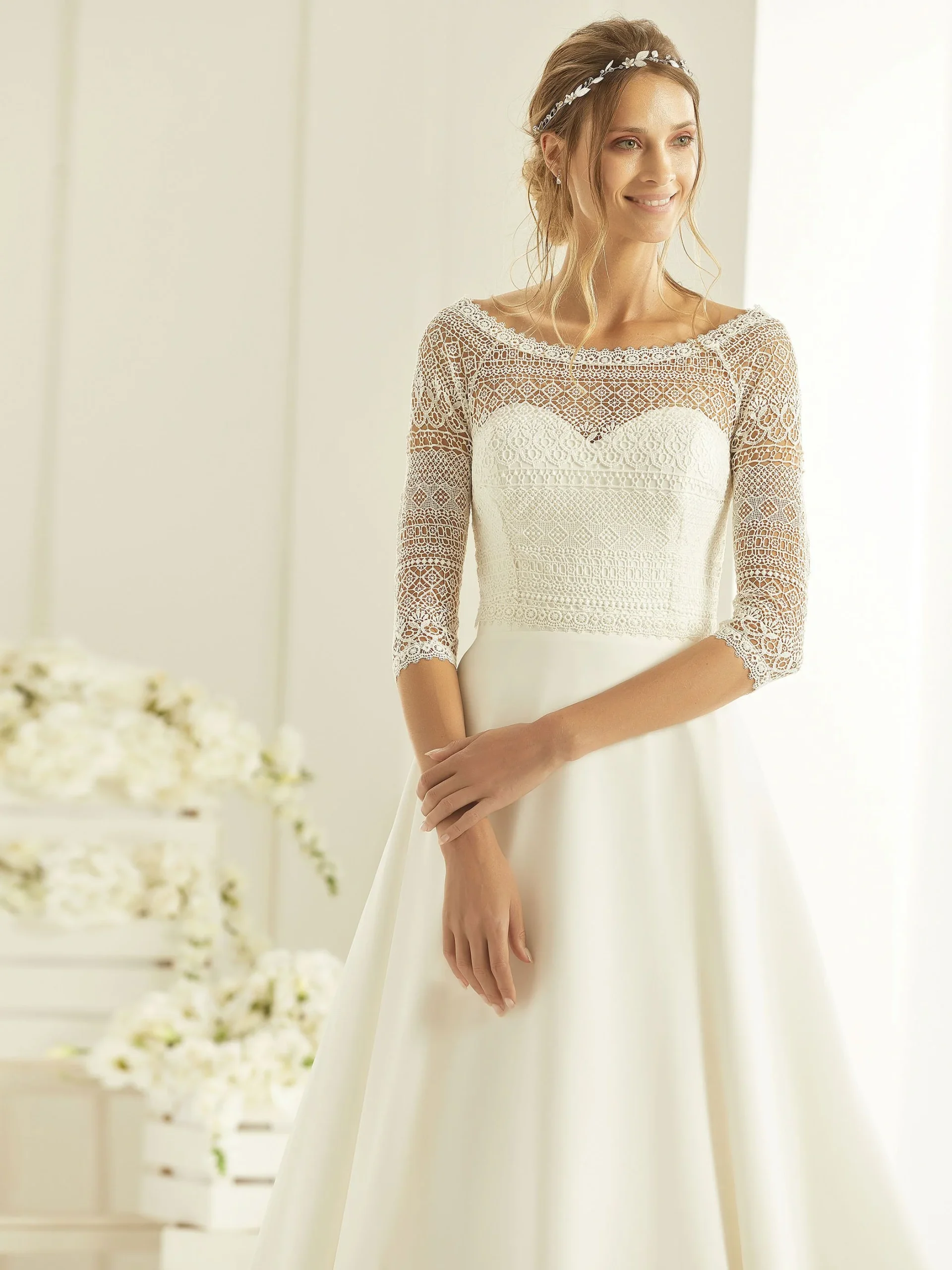 Description: La robe de mariage Harmonia offre un ajustement A-ligne, un décolleté en coeur et une ceinture en satin pour une allure classique et distinguée. Elle est faite d’un chiffon de haute qualité et est complétée par une traîne pour parfaire votre look de mariée. |