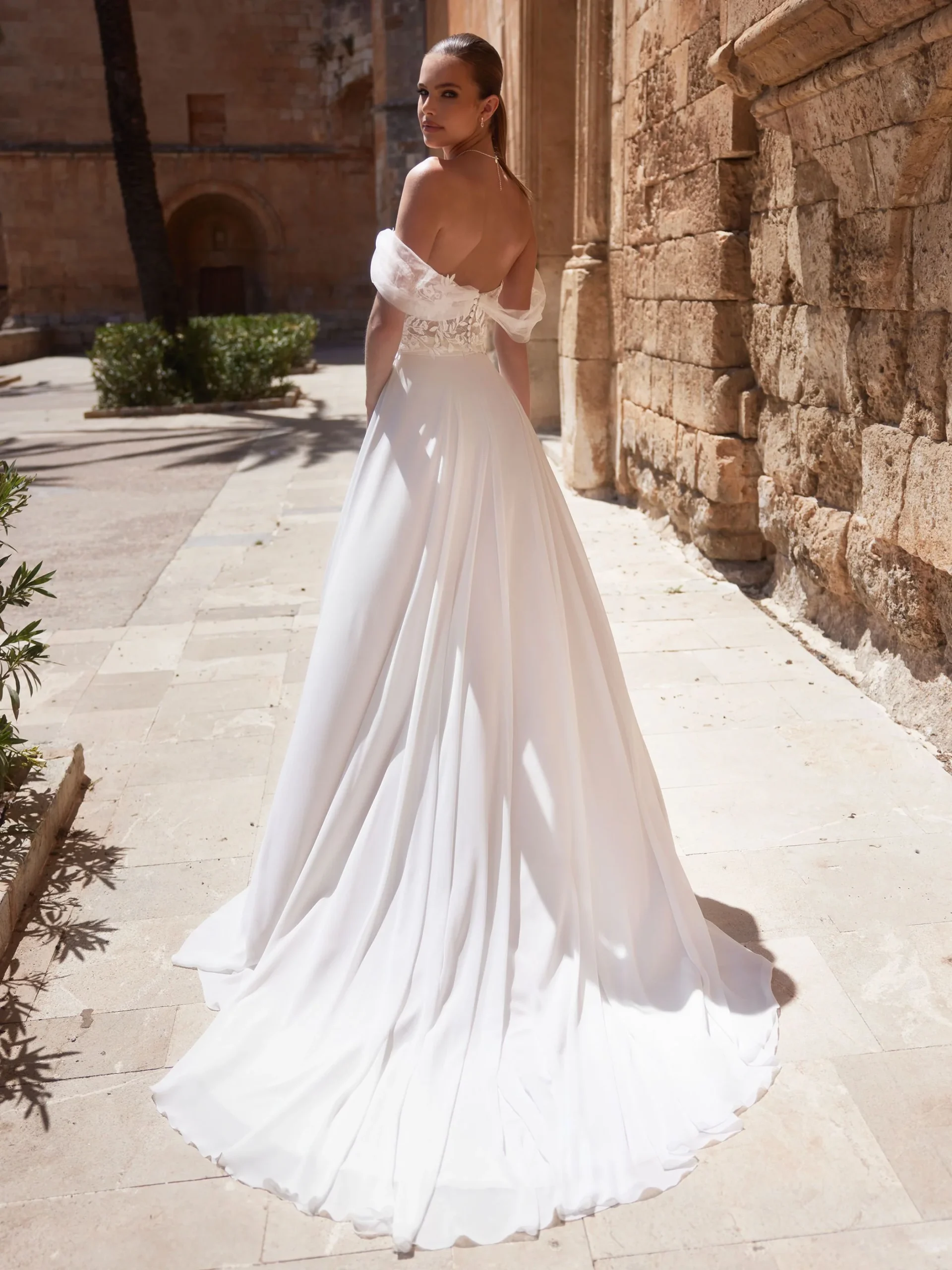 Élégante et aérienne, la jupe de mariée Raisa sublime la silhouette avec sa coupe fluide et romantique. Confectionnée en mousseline légère, elle se distingue par son tombé raffiné et son mouvement naturel à chaque pas. Sa taille haute souligne la finesse du buste, tandis que la longue traîne apporte une touche majestueuse et intemporelle.
