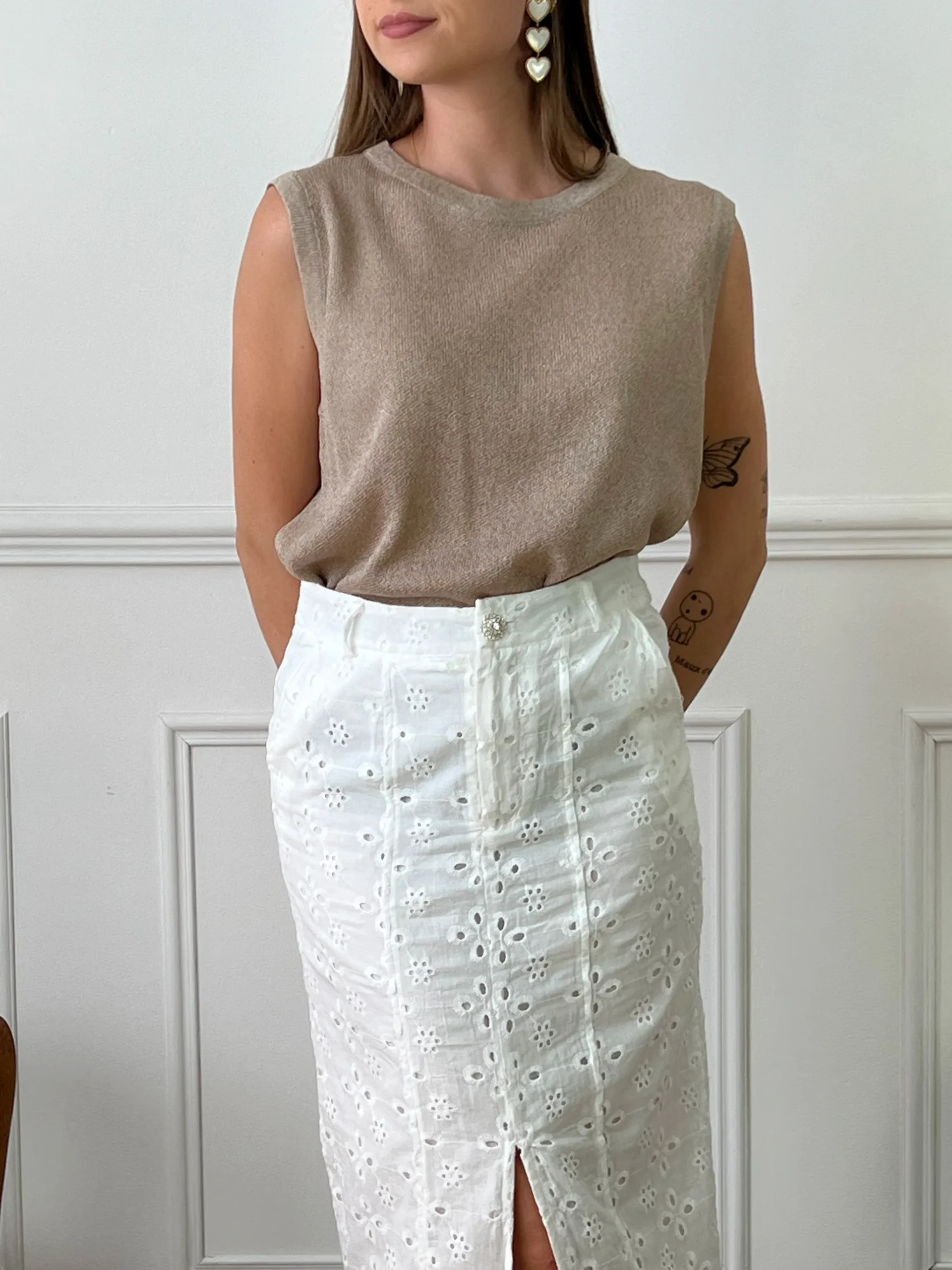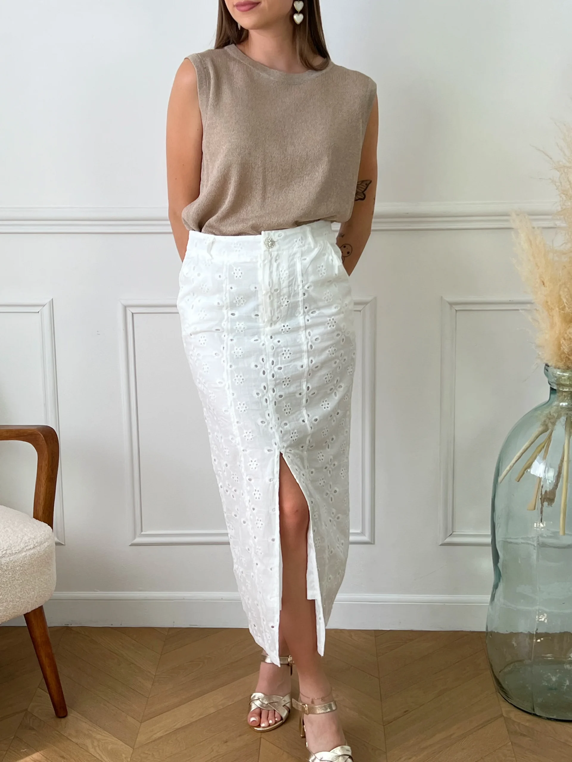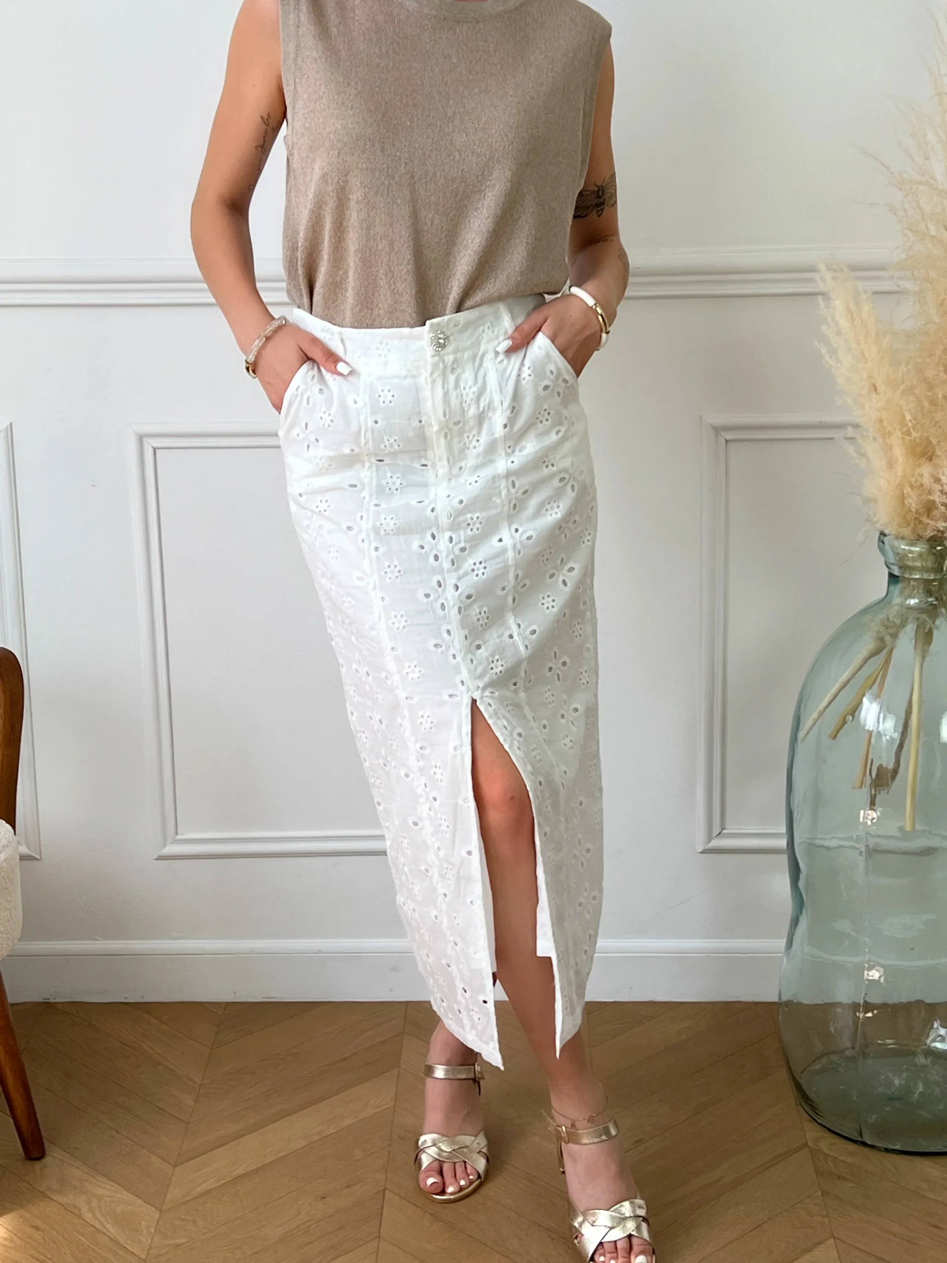 Jupe longue blanche en broderie femme