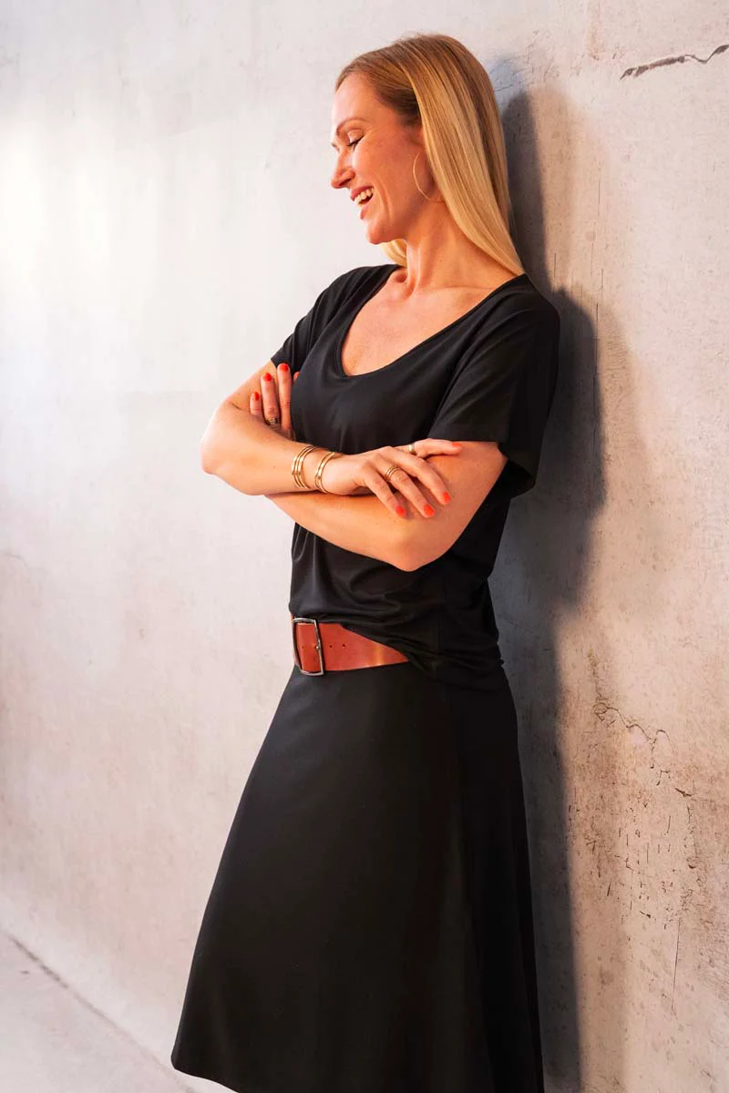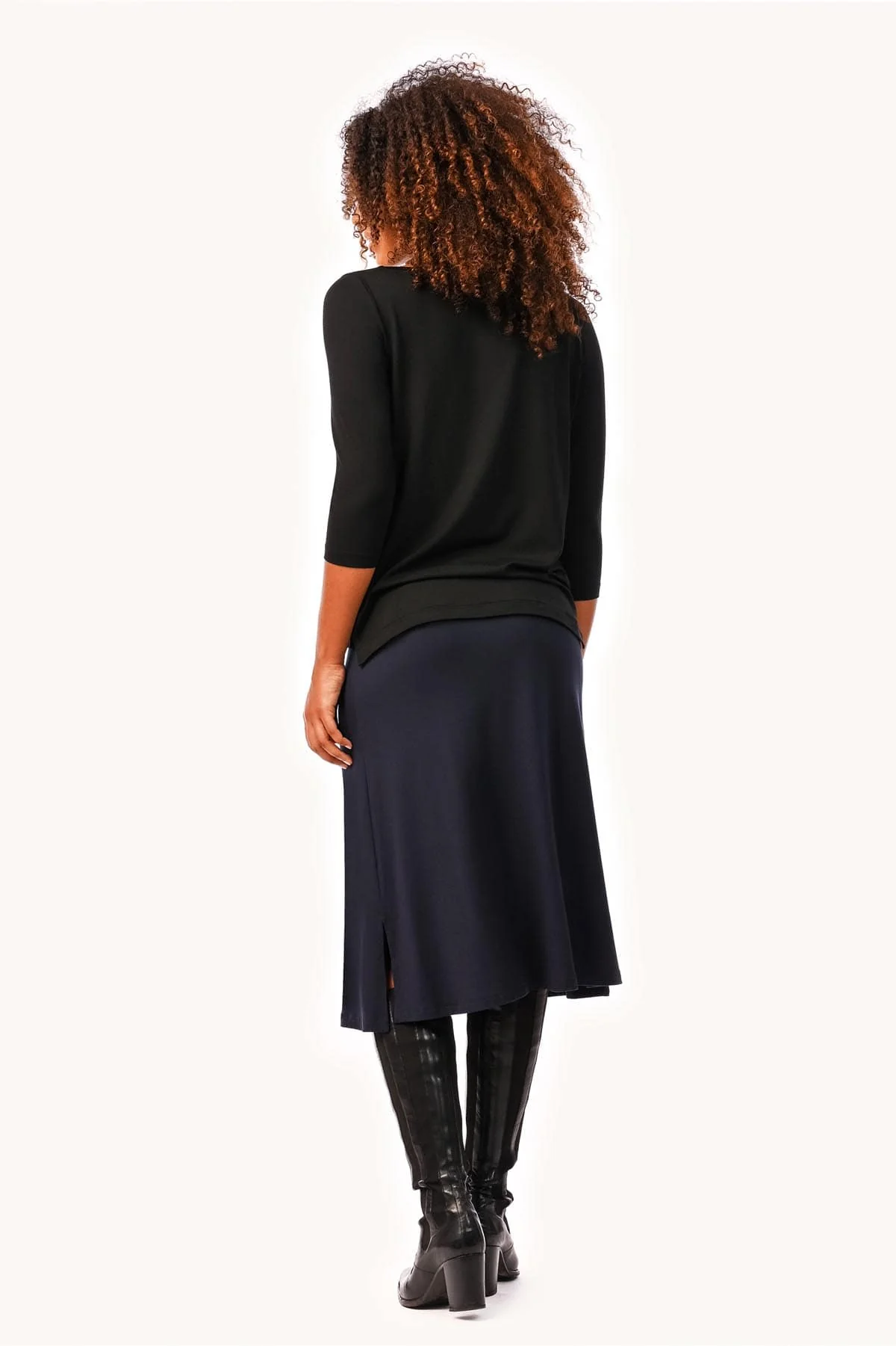 Jupe midi trapèze très confortable grâce à sa composition à base de 92% pulpe de bois de hêtre (micromodal – Fils Lenzing) – Confection 100% made in France – Matières certifiées Oeko-Tex.