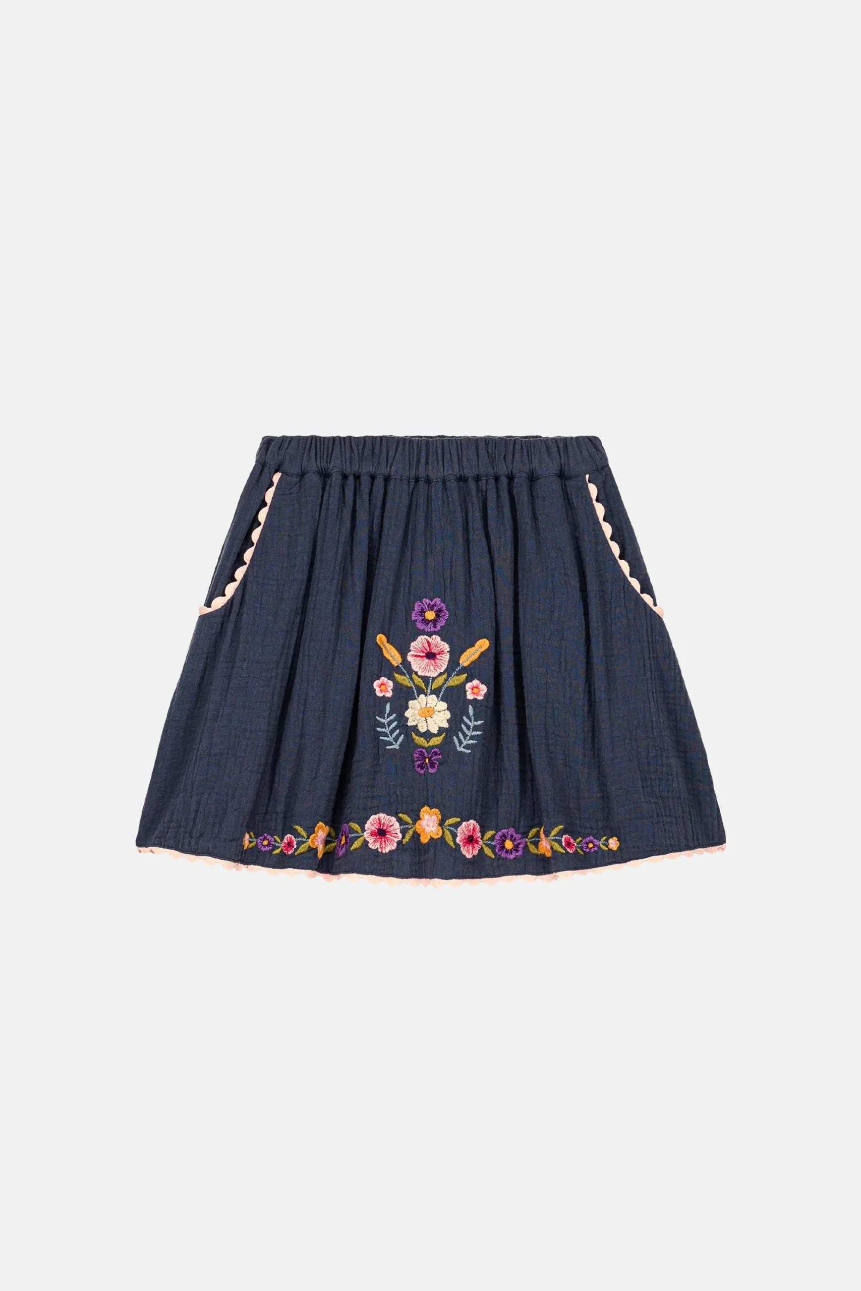 - Motif fleuri brodé devant et frise fleurie brodée en bas de vêtement.